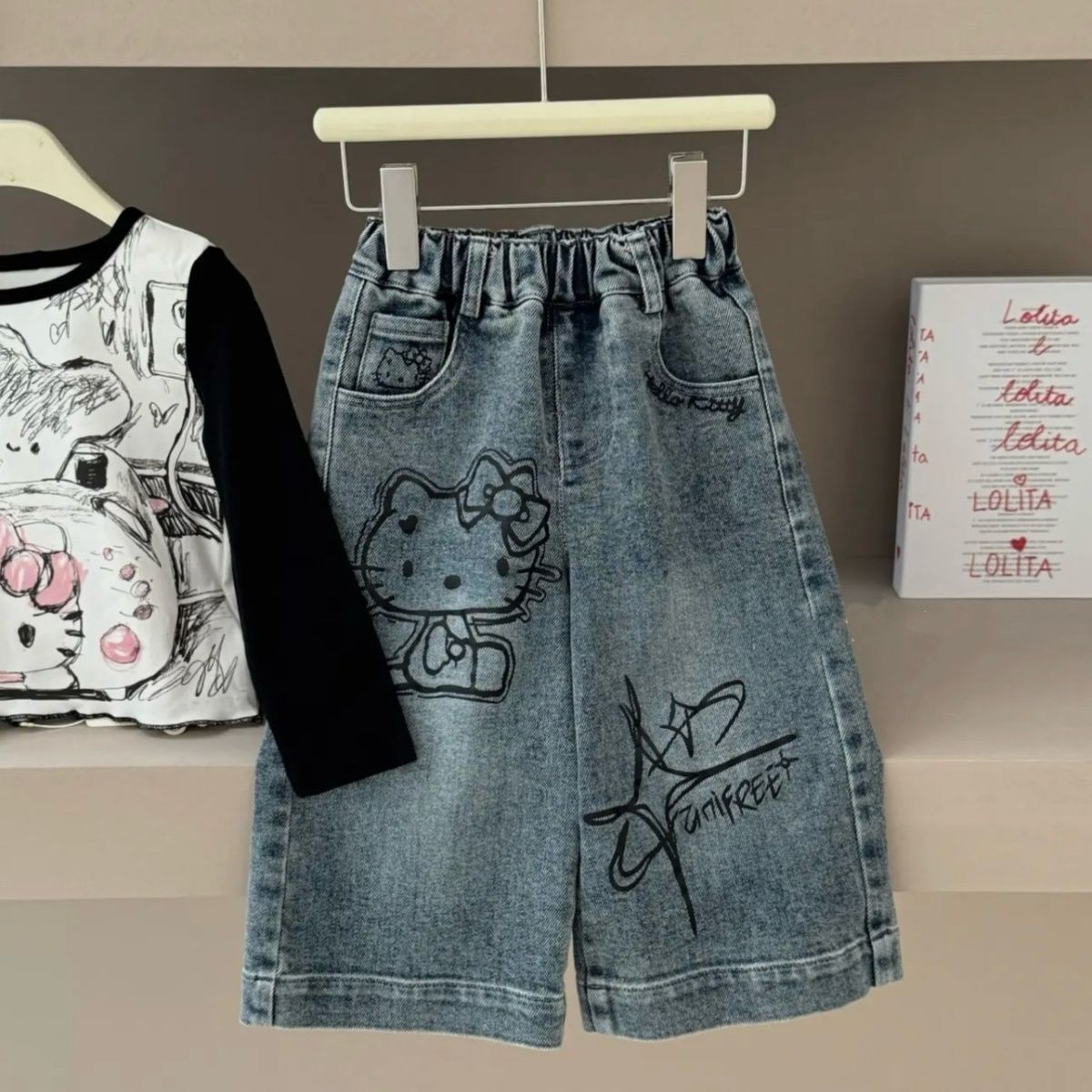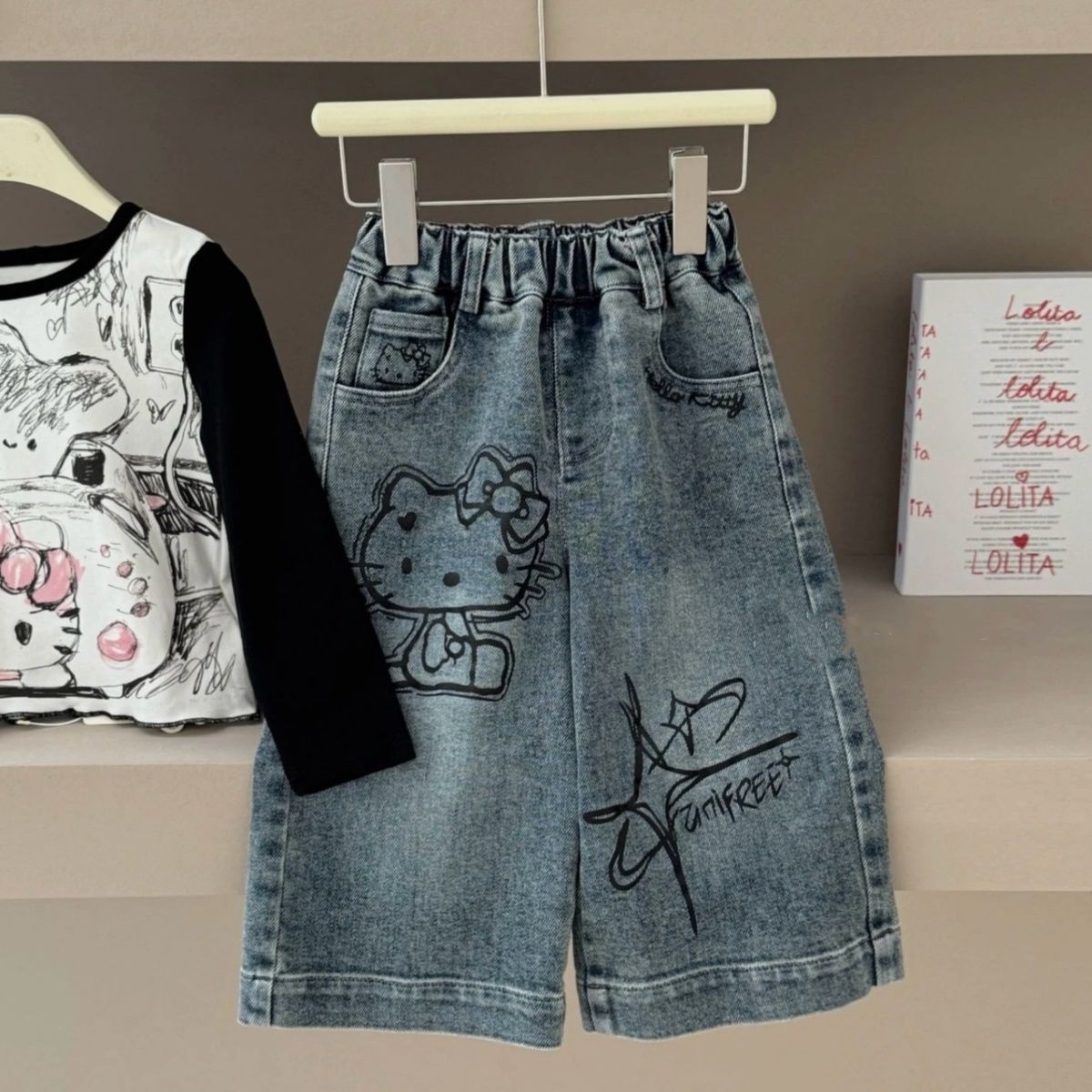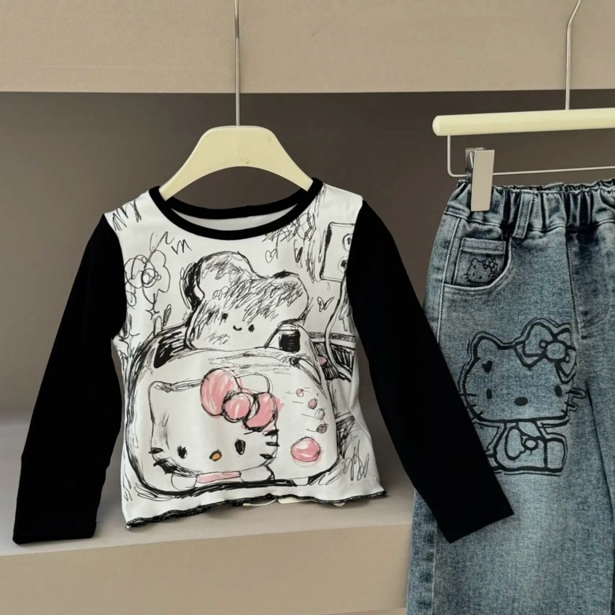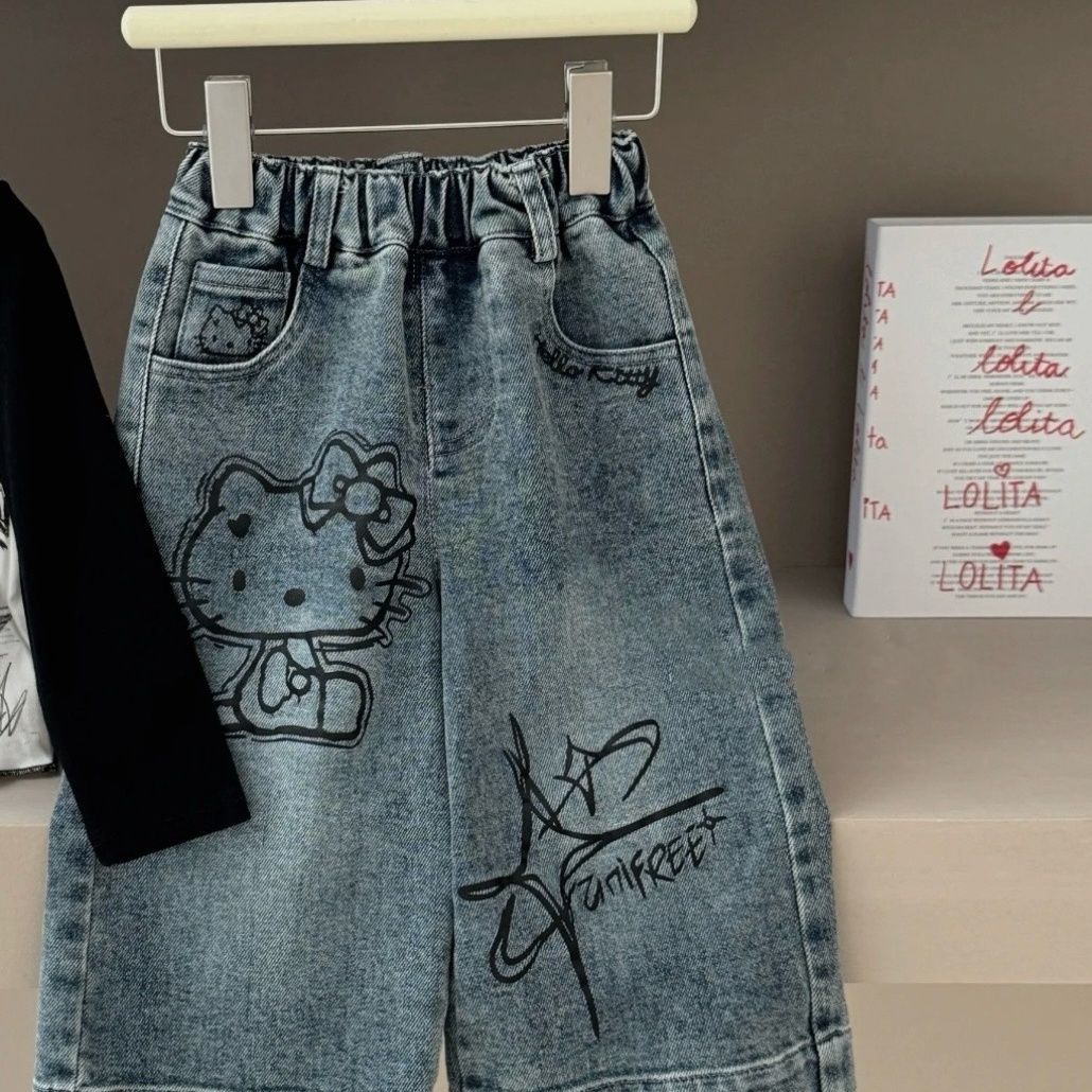 여자 2025 가을 새로운 스타일 스트레이트 와이드 레그 팬츠 아기 만화 고양이 프린트 긴팔 티셔츠 세트 한국어스토어 가기