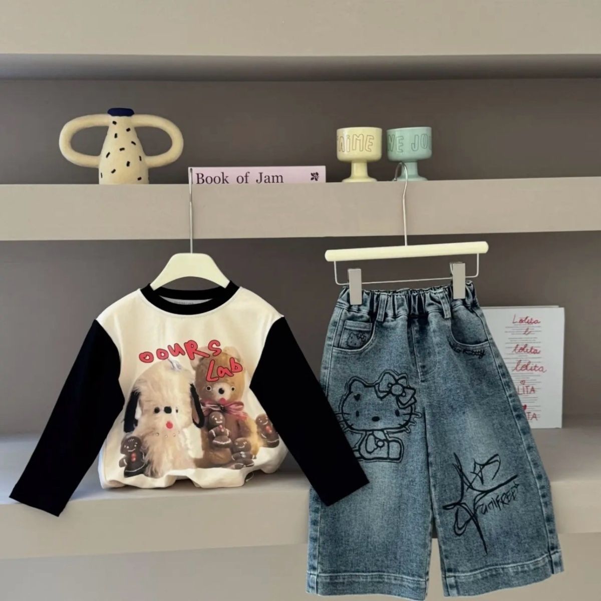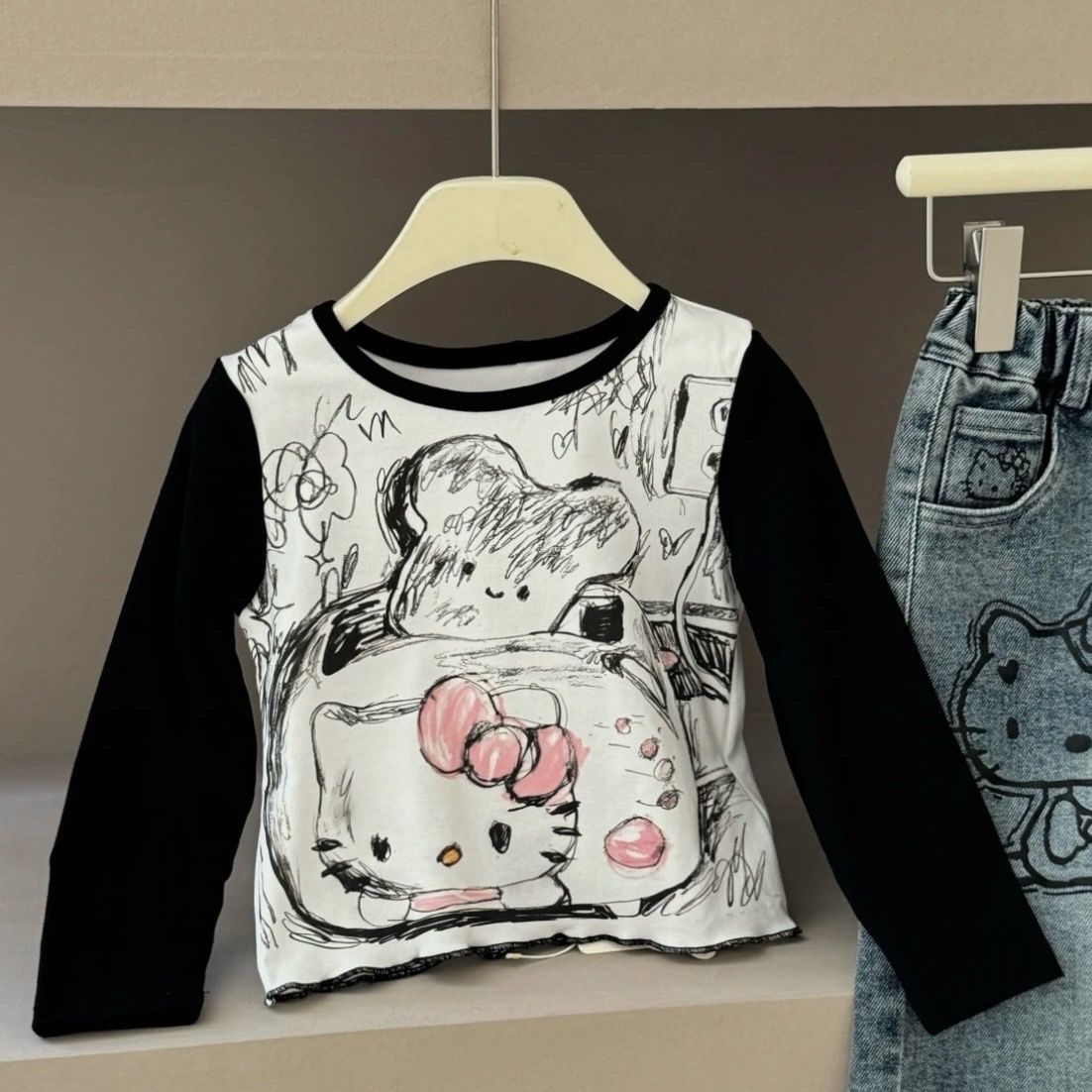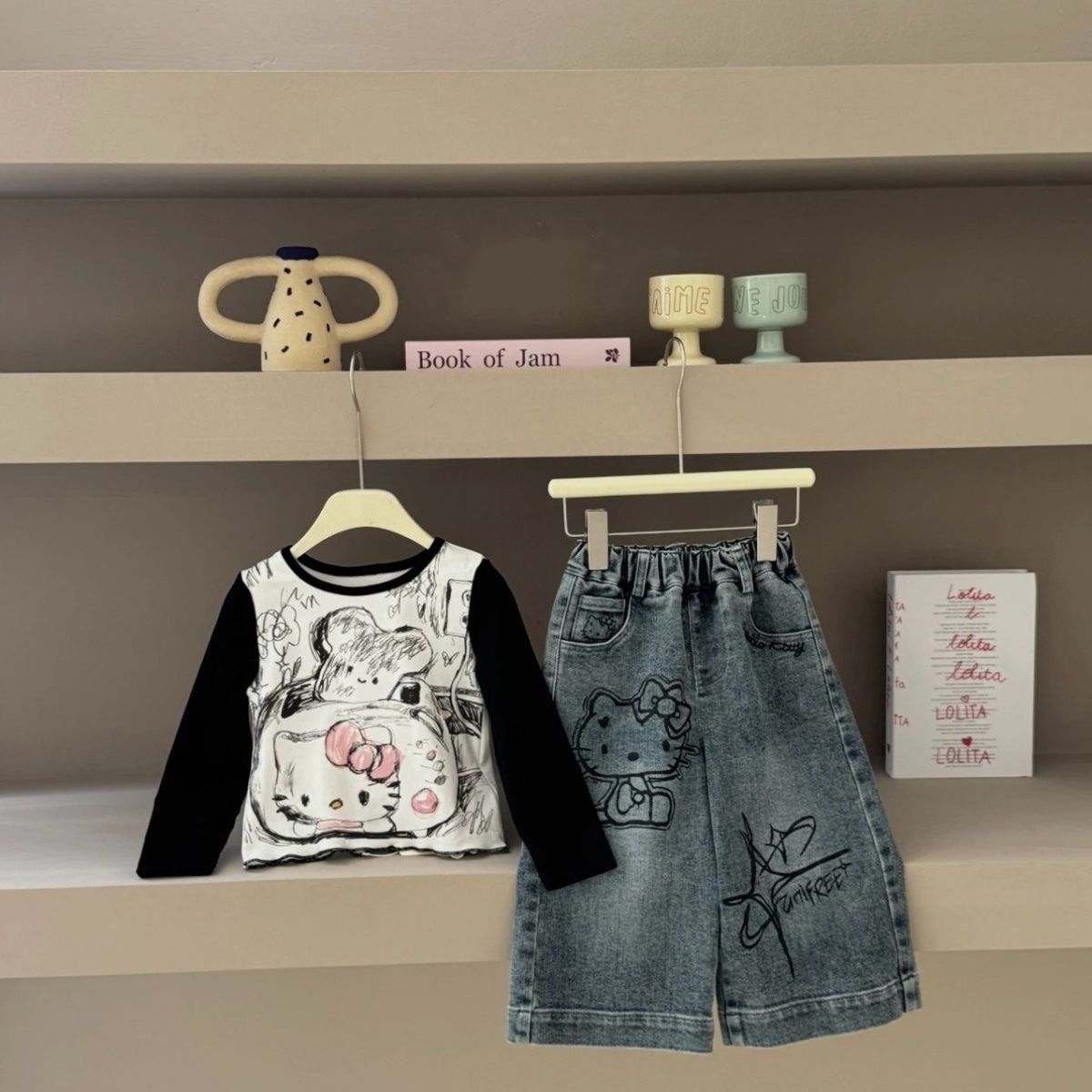 여자 2025 가을 새로운 스타일 스트레이트 와이드 레그 팬츠 아기 만화 고양이 프린트 긴팔 티셔츠 세트 한국어스토어 가기