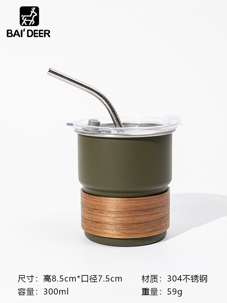 • 육군 녹색 물컵 + 나무 커버 + 뚜껑 + 빨대