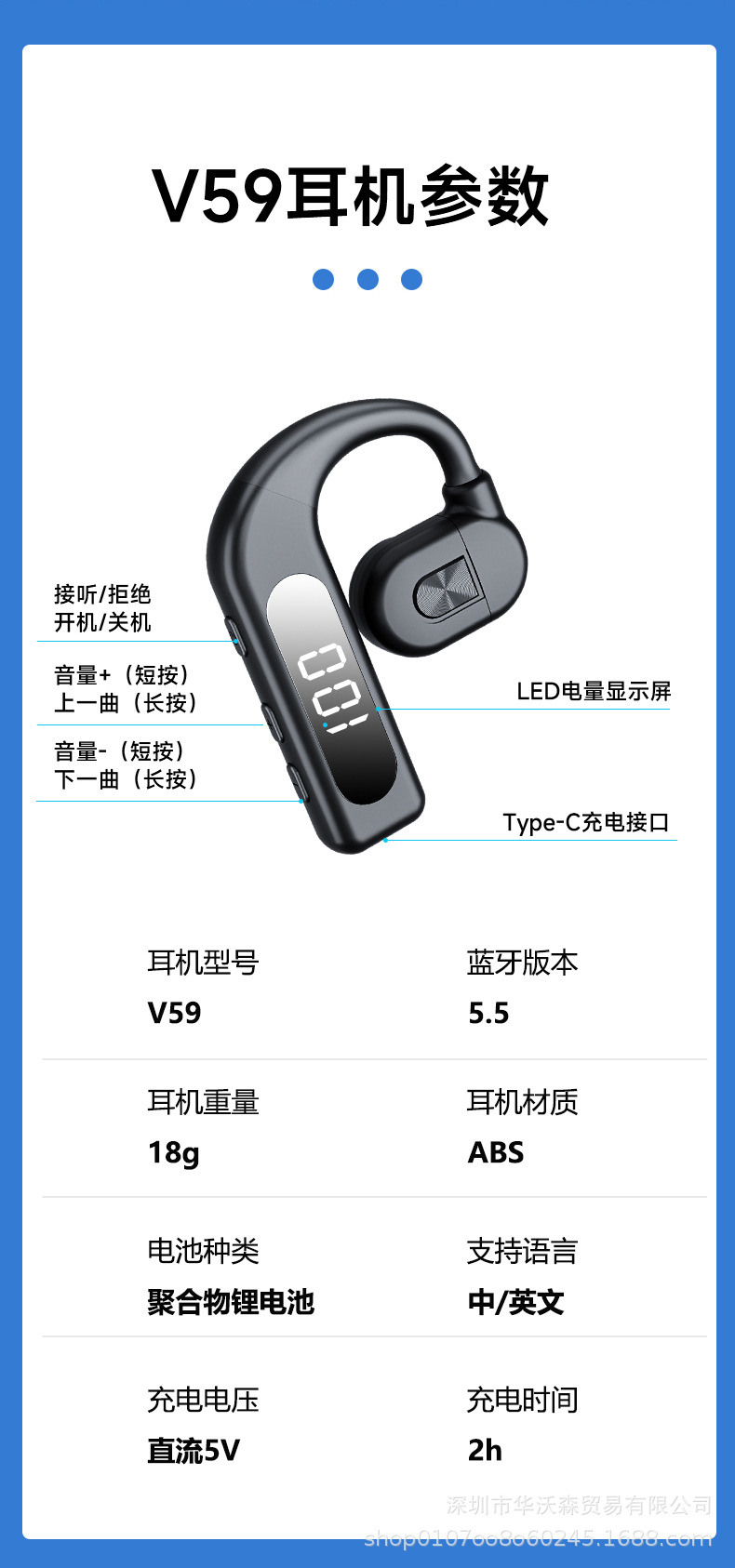 새로운 국경 V59 헤드셋이 아닌 귀 무선 블루투스 헤드셋 큰 전원 긴 내구성 단일 귀 비즈니스 디지털 디스플레이
