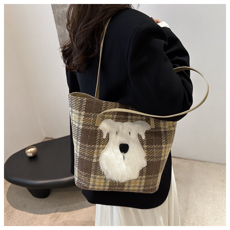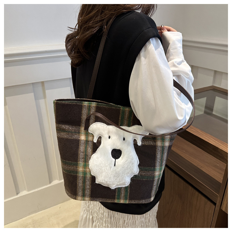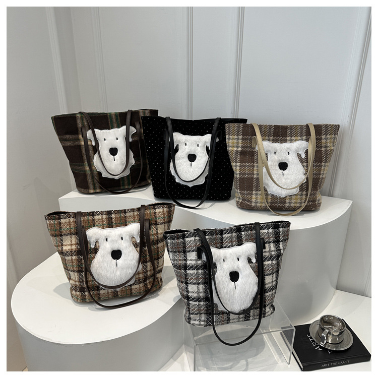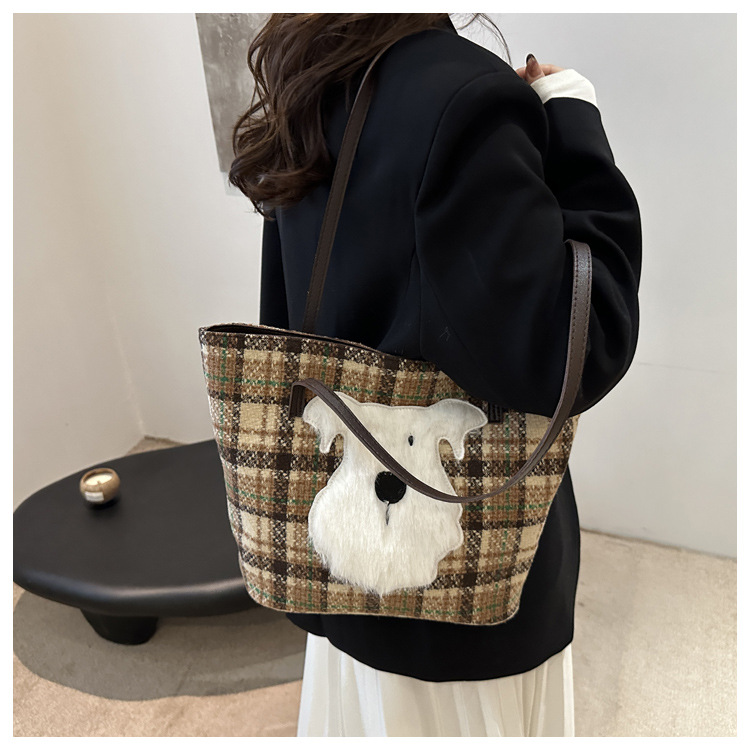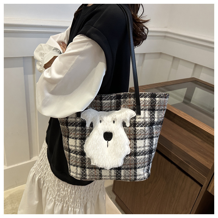 2025 봄 신상 모직 대형 가방 여성용 트렌디 학생 핸드백 캐주얼 대용량 체크무늬 숄더 토트백