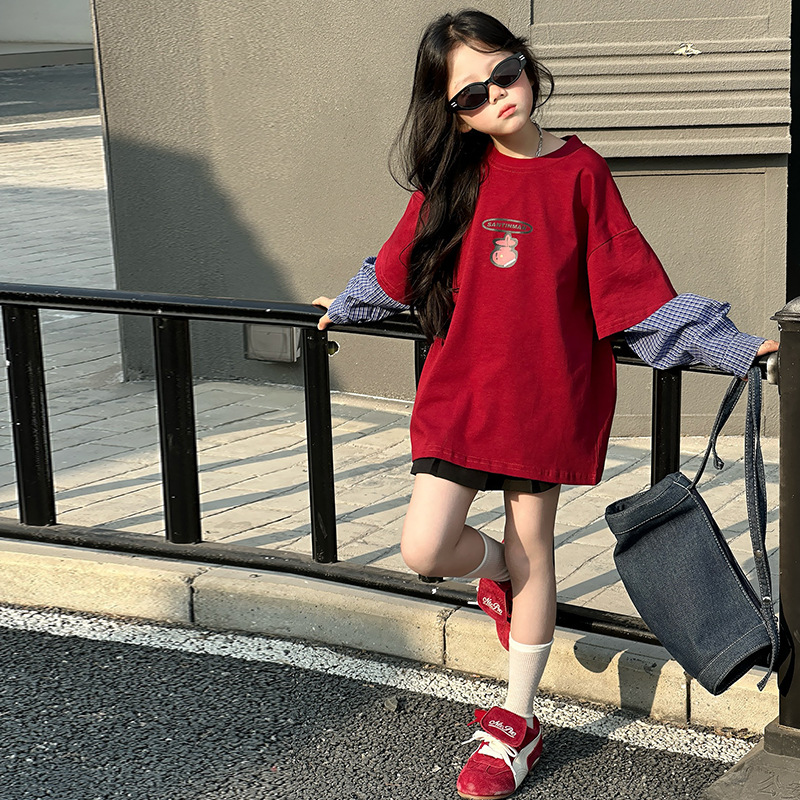 소녀 긴팔 티셔츠 봄과 가을 2025 새로운 어린이 봄 원피스 기지 셔츠 빅 보이 걸스 가짜 투피스 탑 T 트렌디