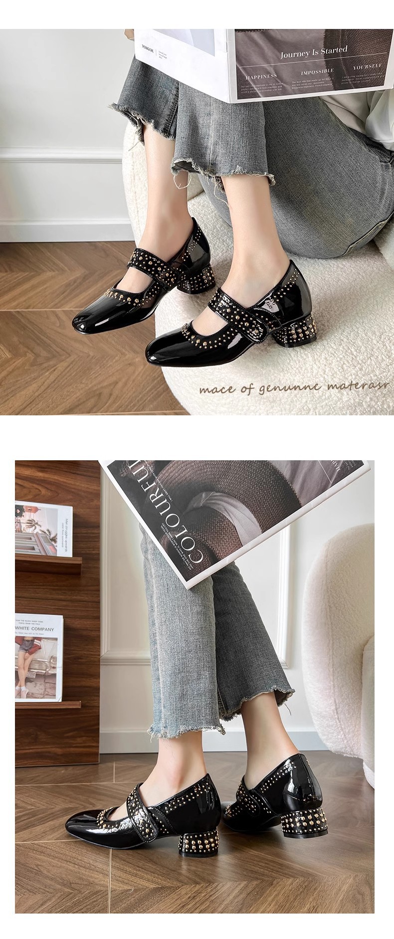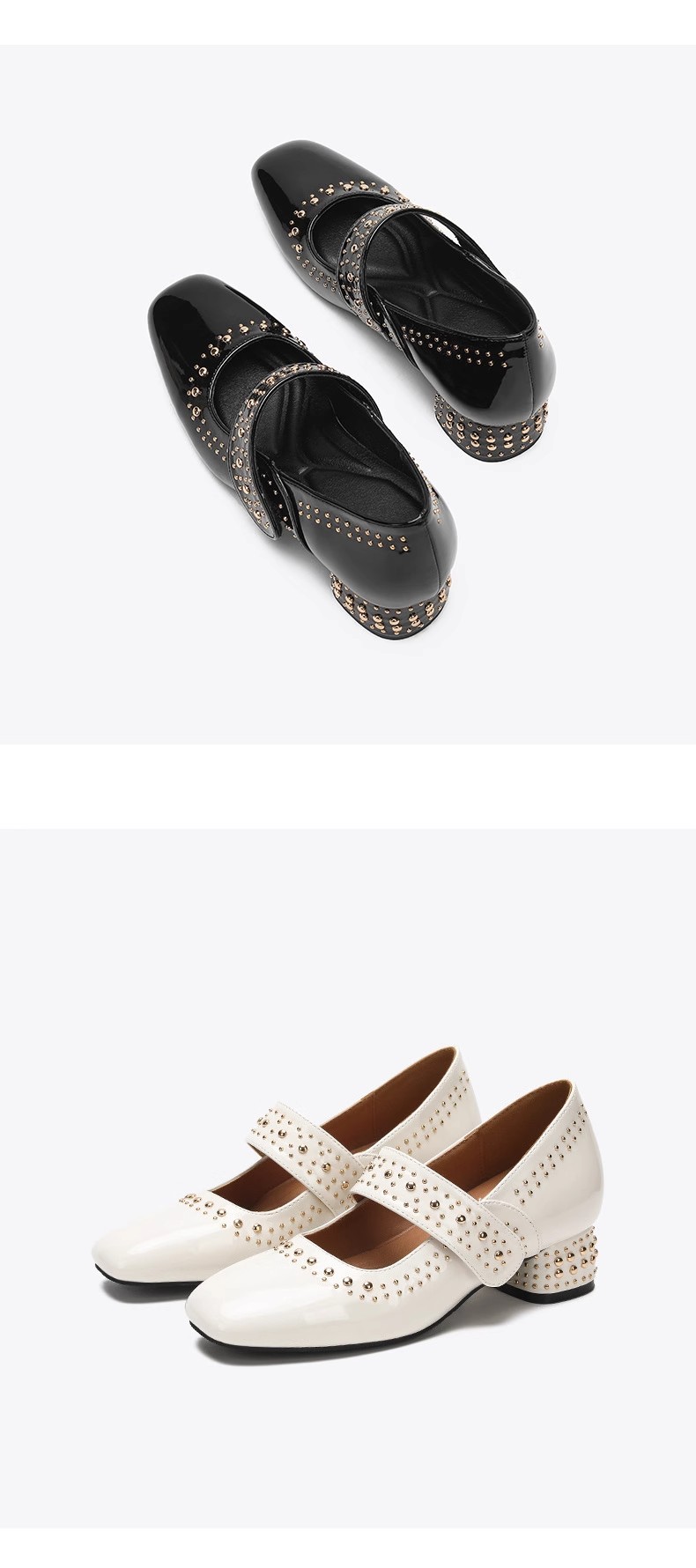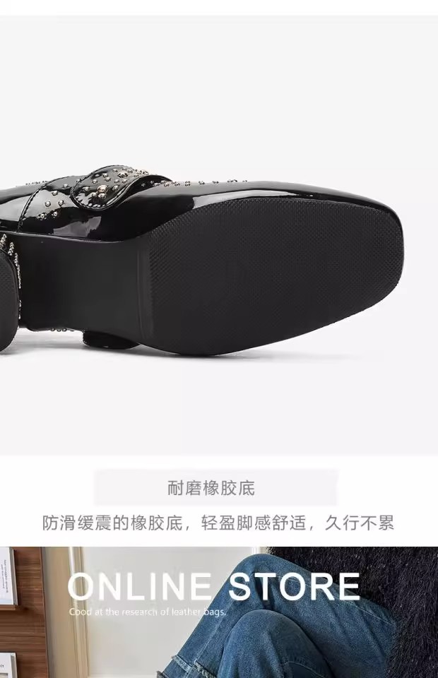 재고 새로운 스퀘어 헤드 리벳 한 단어 라이딩 나이츠 두꺼운 힐 신발 여성용 화이트 우아한 메리 제인 신발 하이힐