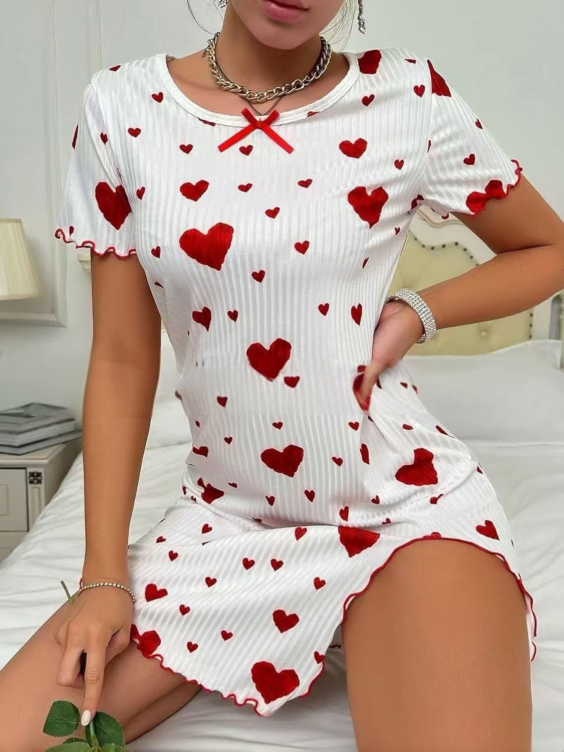 유럽과 미국의 사랑 원피스 나이트 드레스 반팔 국경 구덩이 인쇄 활 느슨한 여성 나이트 드레스 귀여운 달콤한