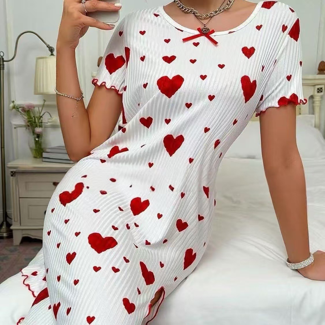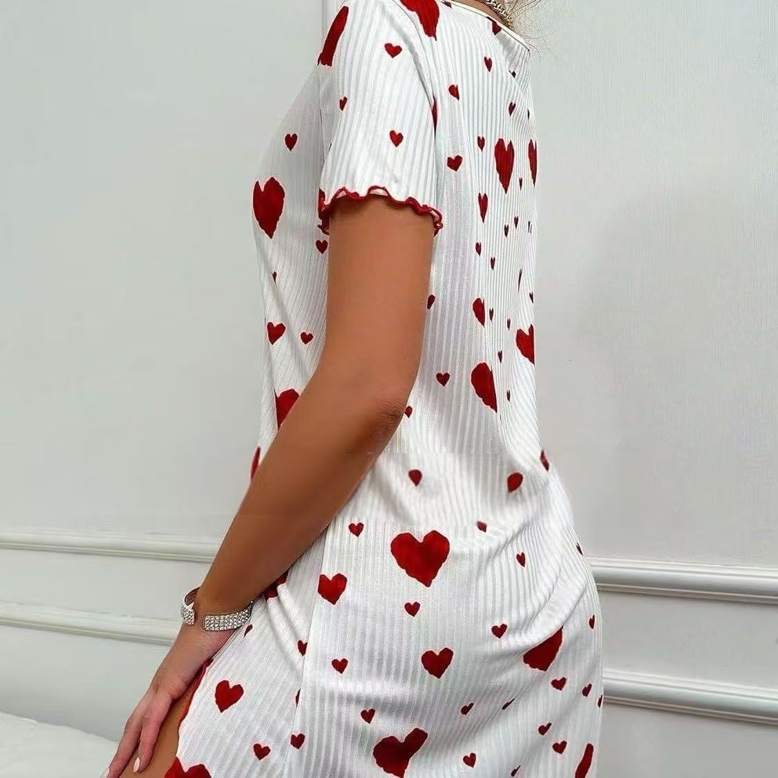 유럽과 미국의 사랑 원피스 나이트 드레스 반팔 국경 구덩이 인쇄 활 느슨한 여성 나이트 드레스 귀여운 달콤한스토어 가기