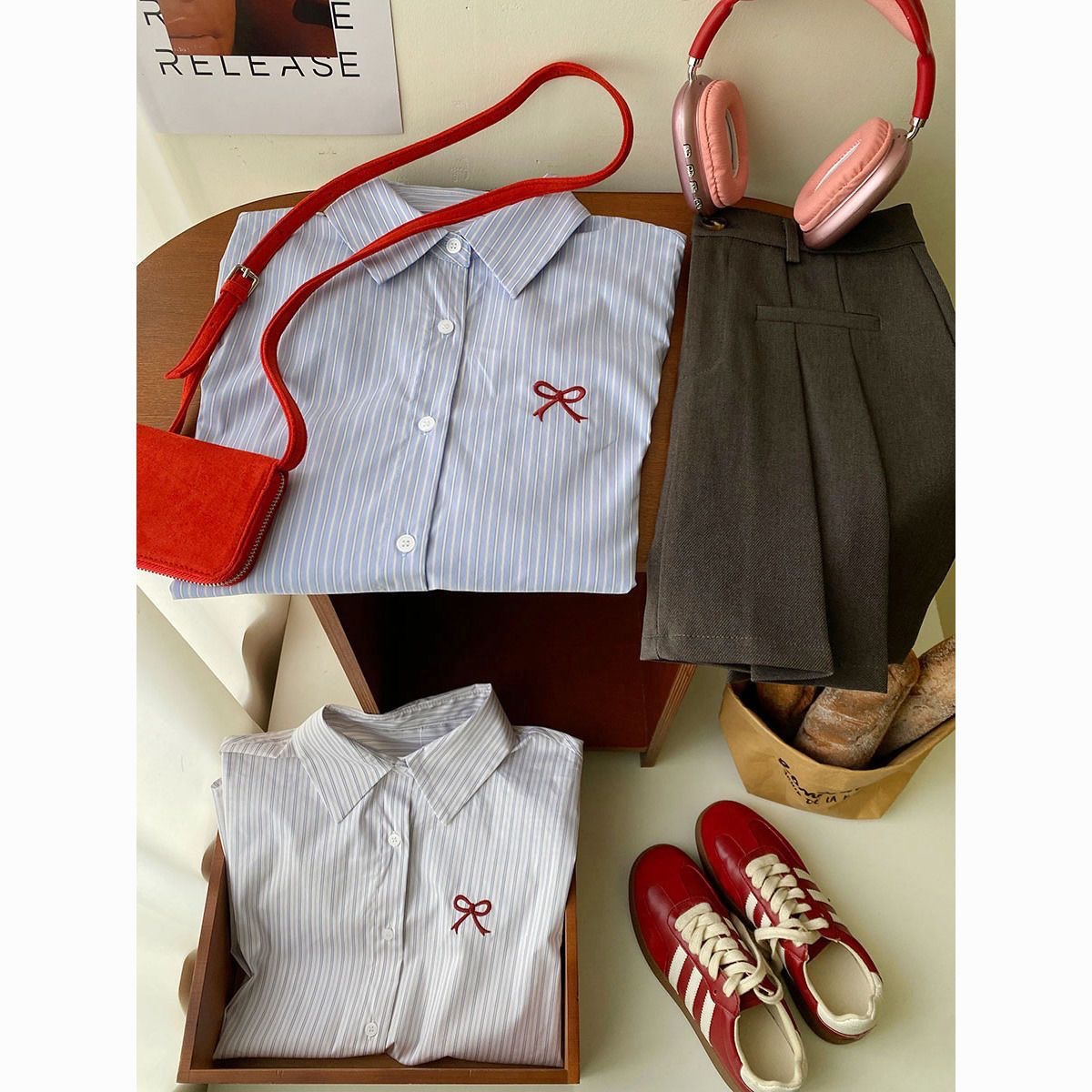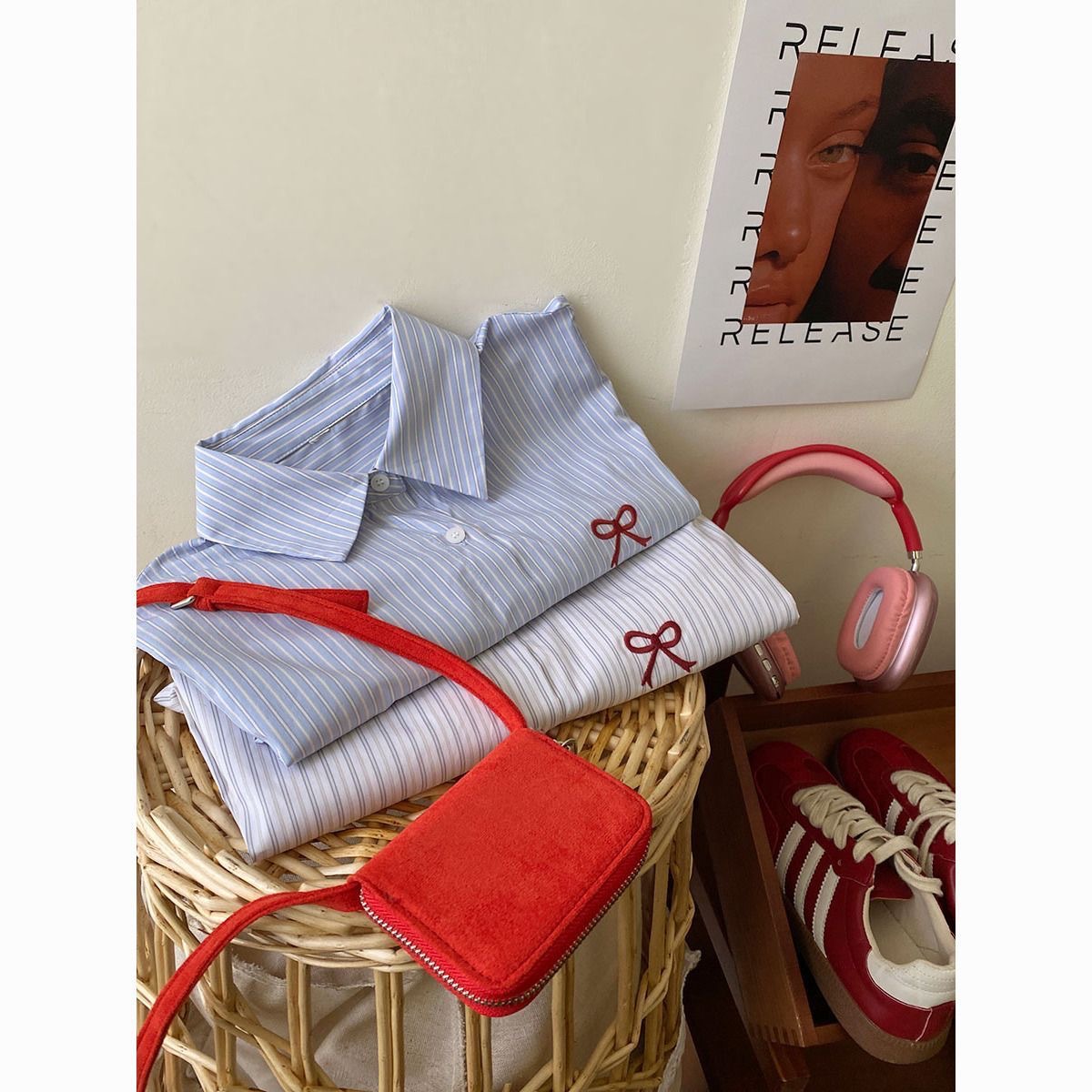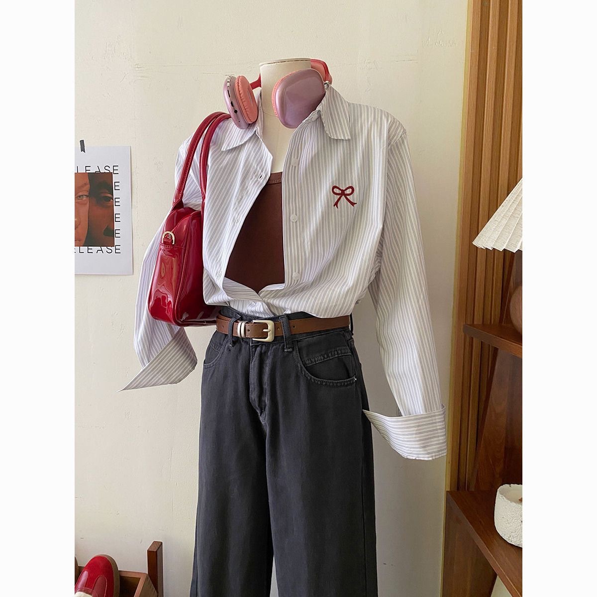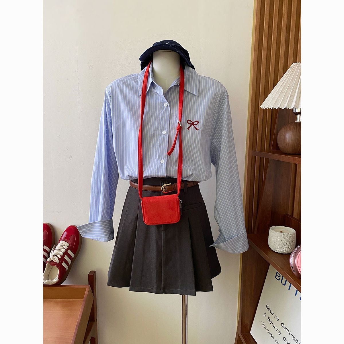 한국 스타일 블루 스트라이프 활 자수 긴팔 셔츠 여성용 봄과 여름 내부 착용 레트로 서양식 셔츠 탑스토어 가기