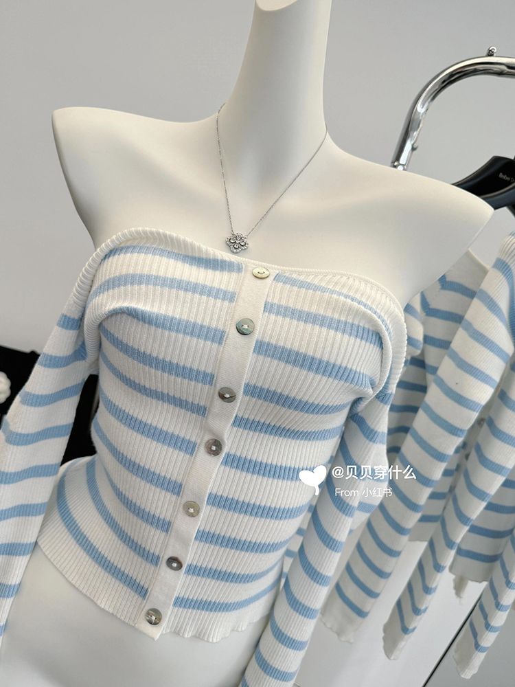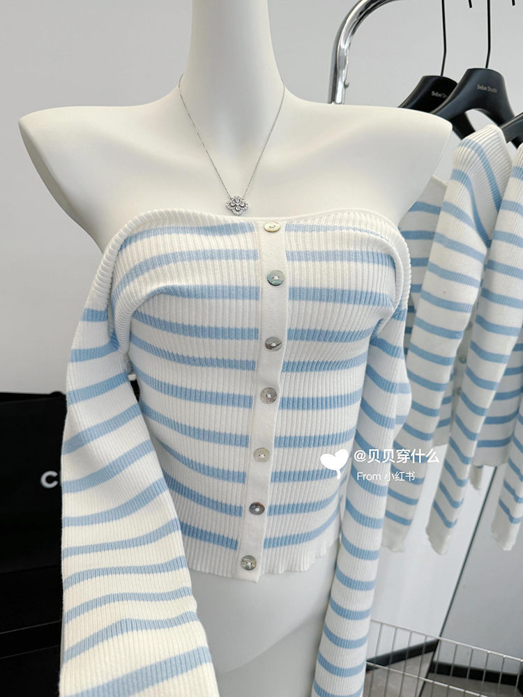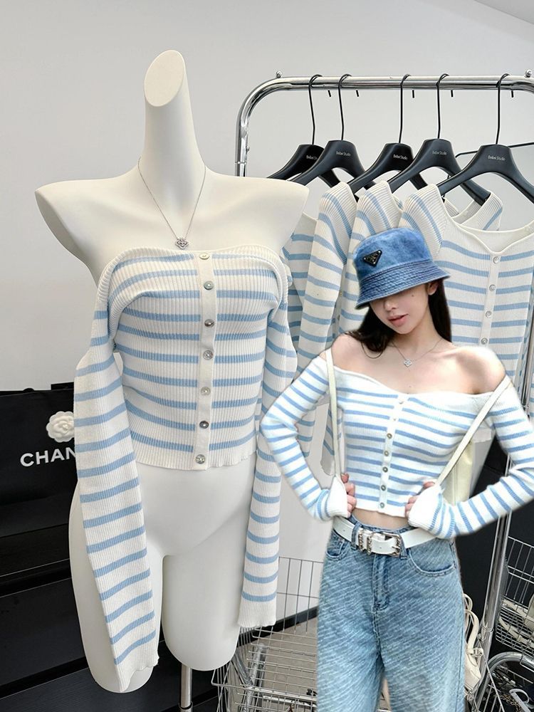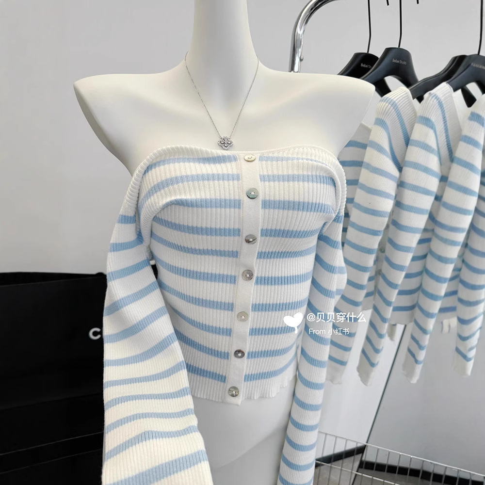 오프 숄더 블루와 화이트 스트라이프 긴팔 스웨터 여성의 봄 슬림 핏 이너 스웨터 디자인 순수 바닥 탑