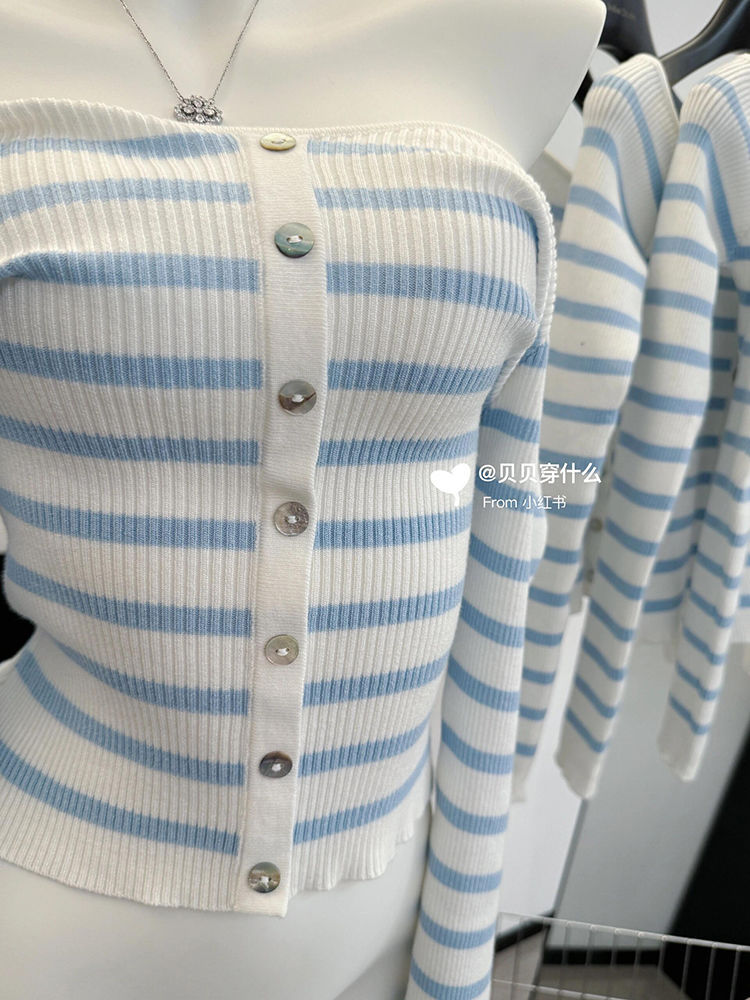 오프 숄더 블루와 화이트 스트라이프 긴팔 스웨터 여성의 봄 슬림 핏 이너 스웨터 디자인 순수 바닥 탑스토어 가기