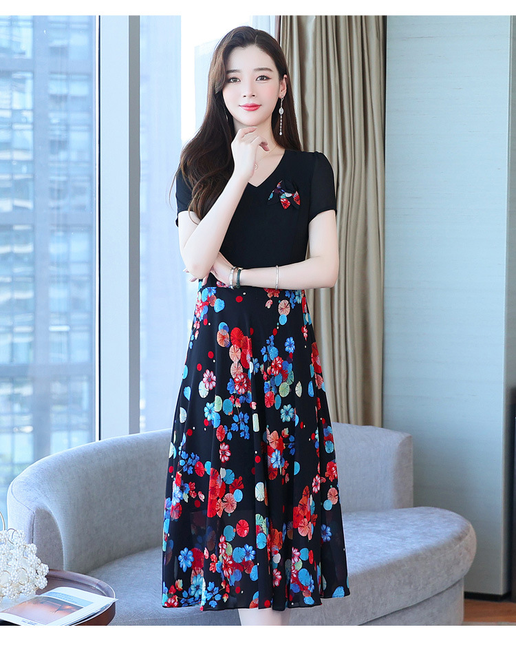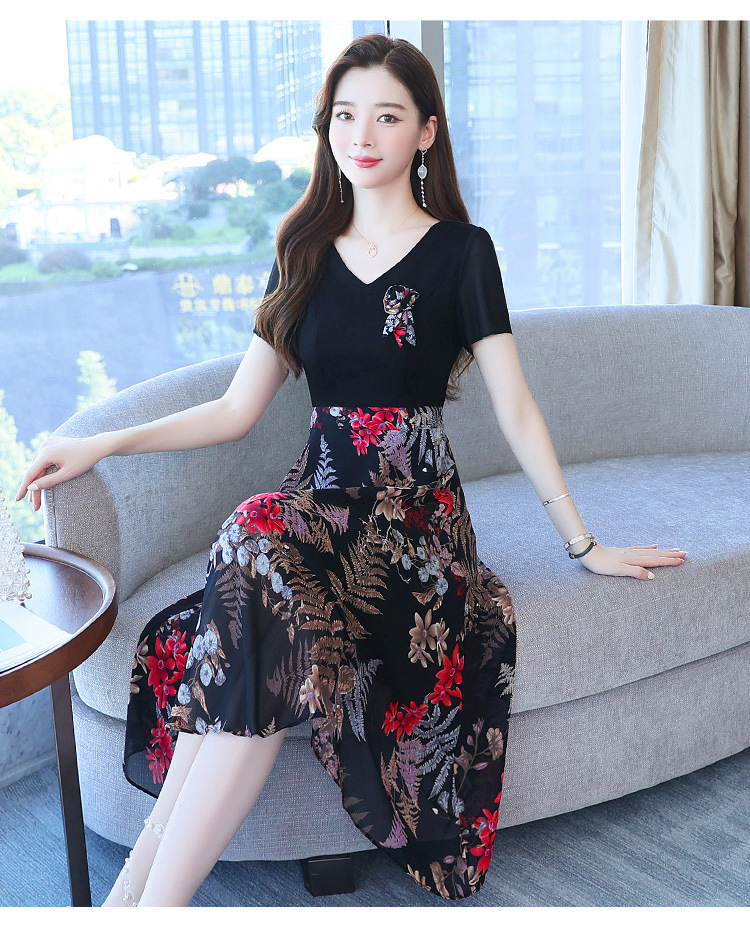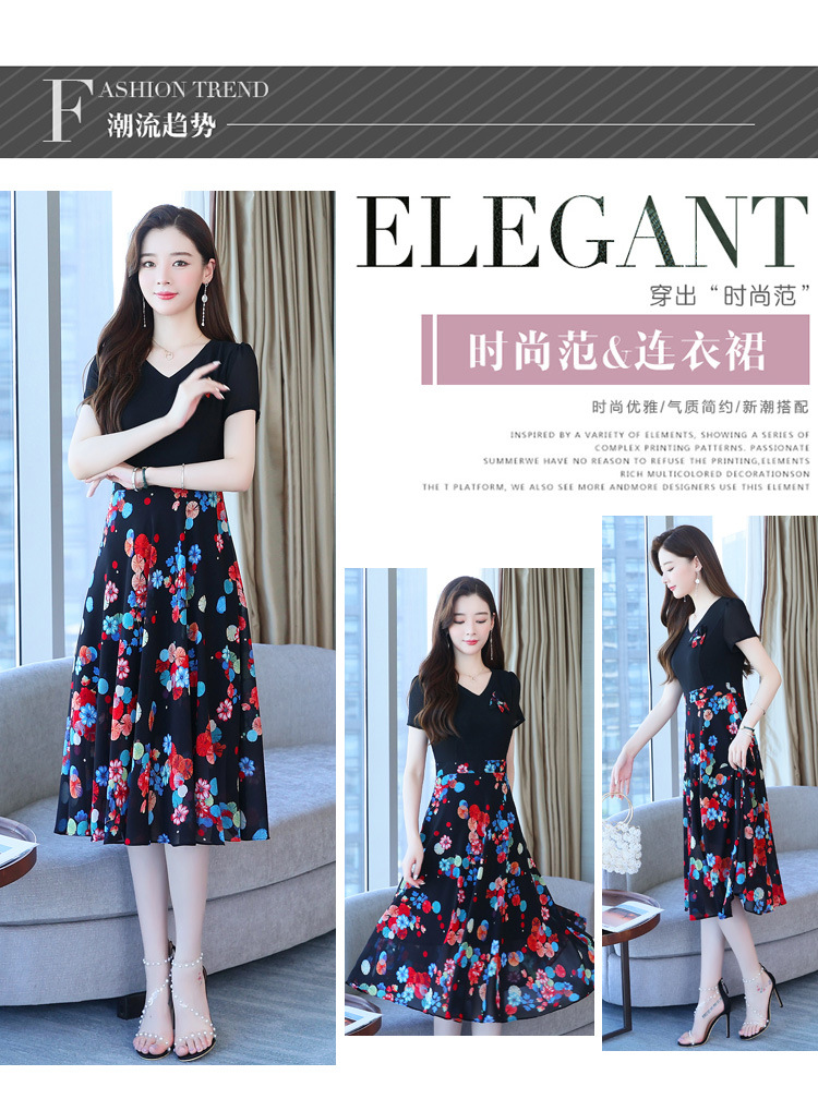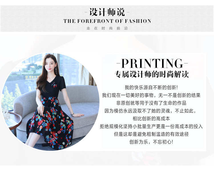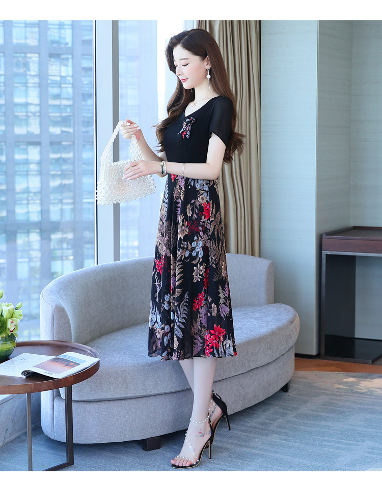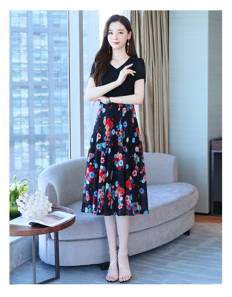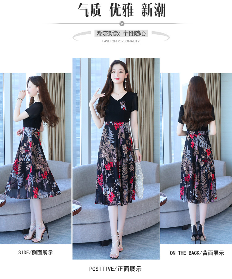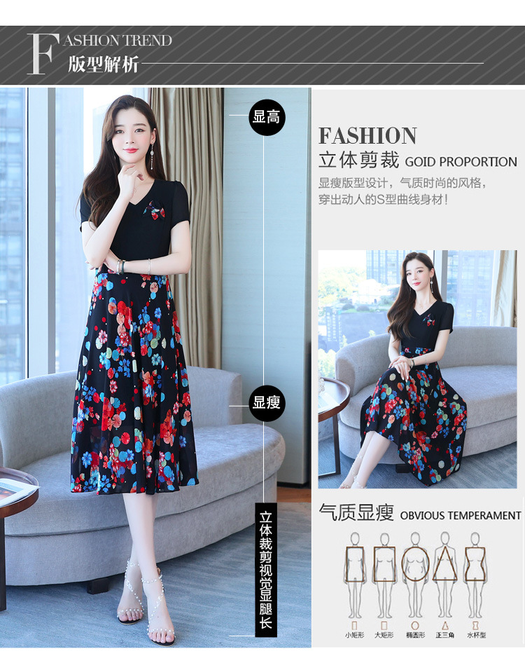 가짜 투피스 원피스 여성 소외된 우아한 여름 스티칭 쉬폰 인쇄 유행 세련된 반팔 치마스토어 가기