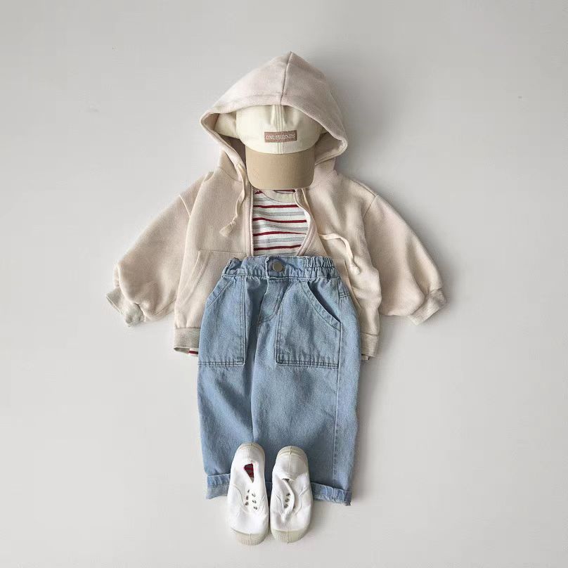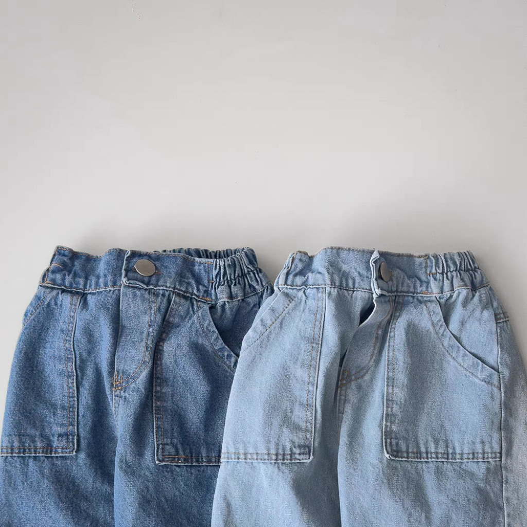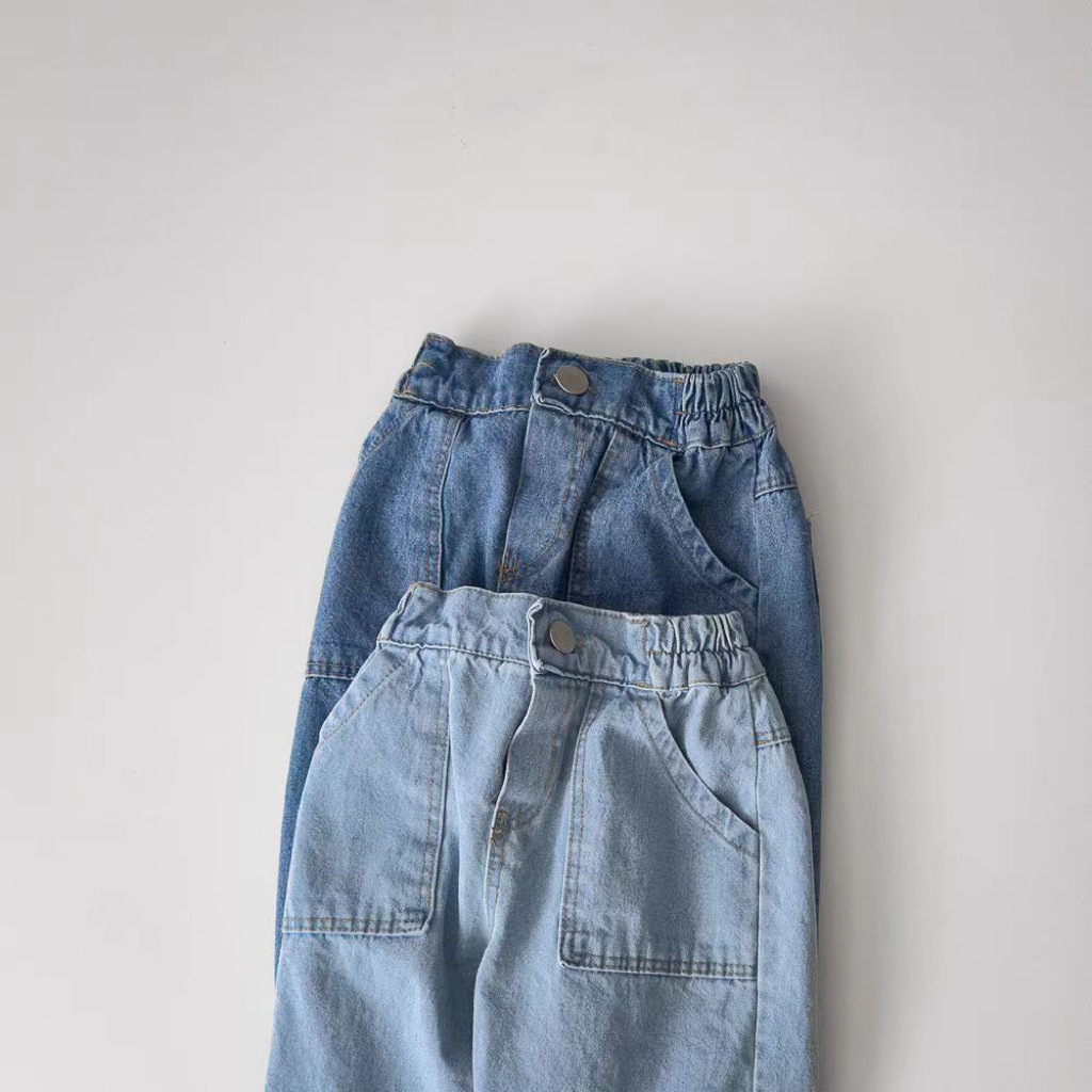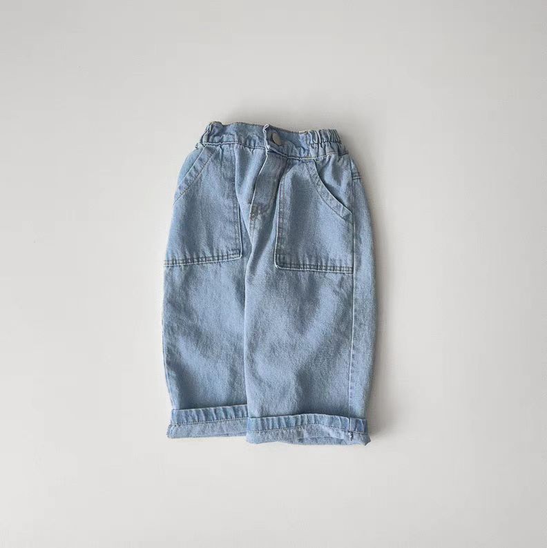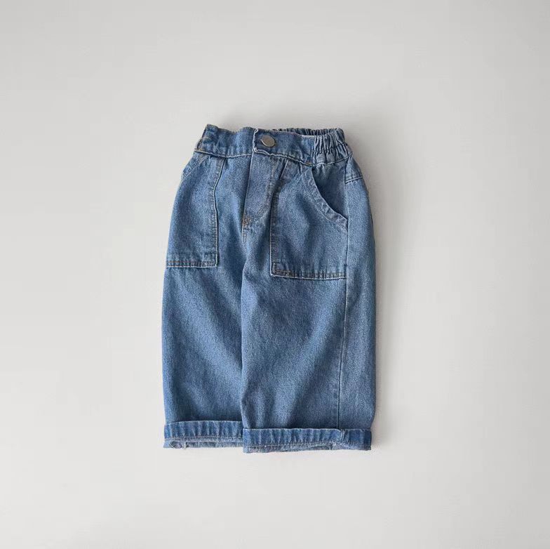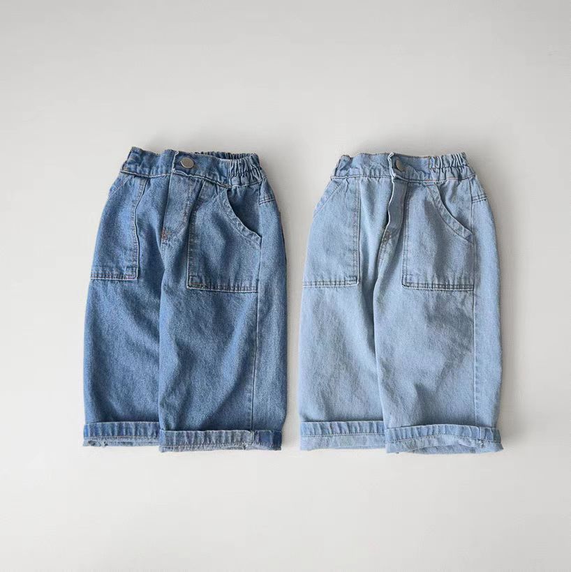 한국식 Ins 더블 포켓 스트레이트 청바지 봄 남녀 잘 생긴 올매치 캐주얼 어린이 바지 고무 밴드 바지