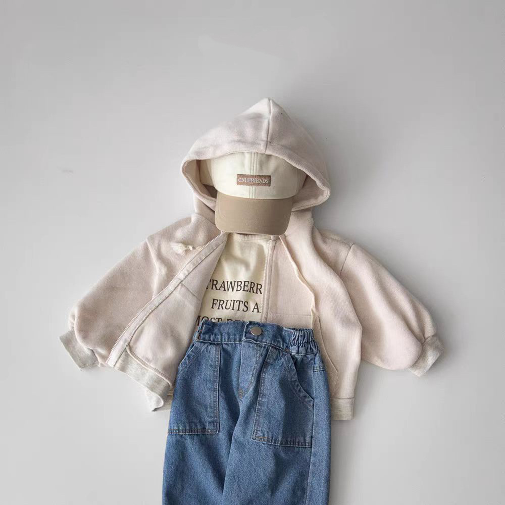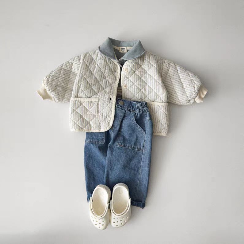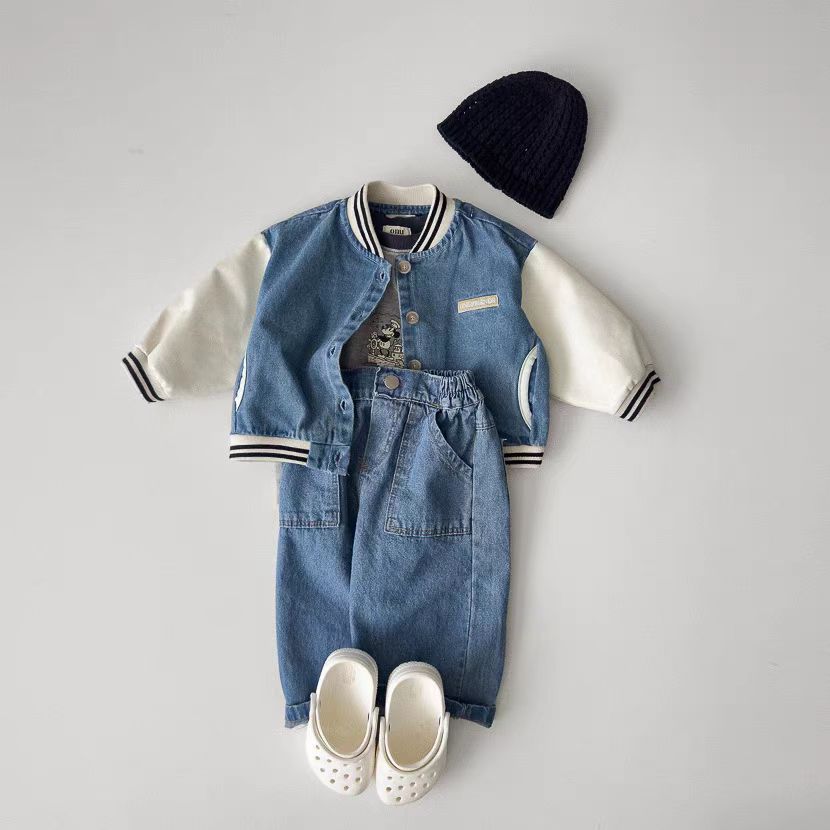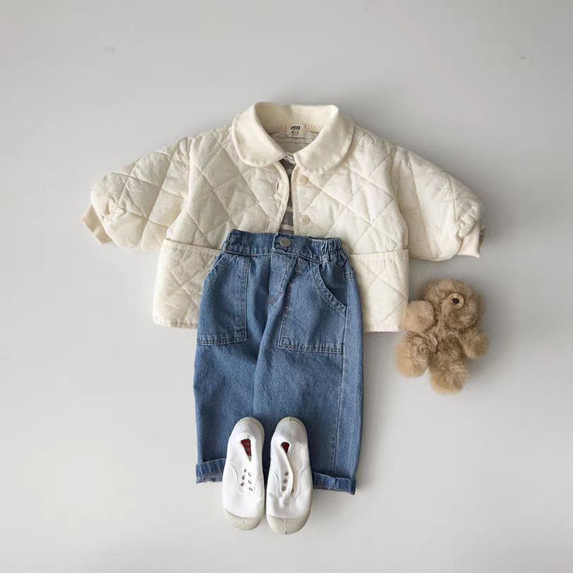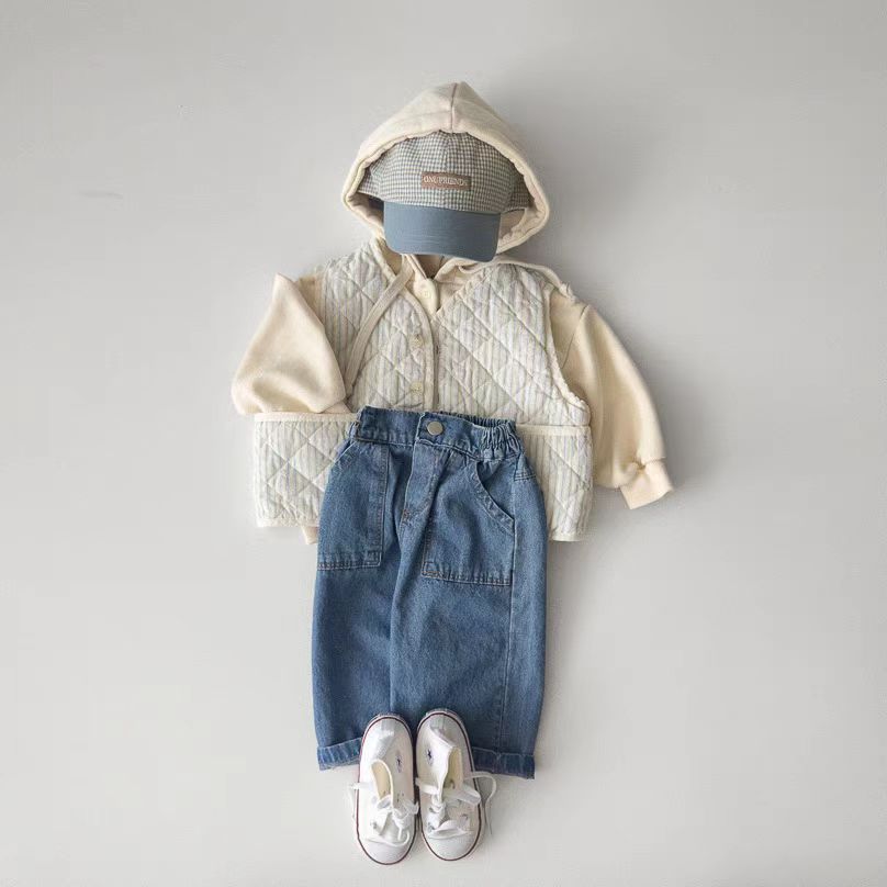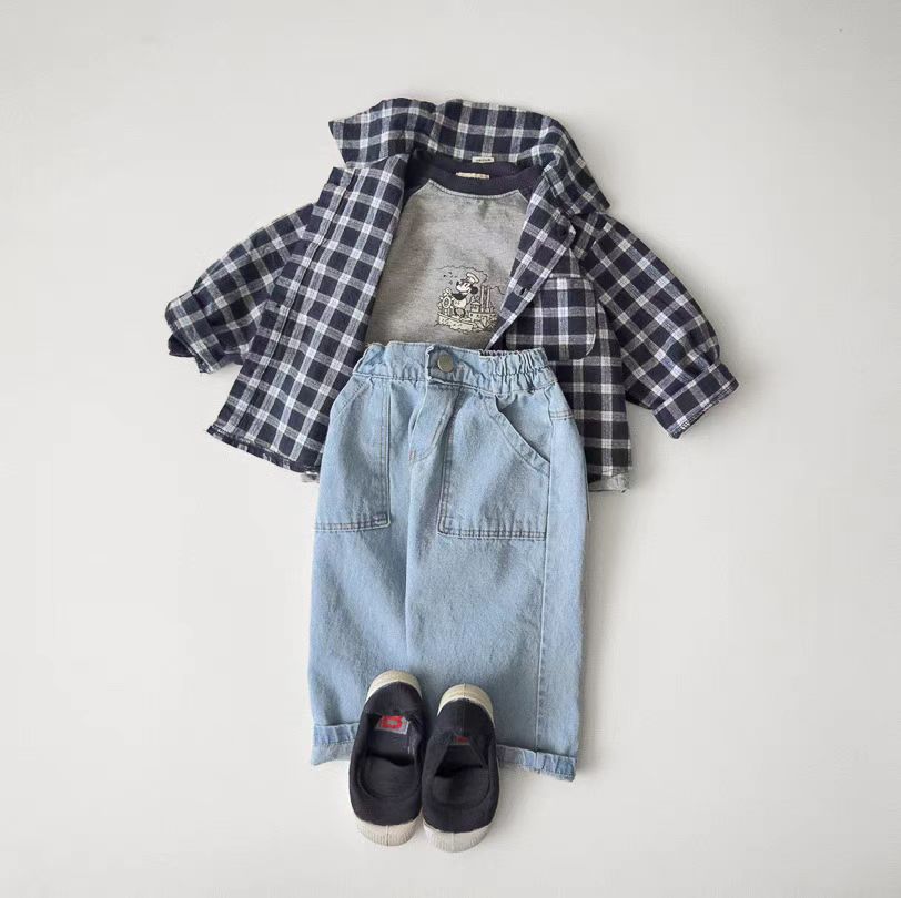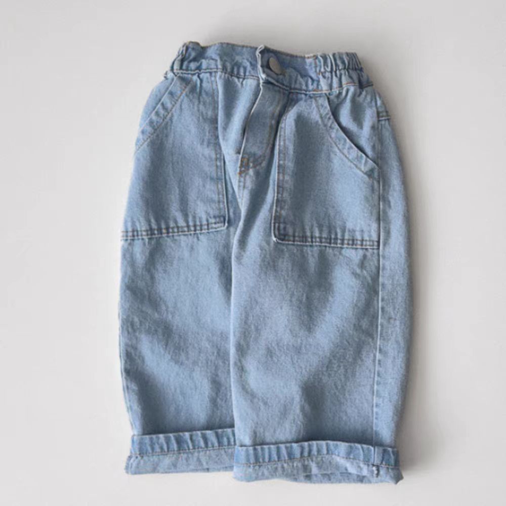 한국식 Ins 더블 포켓 스트레이트 청바지 봄 남녀 잘 생긴 올매치 캐주얼 어린이 바지 고무 밴드 바지