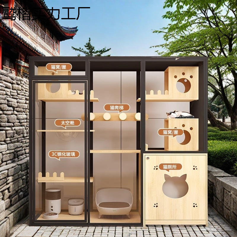 파노라마 고양이 빌라 고양이 캐비닛 실내 가정용 단단한 나무 고급 고양이 집 자동 고양이 쓰레기 상자 유리 고양이 방 투명