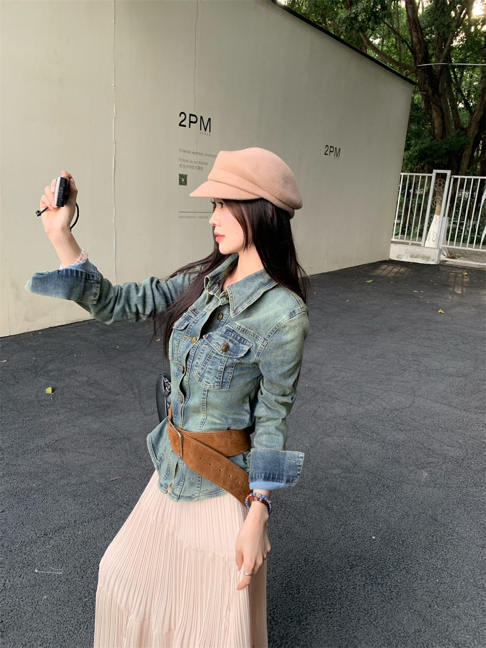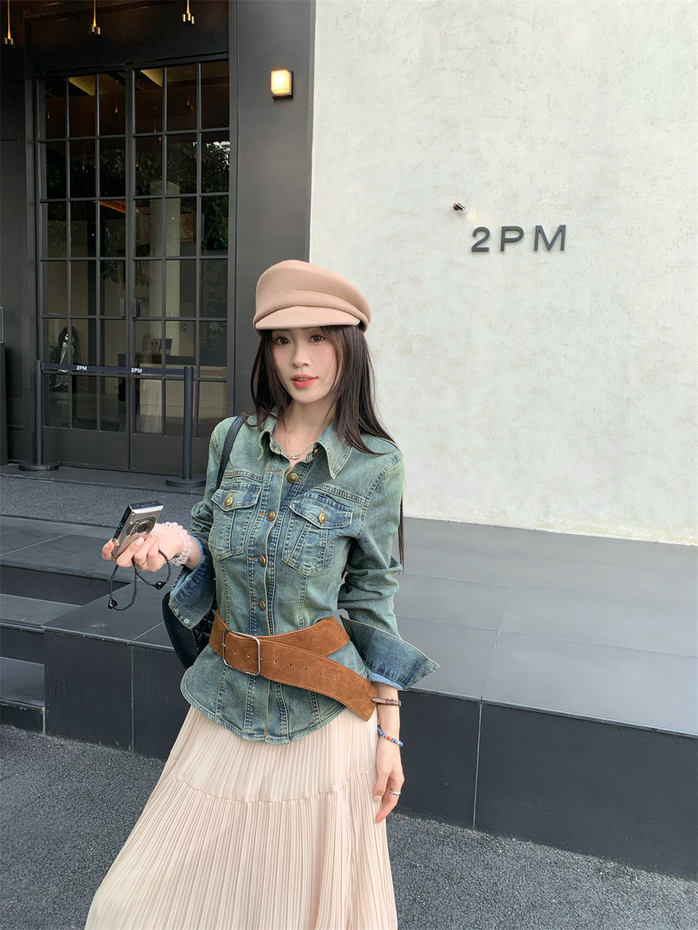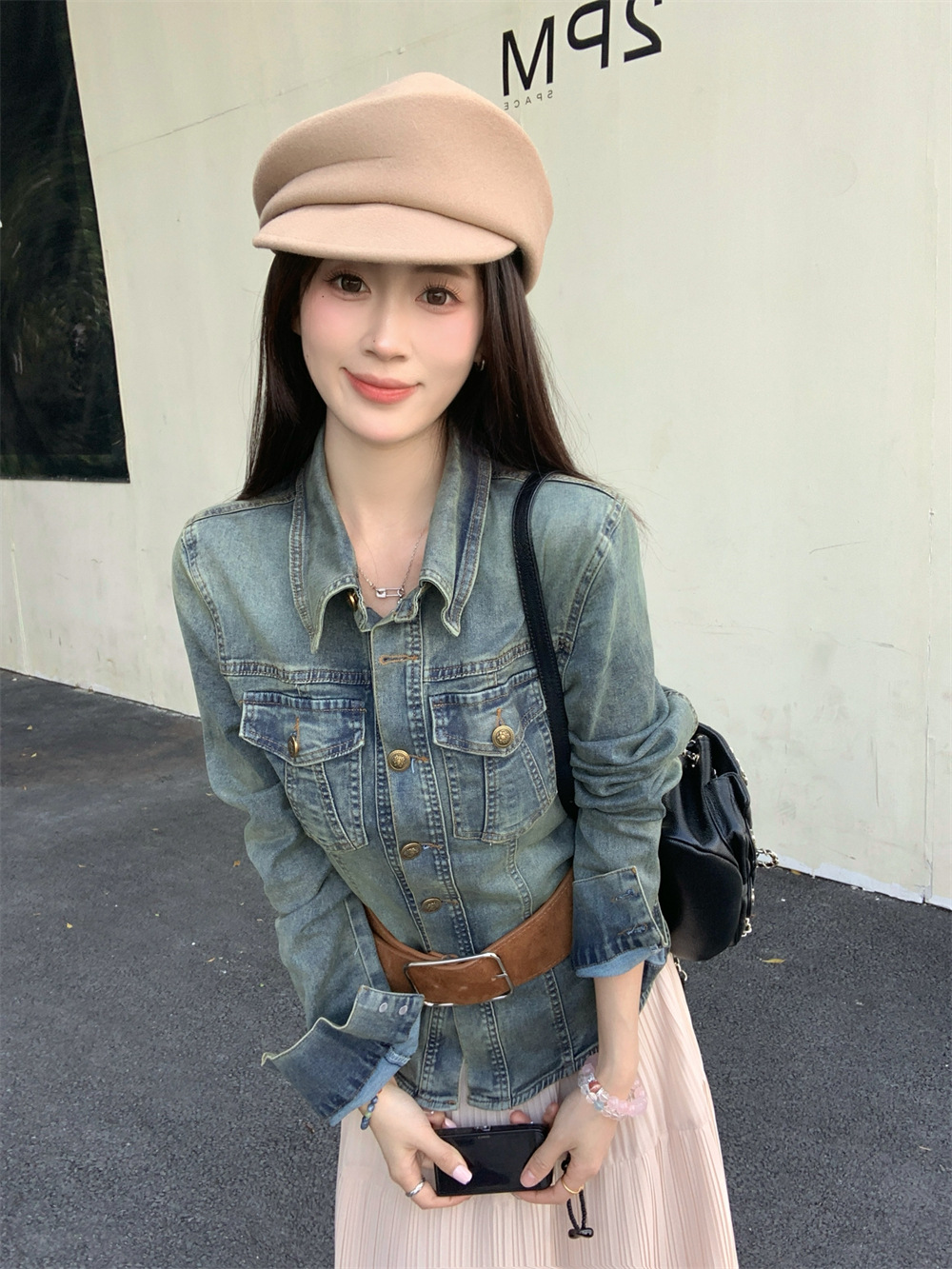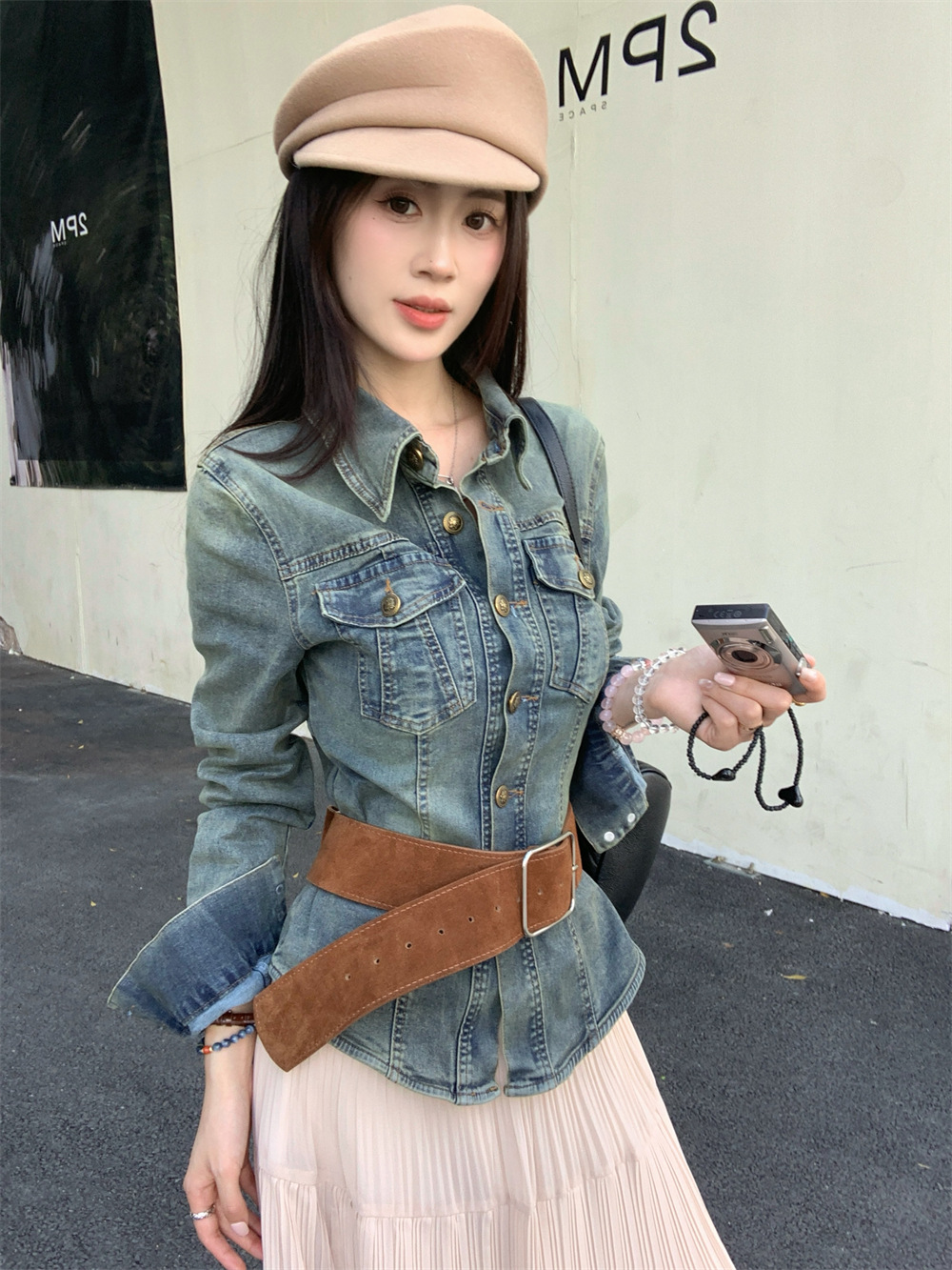 홍콩 스타일 레트로 블루 데님 코트 여성의 봄 2025 새로운 디자인 감각 작은 어깨 허리 슬림 탑