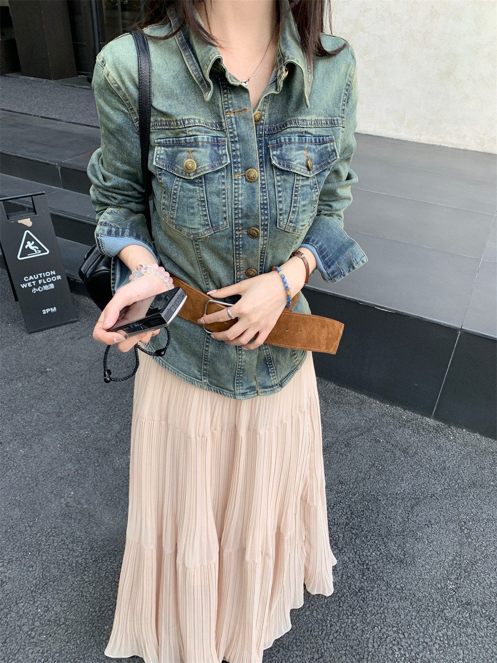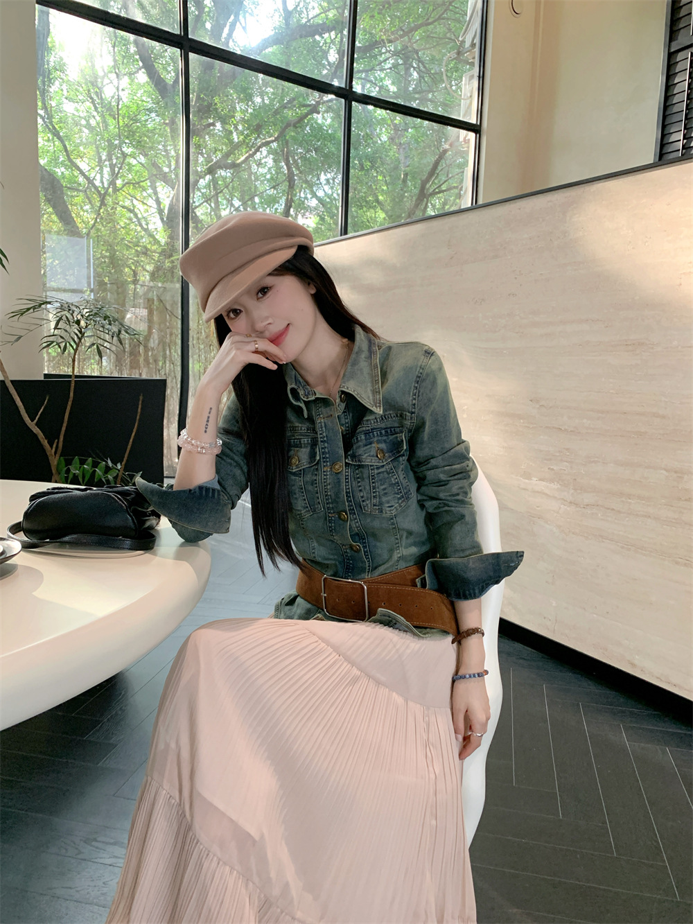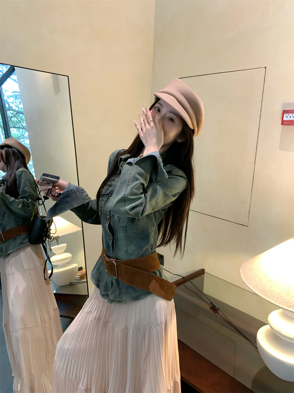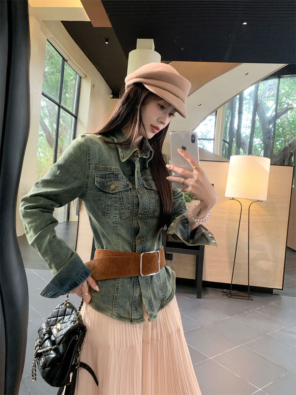 홍콩 스타일 레트로 블루 데님 코트 여성의 봄 2025 새로운 디자인 감각 작은 어깨 허리 슬림 탑