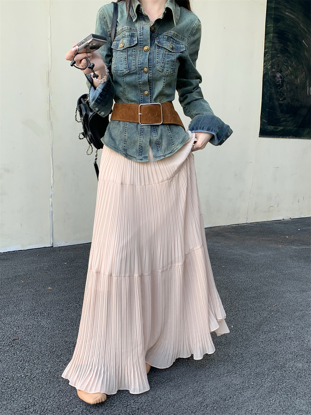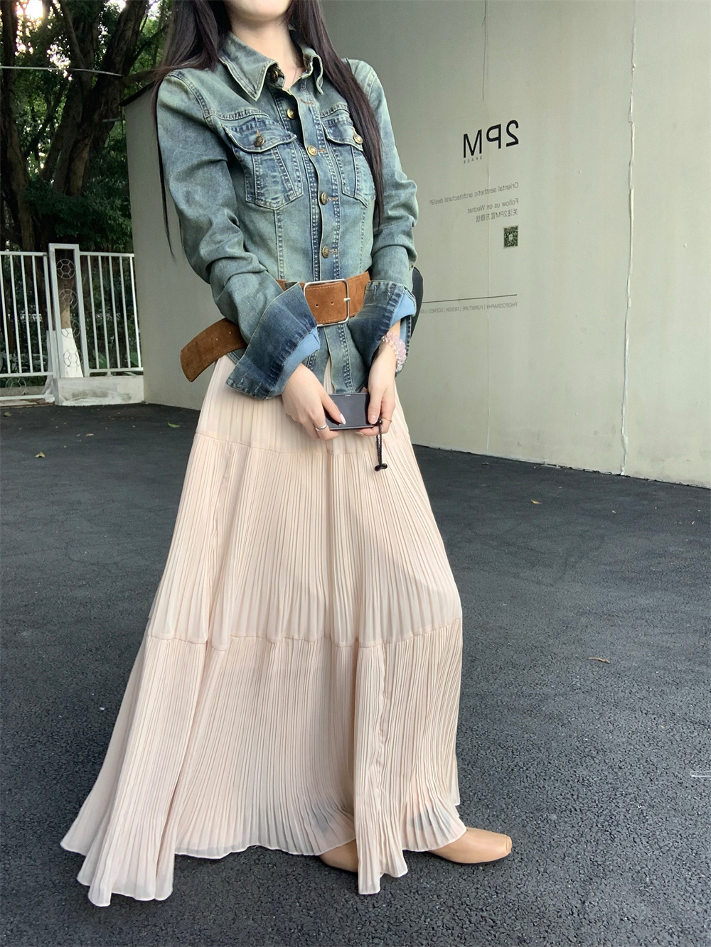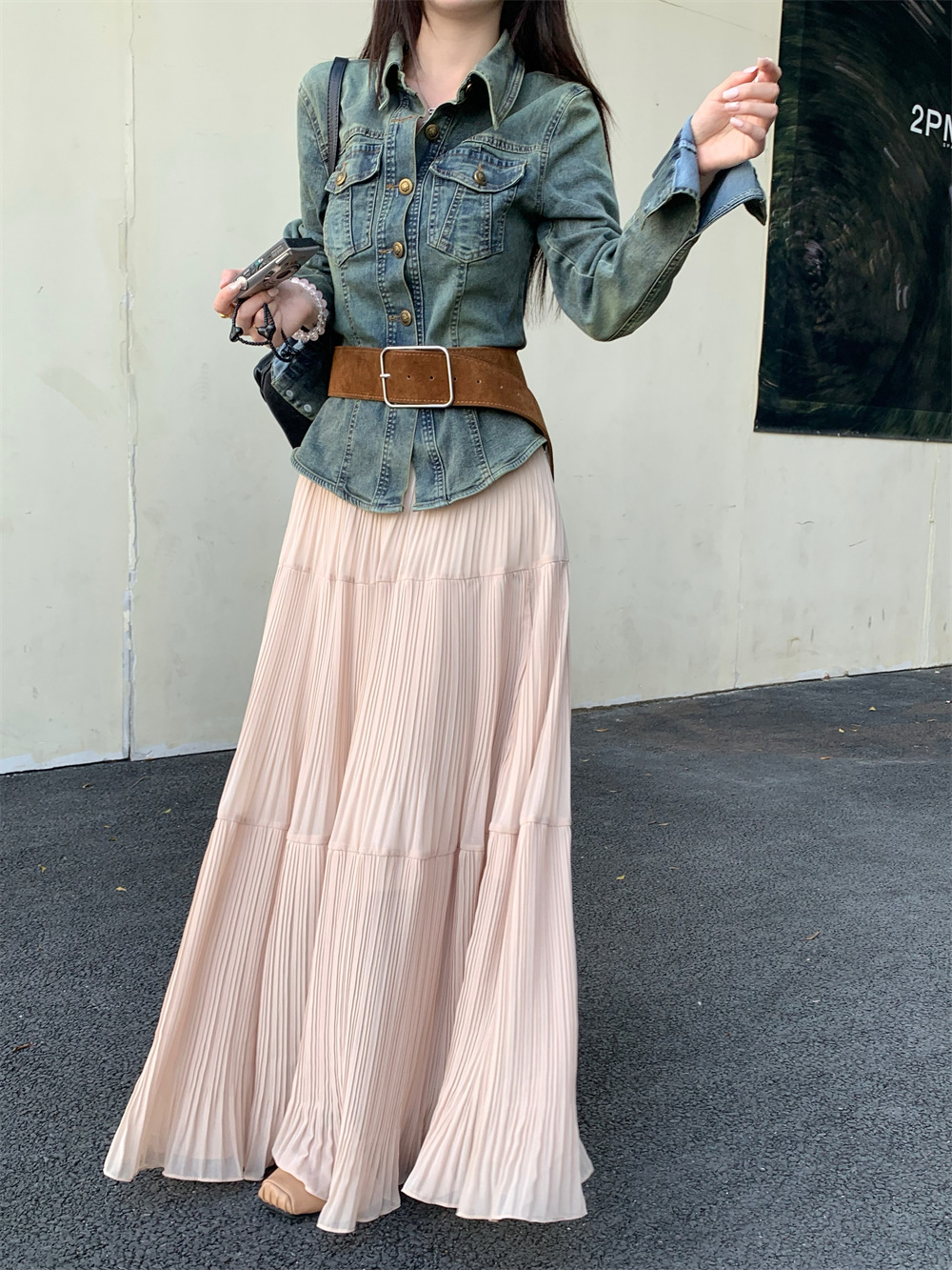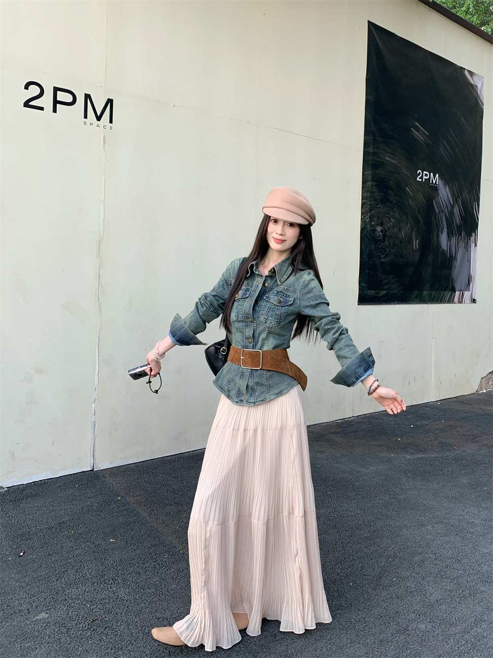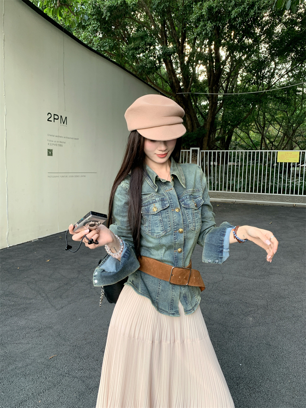 홍콩 스타일 레트로 블루 데님 코트 여성의 봄 2025 새로운 디자인 감각 작은 어깨 허리 슬림 탑