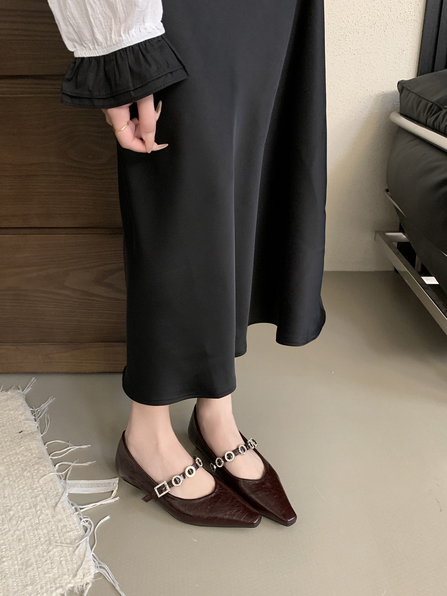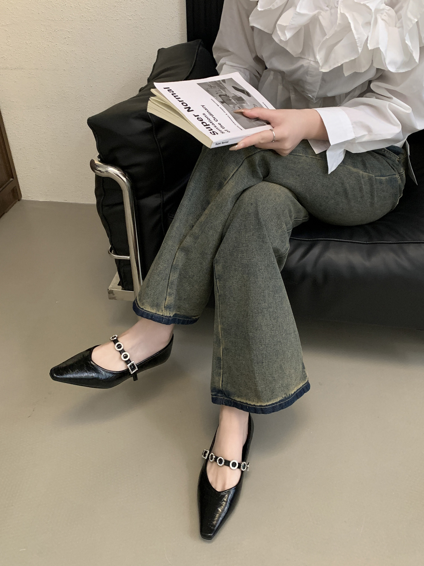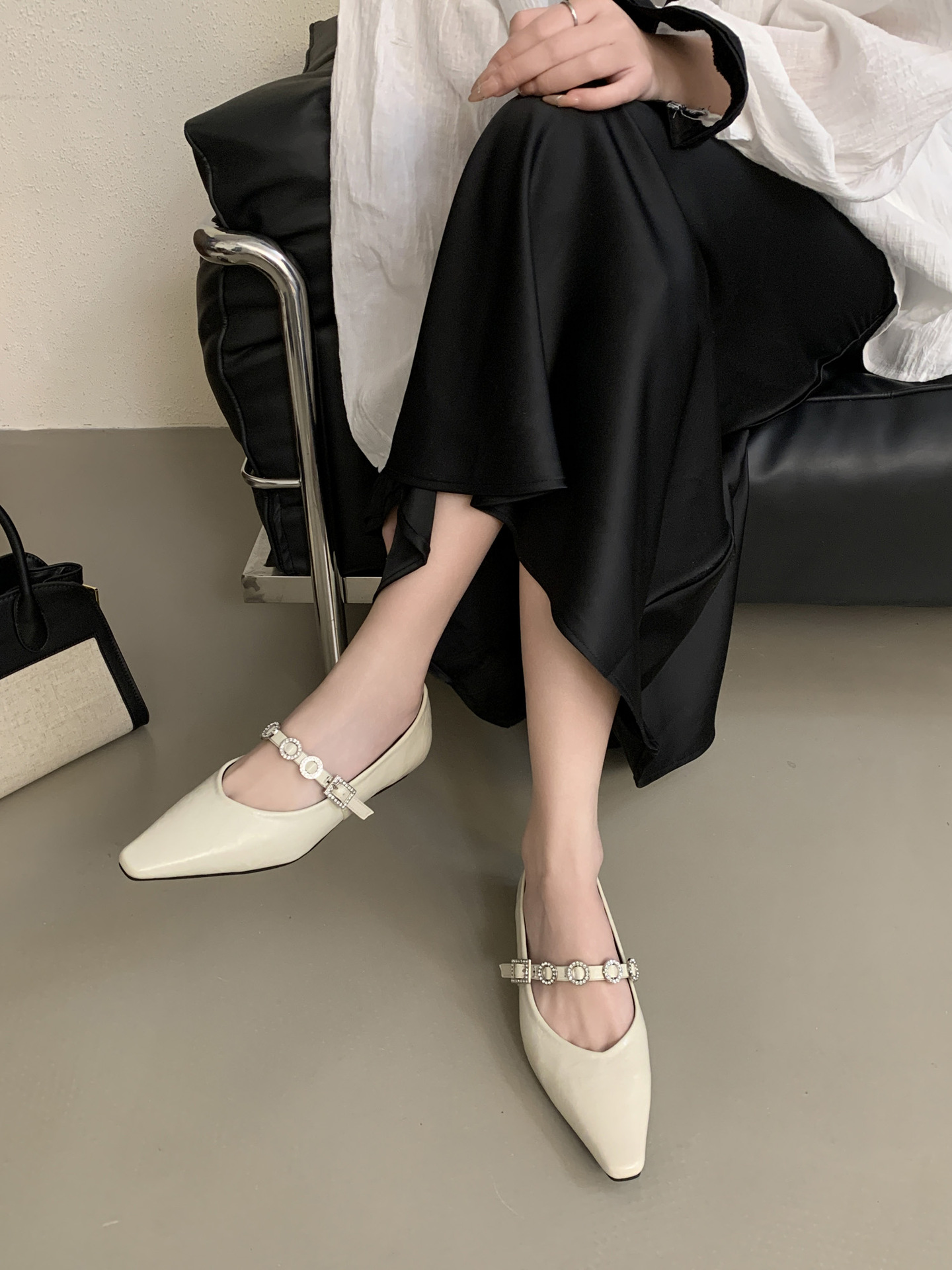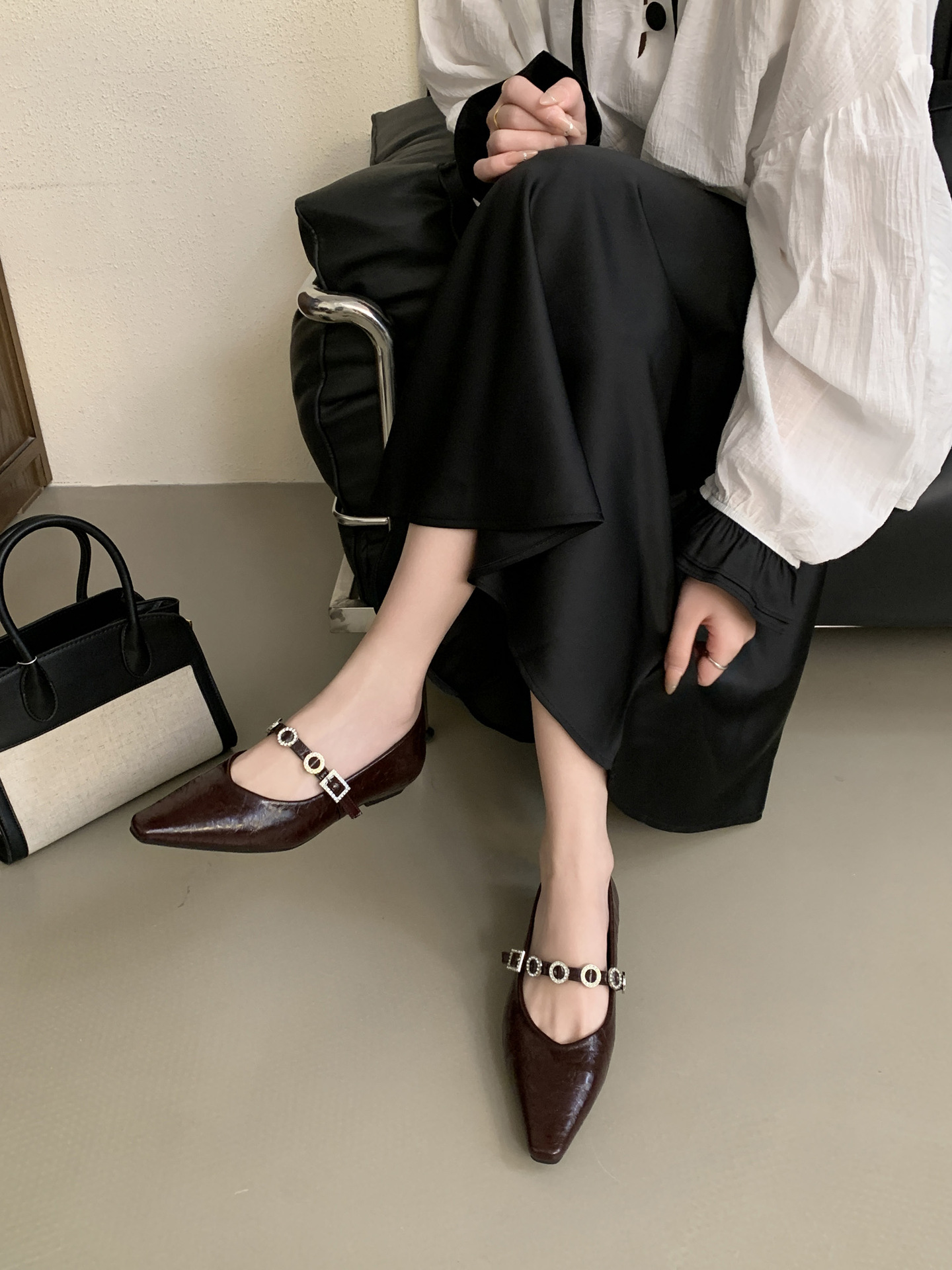뾰족한 발가락 신발 여성의 2025 년 봄과 가을 새로운 프랑스 얕은 입 메리 제인 신발 빈티지 금속 체인 스트랩 가죽 신발스토어 가기