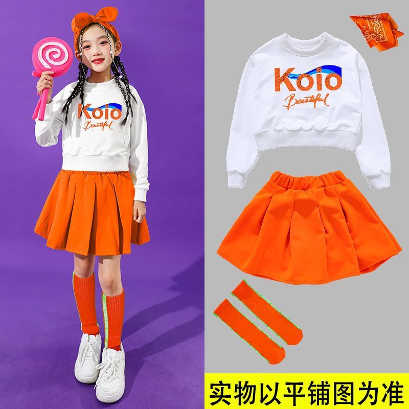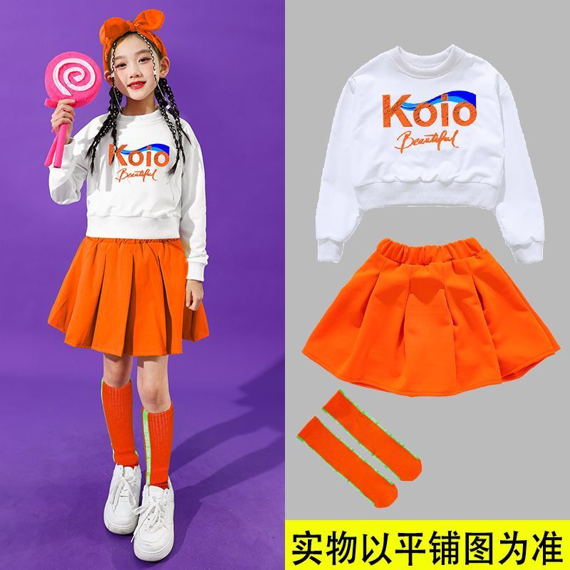 • 여성 KO 흰색 짧은 스웨트 셔츠 + 주황색 스커트 + 주황색 줄무늬 양말