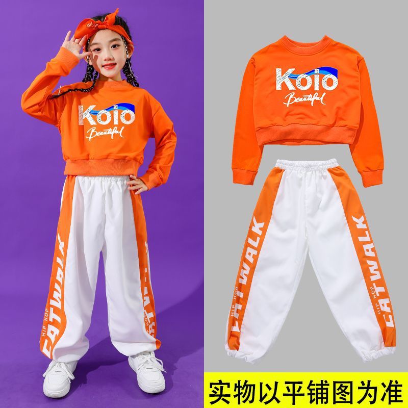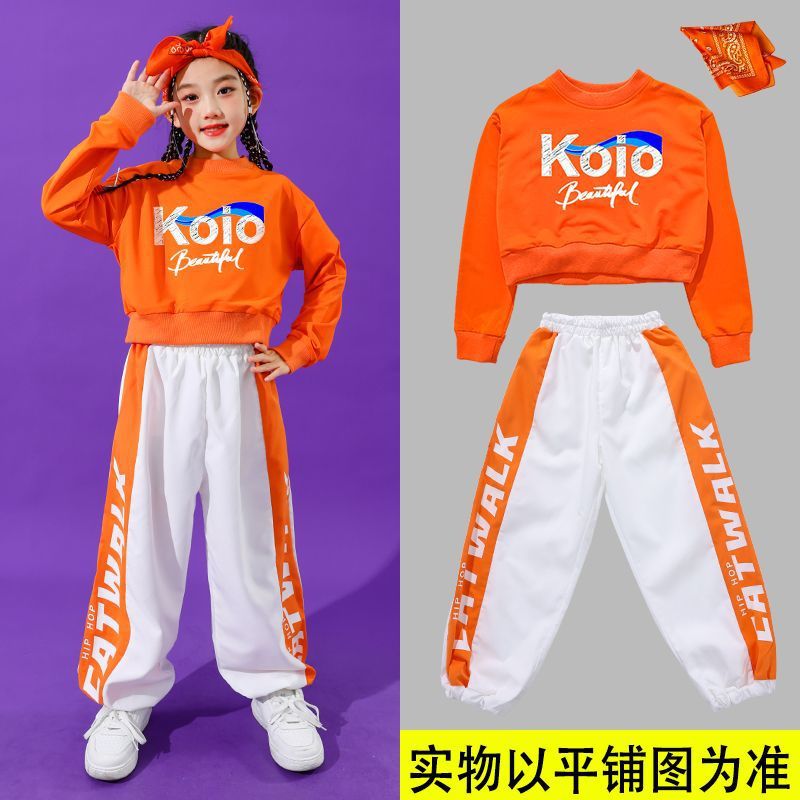 • 여성용 KO 오렌지색 짧은 스웨트셔츠 + 오렌지색 줄무늬 흰색 바지 + 오렌지색 사각 스카프