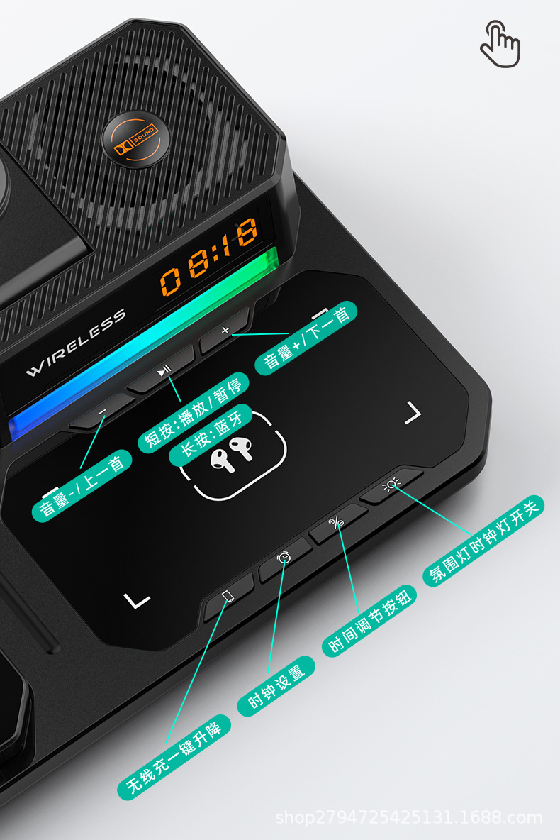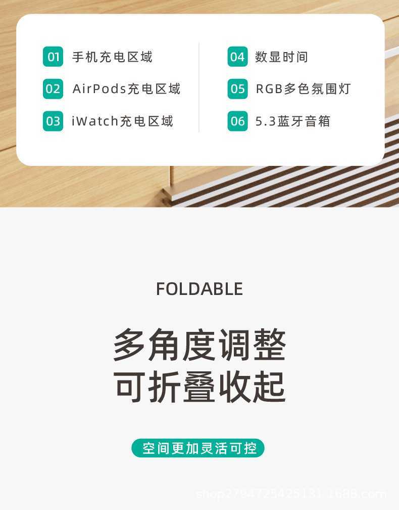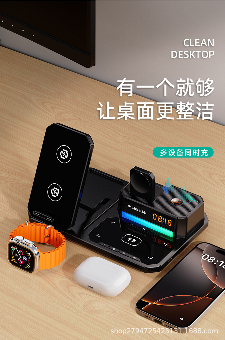데스크탑 다기능 블루투스 스피커 시계 휴대 전화 접이식 스탠드 휴대용 4 대 1 무선 충전 재고 공급스토어 가기