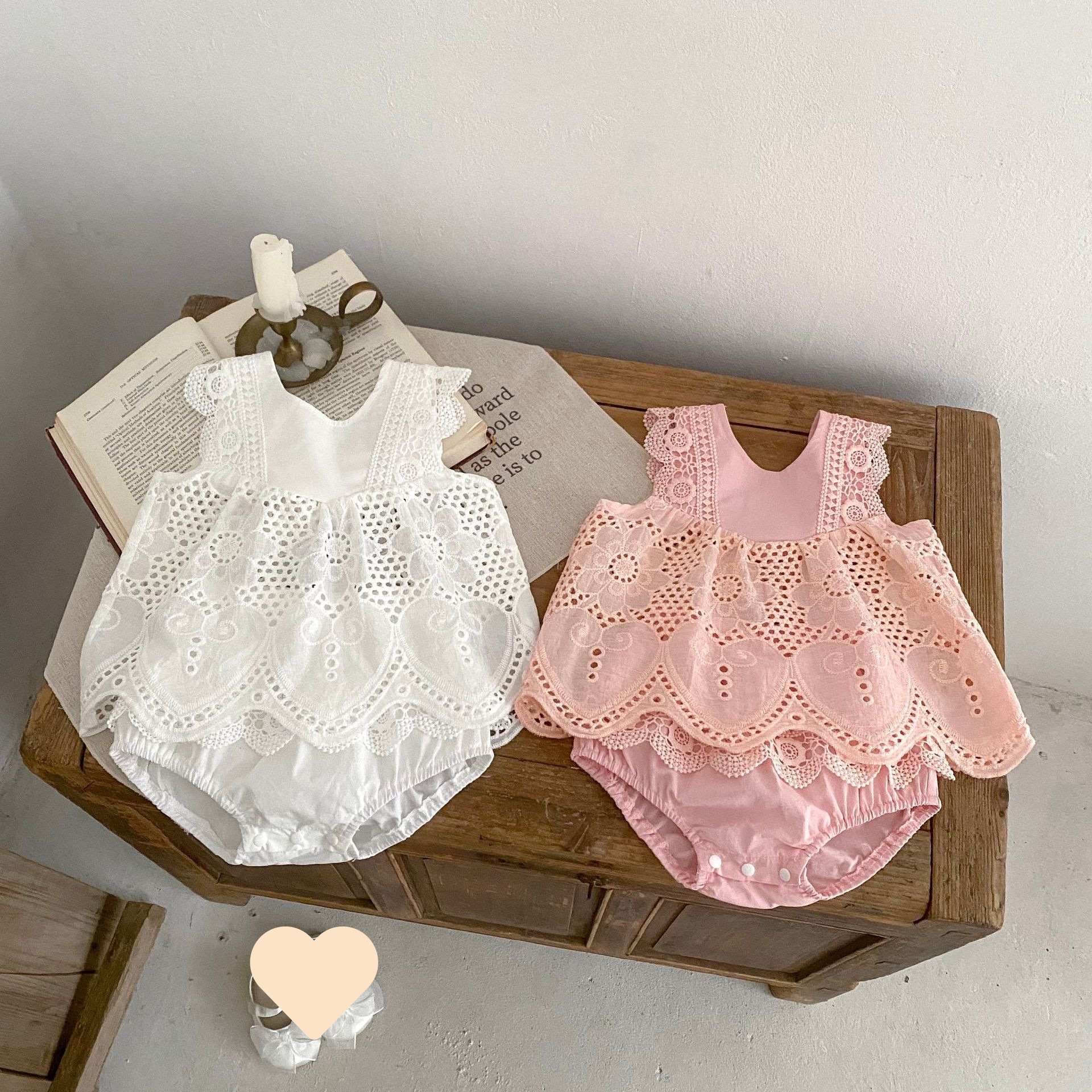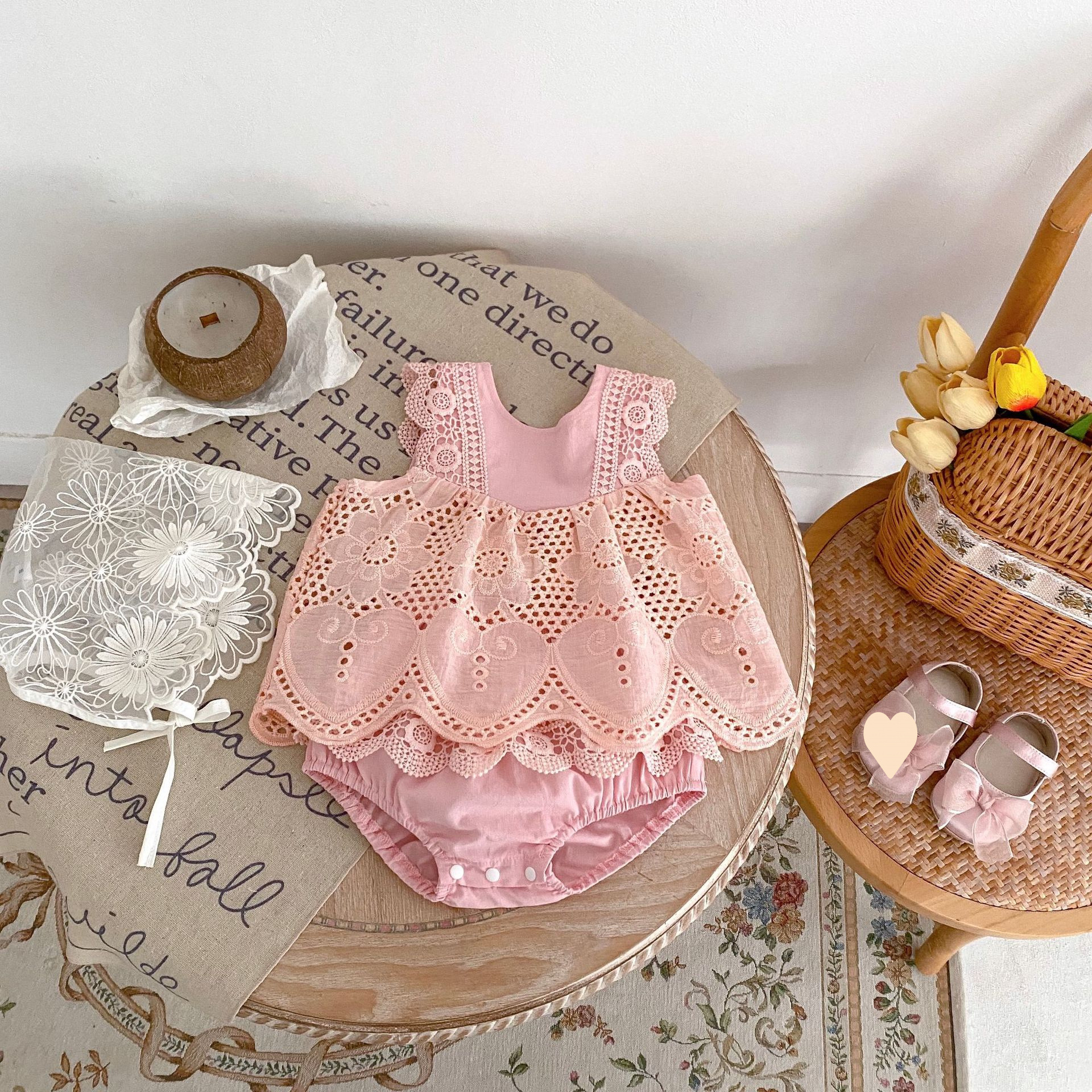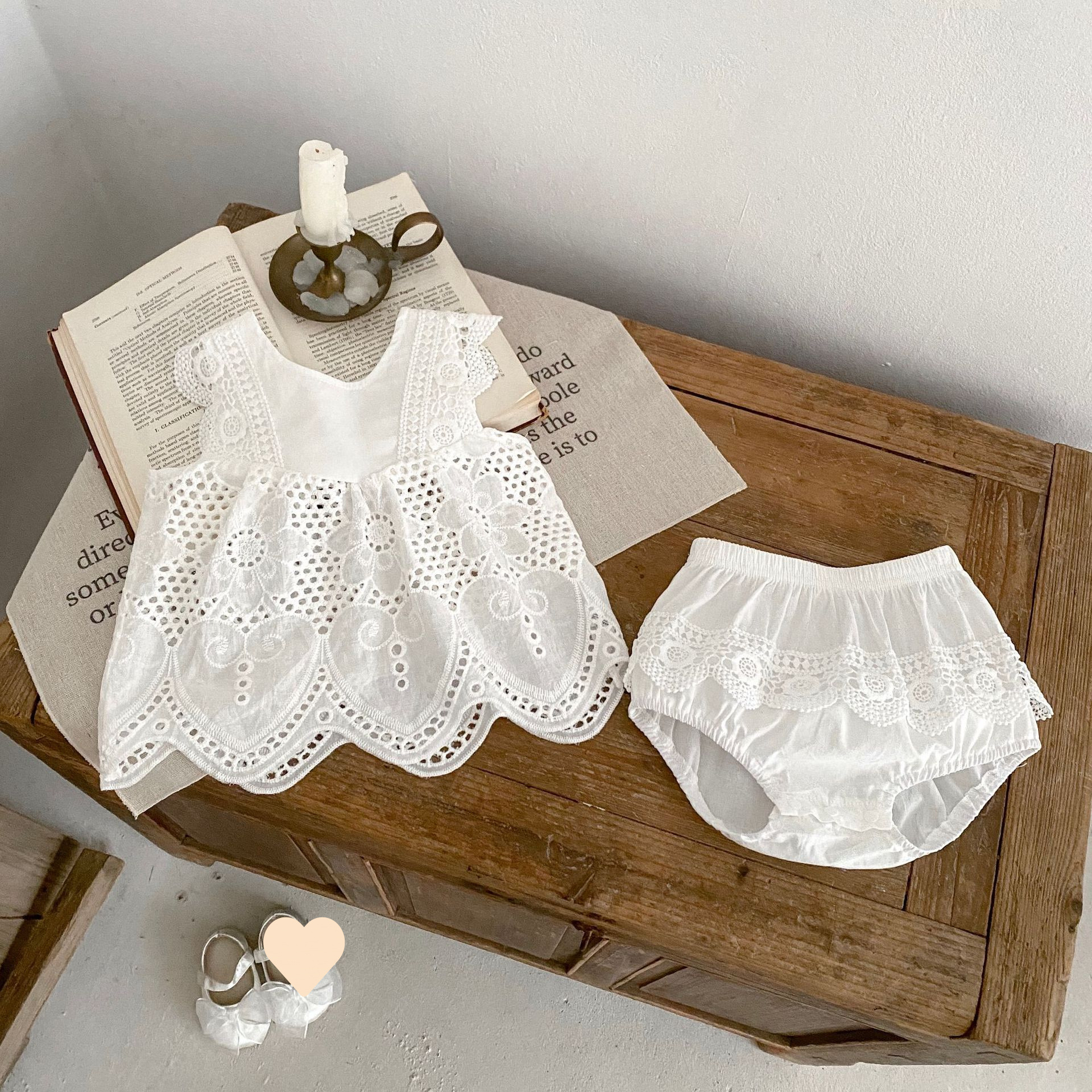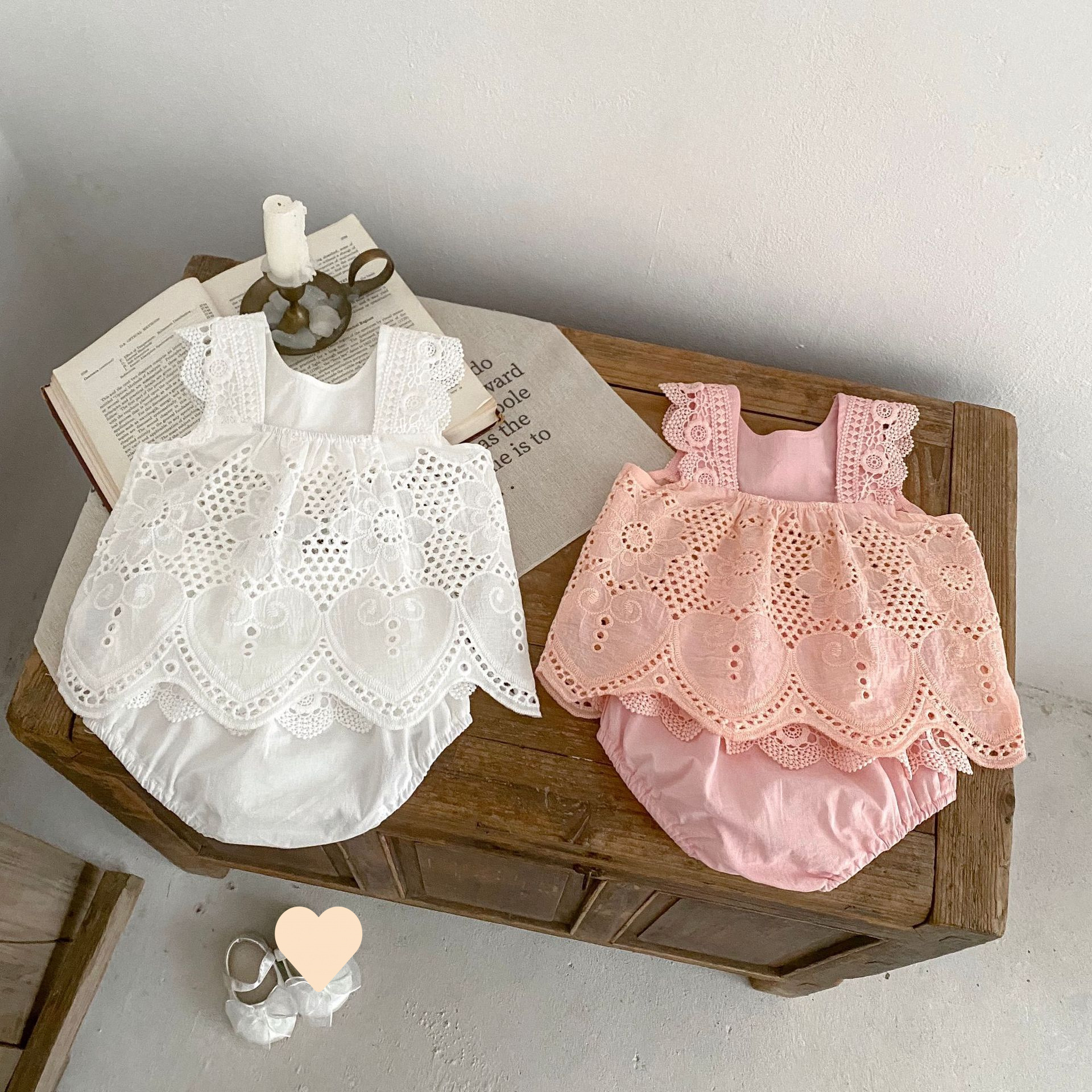 2025 년 여름 아기 소녀 아기 둥근 목 민소매 레이스 바느질 탑 순수 컬러 방귀 바지 2 세트