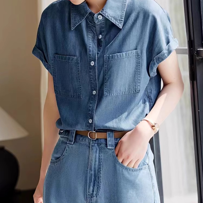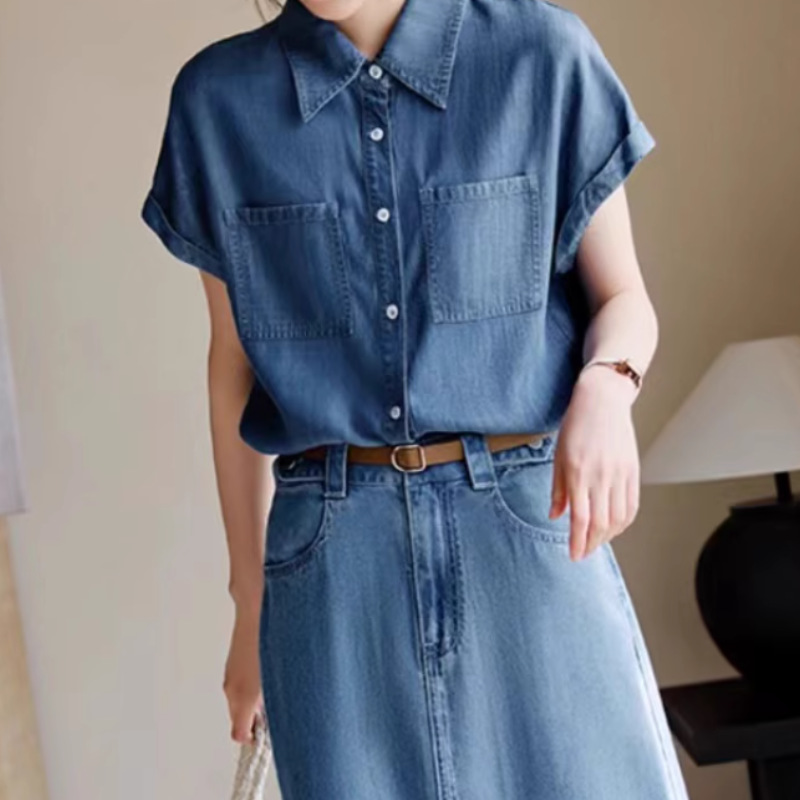 빈티지 폴로 칼라 조끼 셔츠 여름 홍콩 스타일 우아한 통근자 느슨한 여자 올 매치 반팔 데님 셔츠