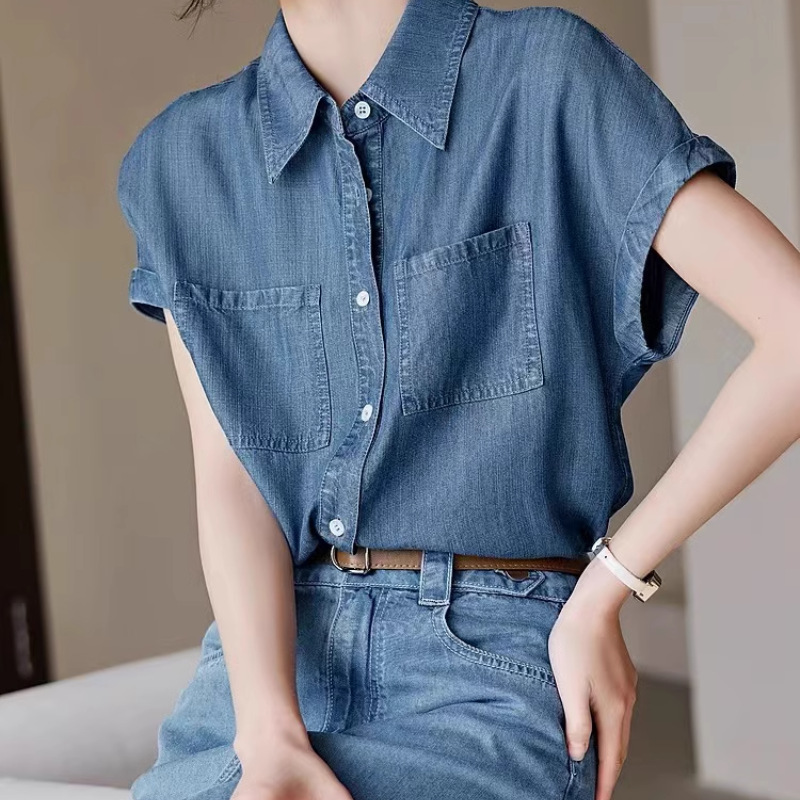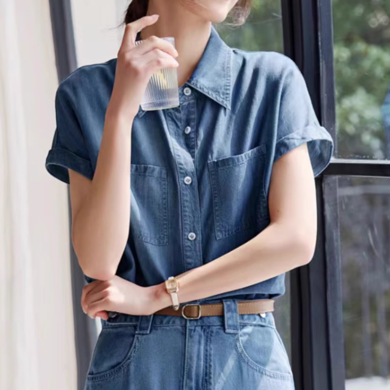 빈티지 폴로 칼라 조끼 셔츠 여름 홍콩 스타일 우아한 통근자 느슨한 여자 올 매치 반팔 데님 셔츠스토어 가기