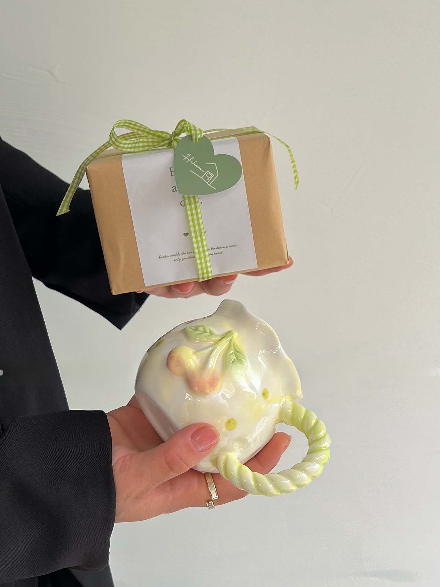 • 녹색 체리 컵 + 꽃무늬 선물 가방 + 무료 스테인레스 스틸 스푼 녹색 꽃무늬 포장