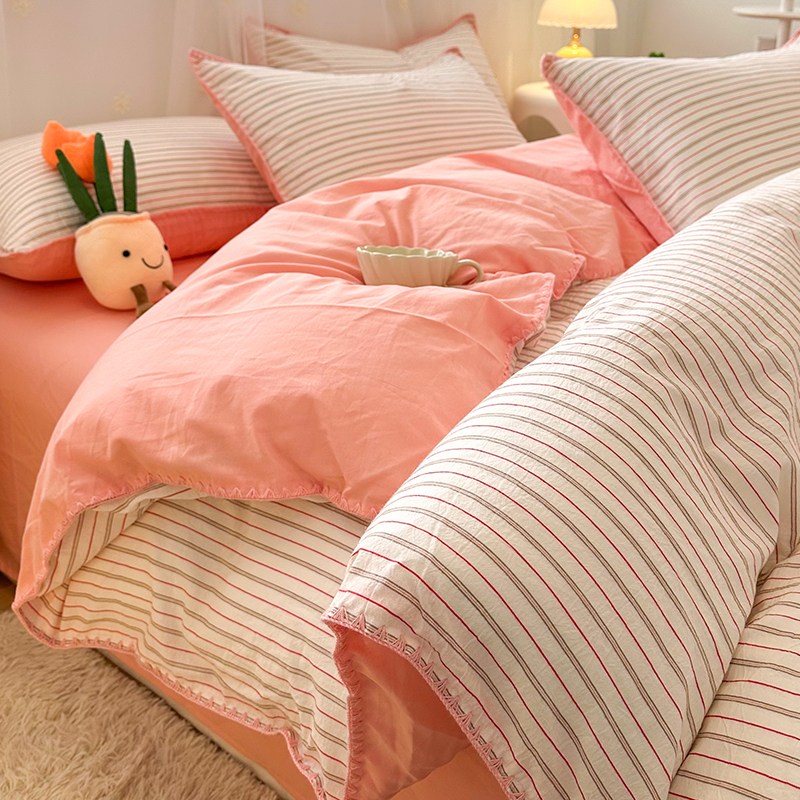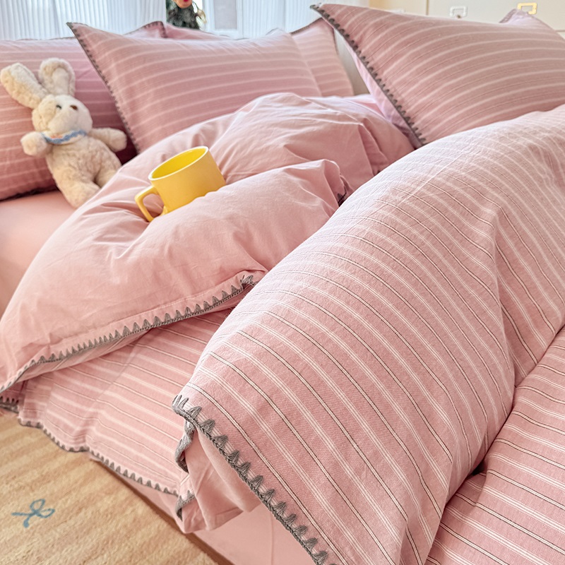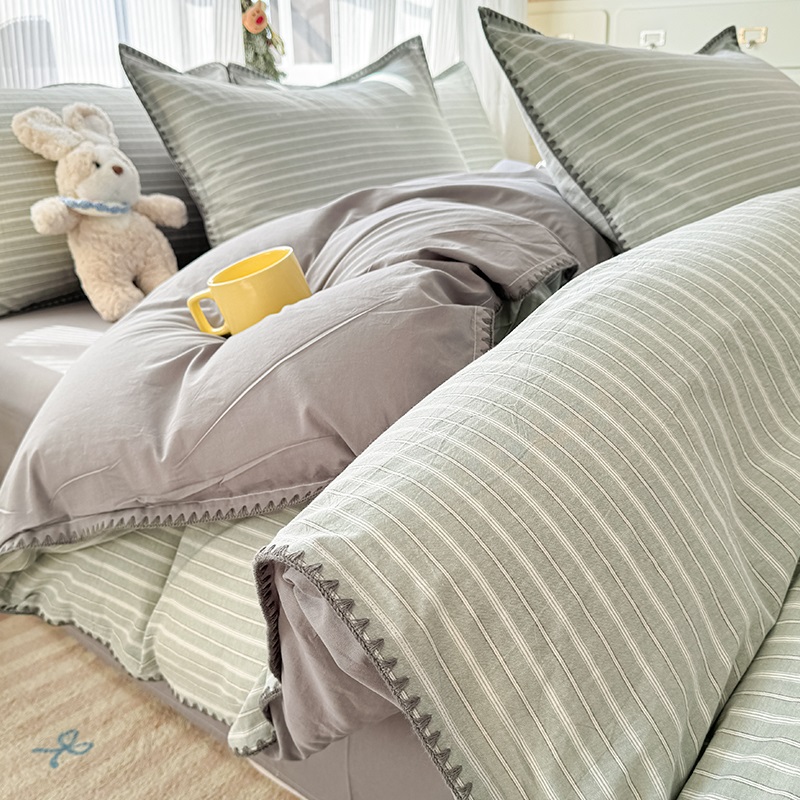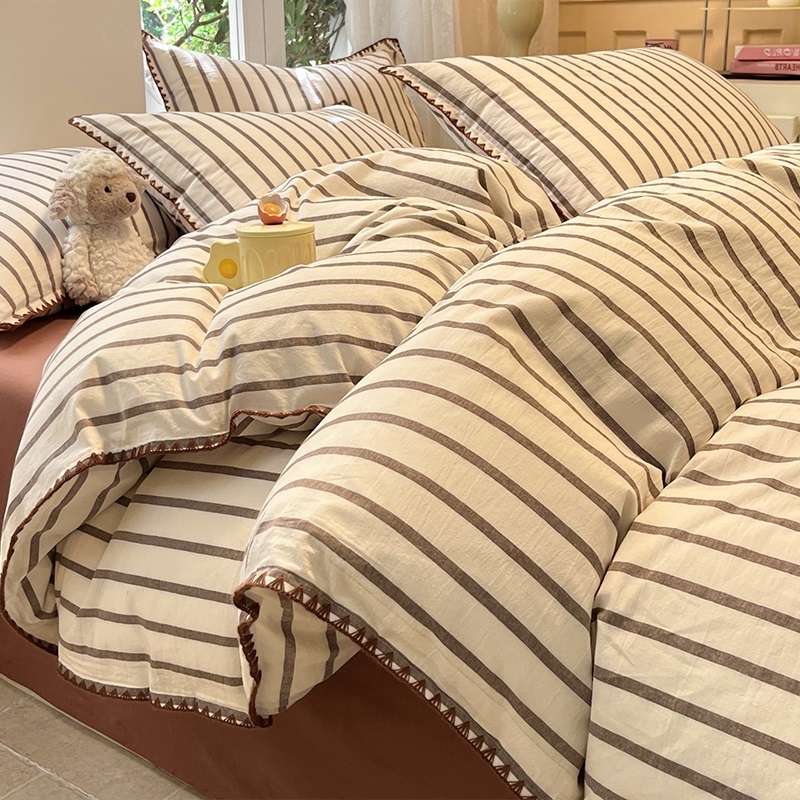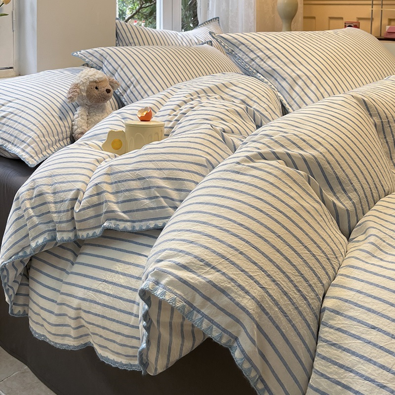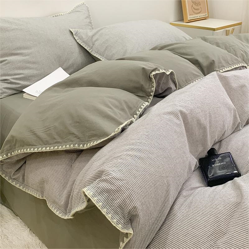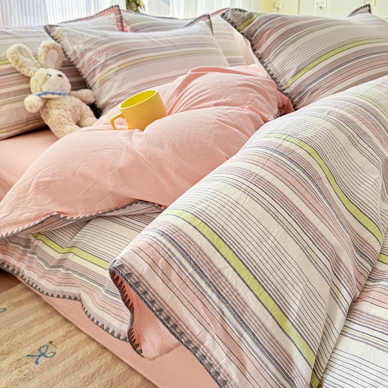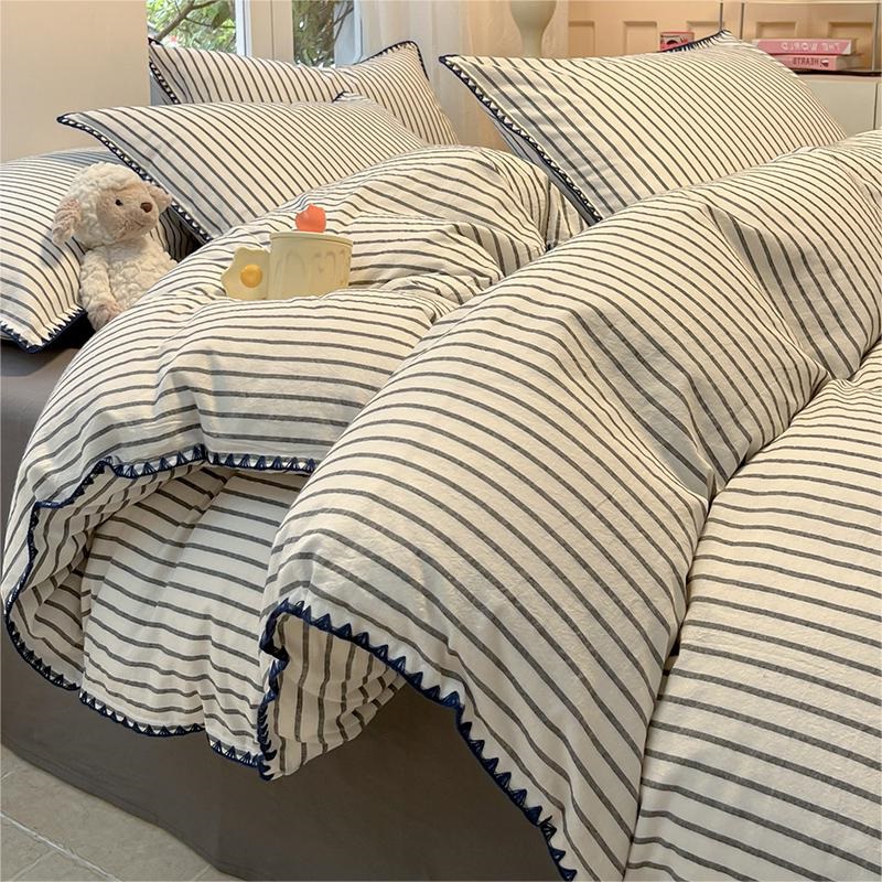 심플 스타일 코튼 워시면 4 피스 코튼 침구 2025 새로운 기숙사 스트라이프 퀼트 커버 시트 3스토어 가기