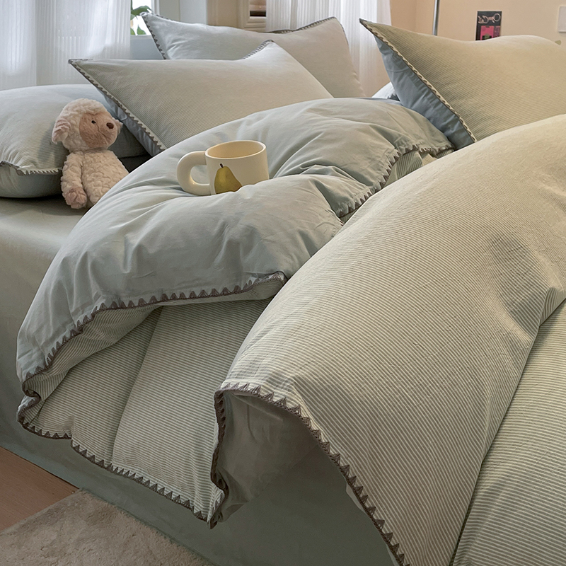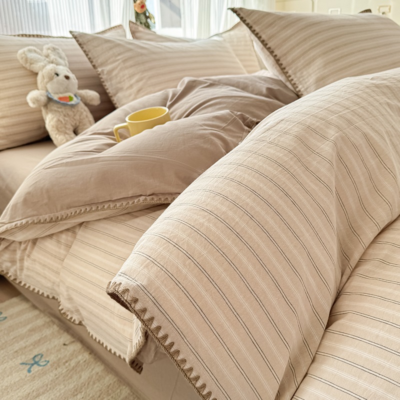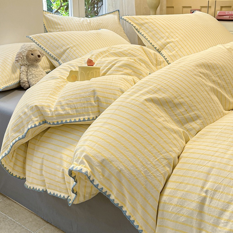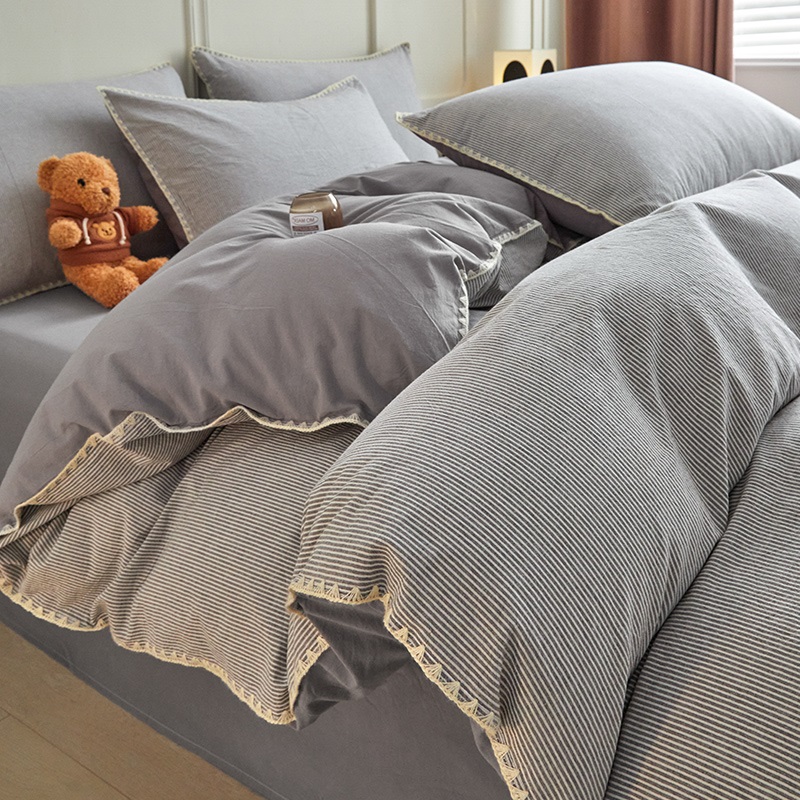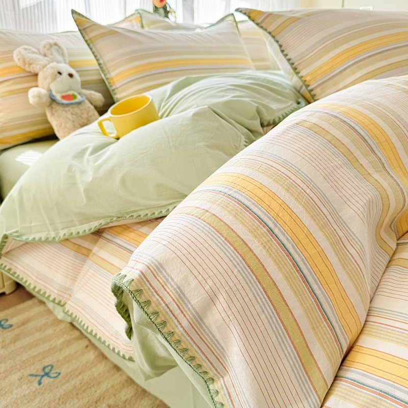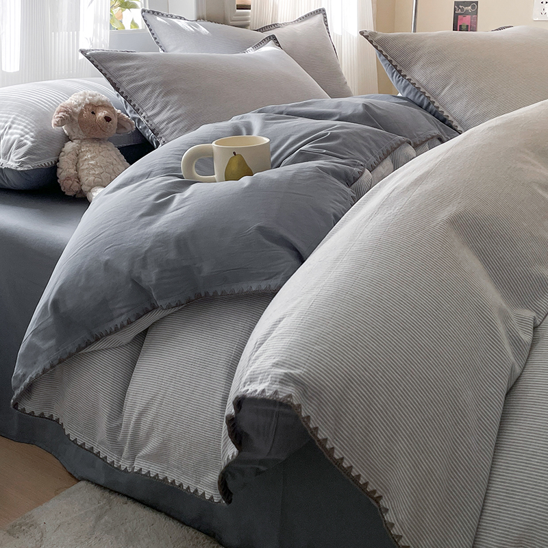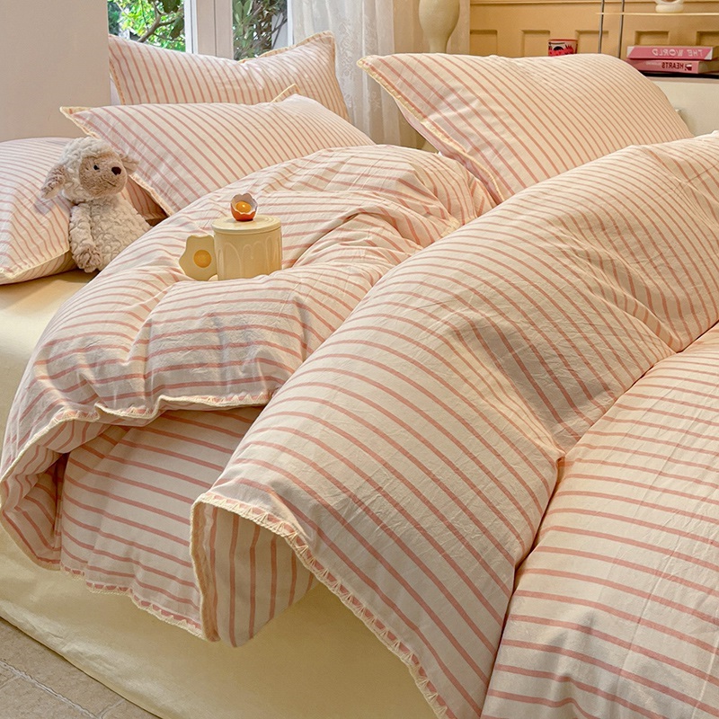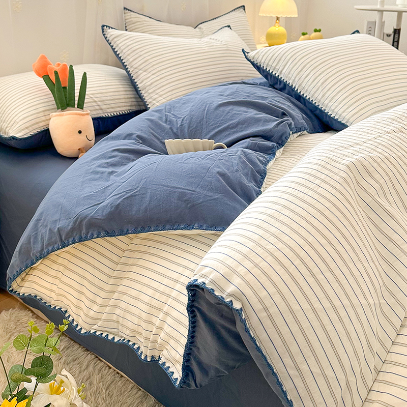 심플 스타일 코튼 워시면 4 피스 코튼 침구 2025 새로운 기숙사 스트라이프 퀼트 커버 시트 3스토어 가기