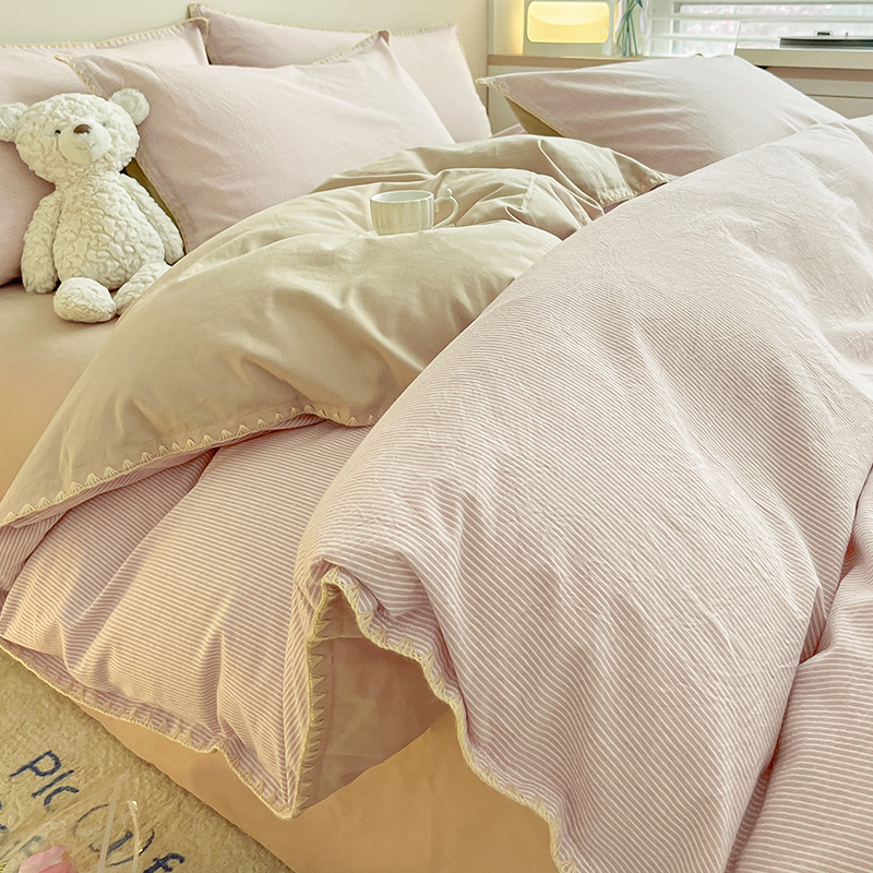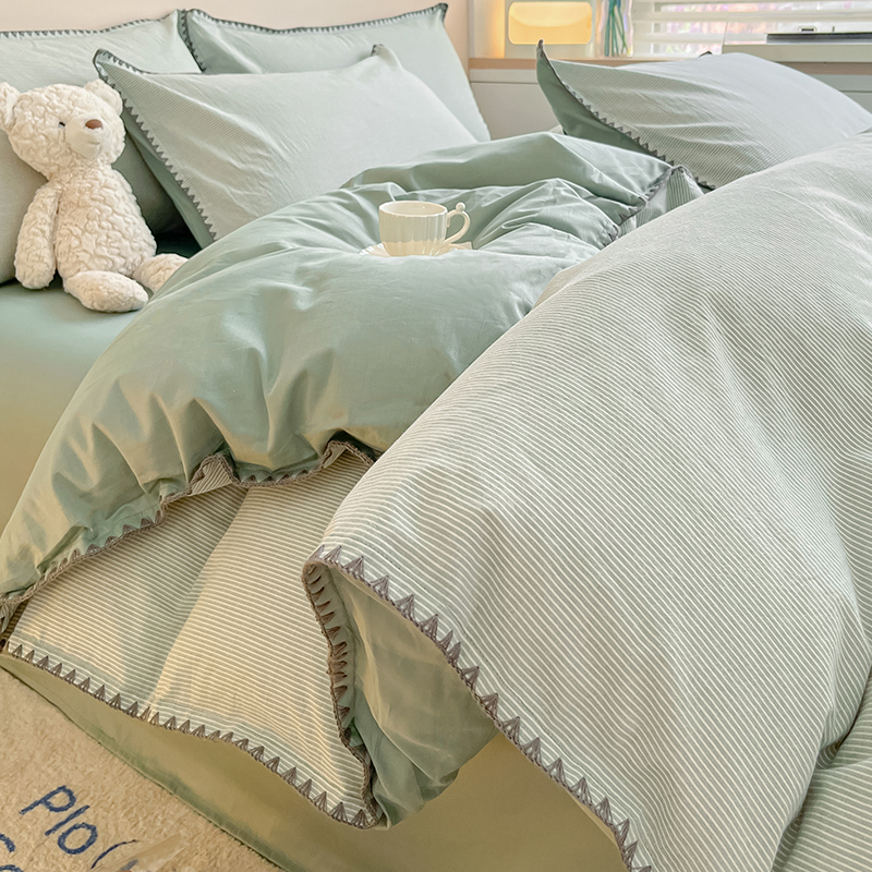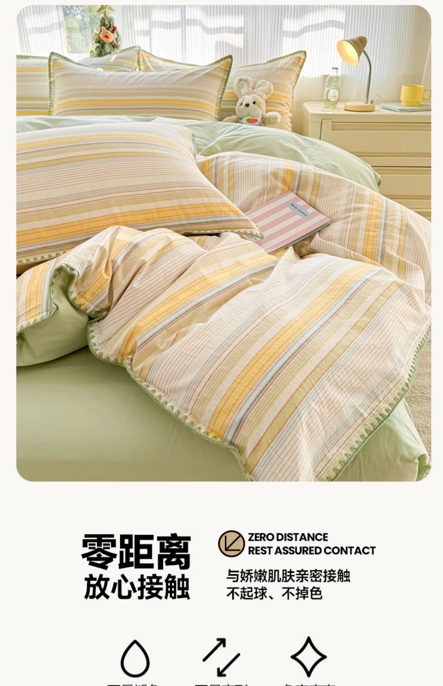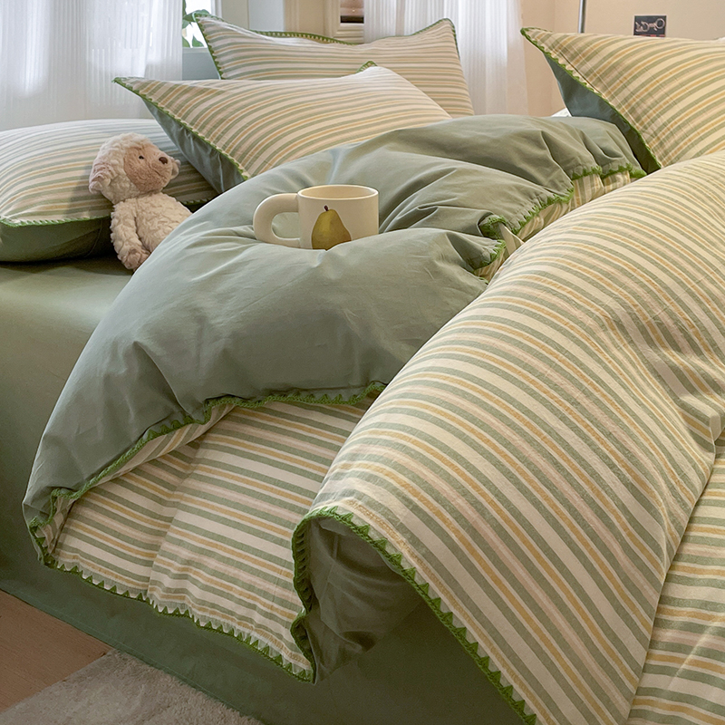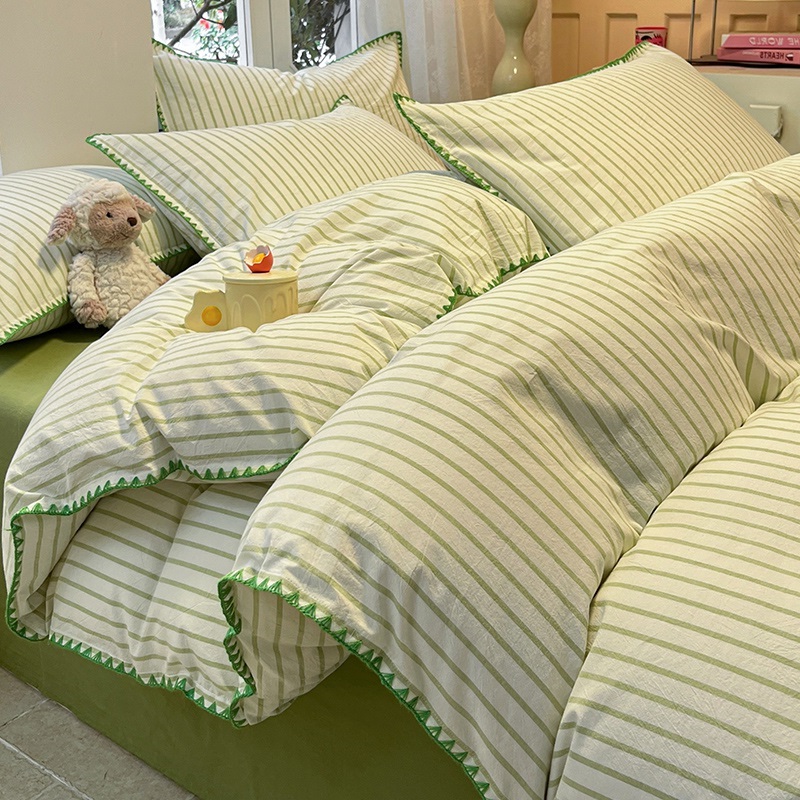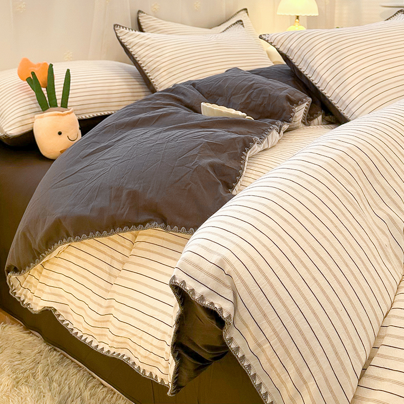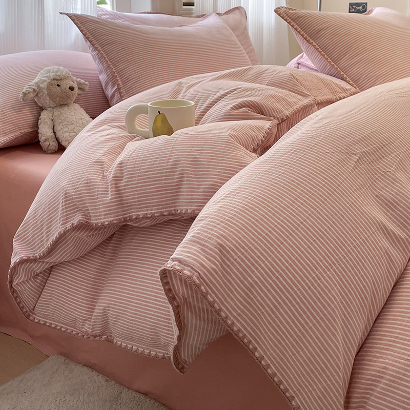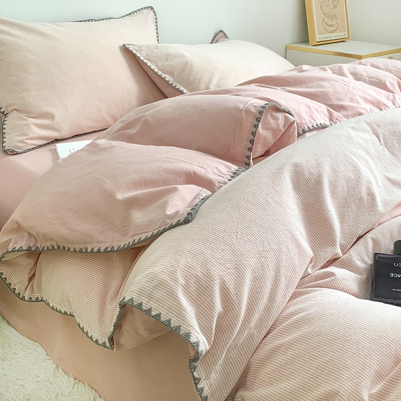 심플 스타일 코튼 워시면 4 피스 코튼 침구 2025 새로운 기숙사 스트라이프 퀼트 커버 시트 3스토어 가기