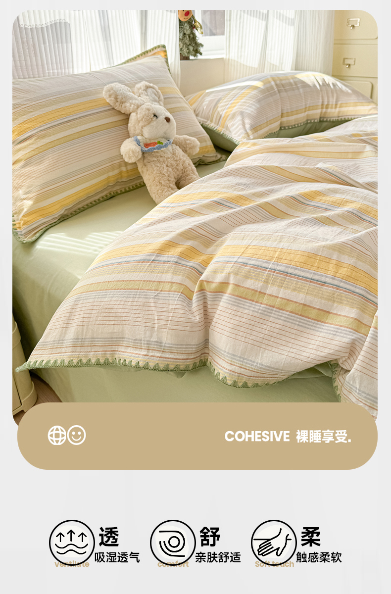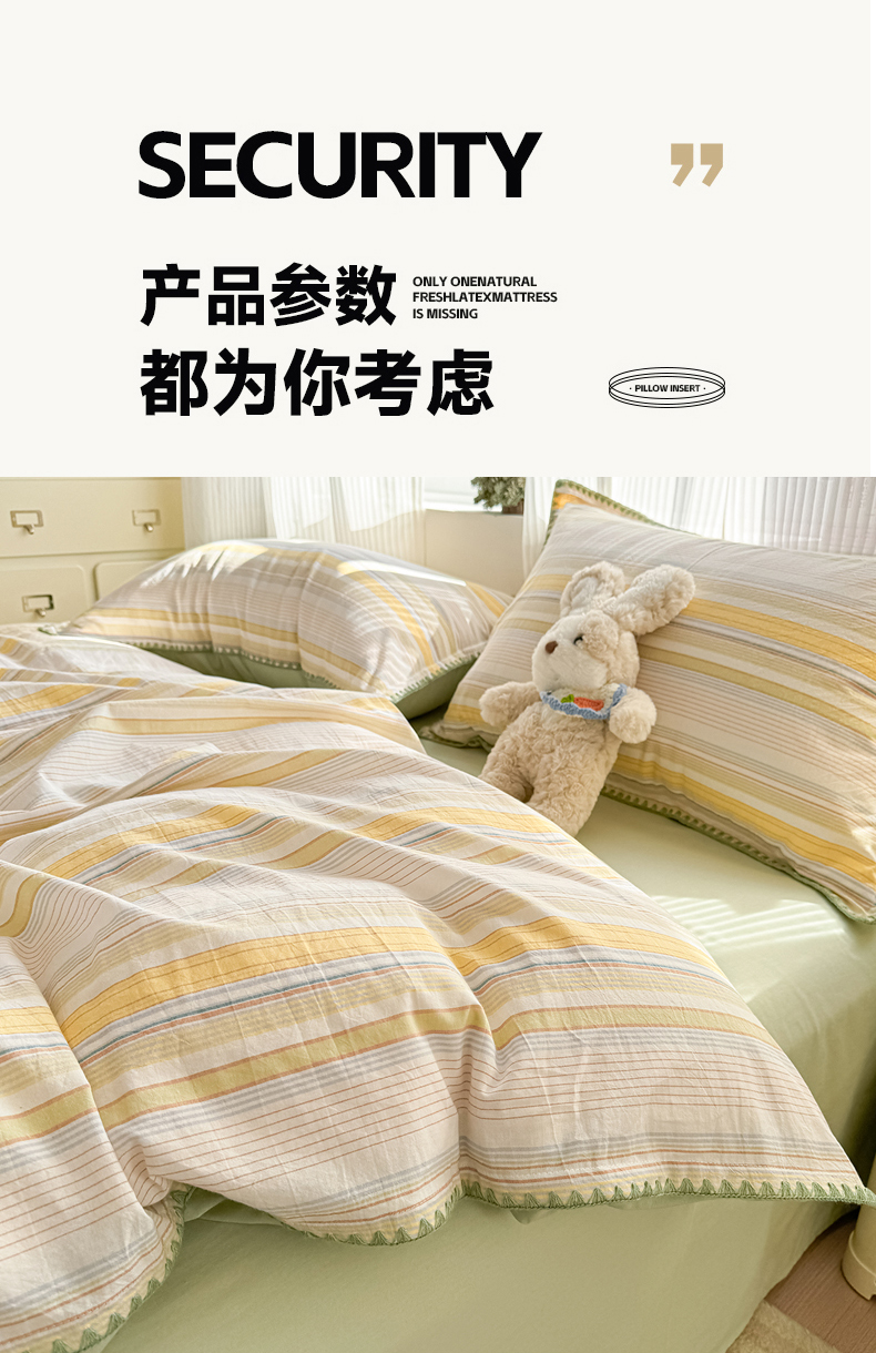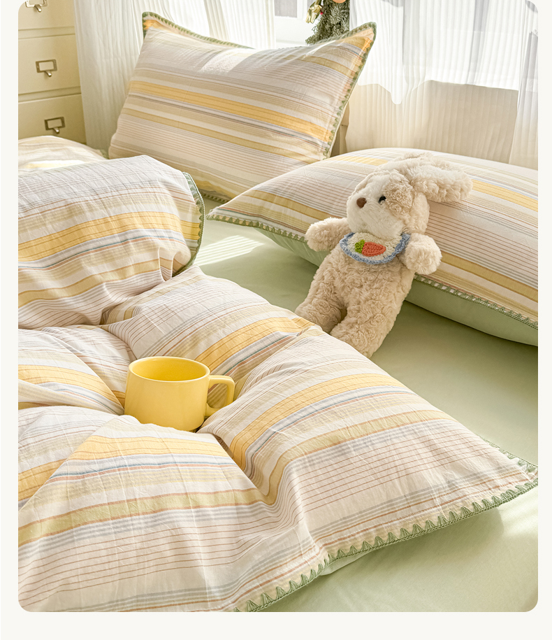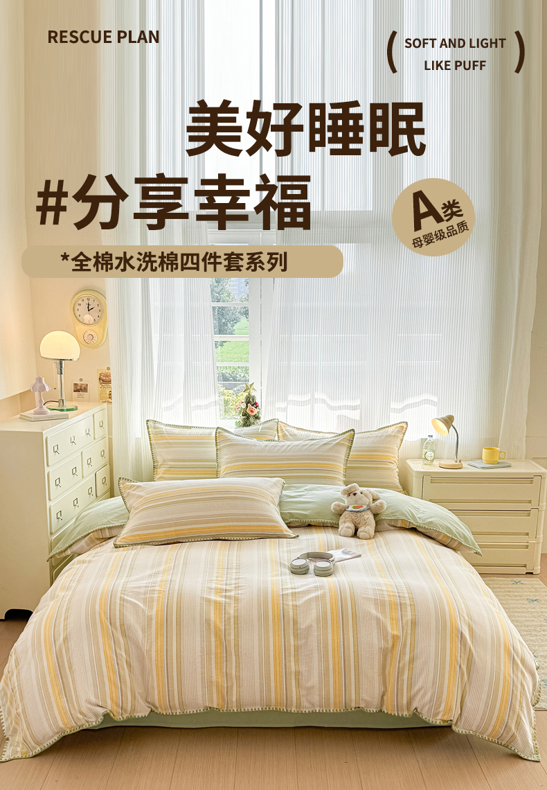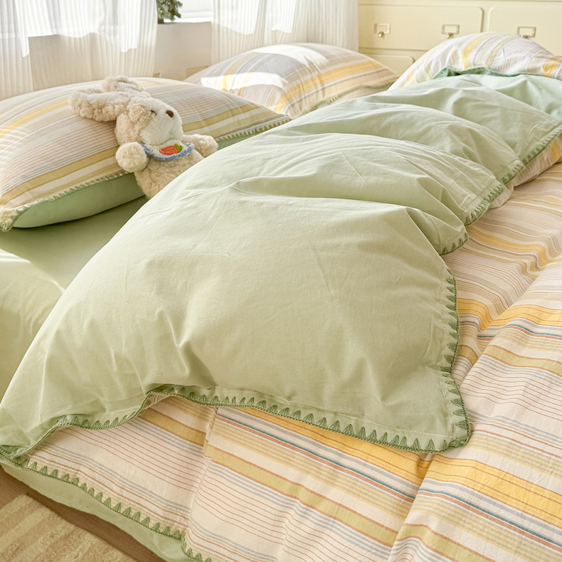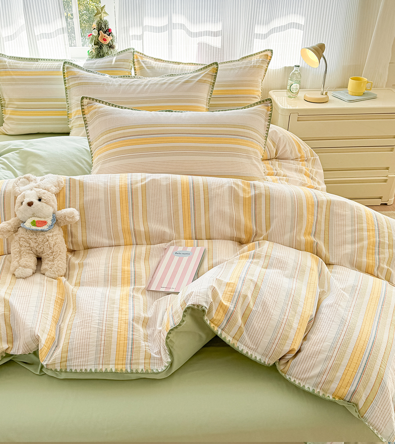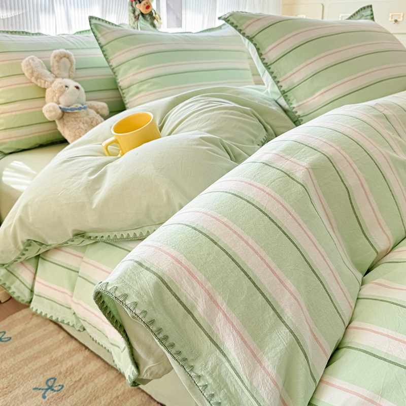 심플 스타일 코튼 워시면 4 피스 코튼 침구 2025 새로운 기숙사 스트라이프 퀼트 커버 시트 3스토어 가기