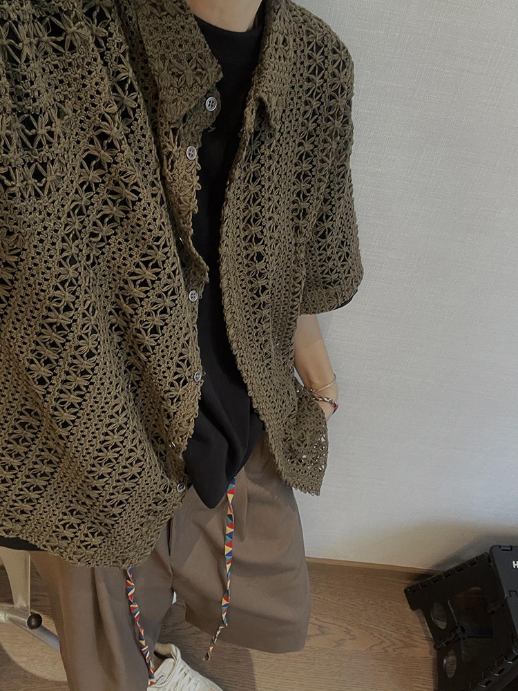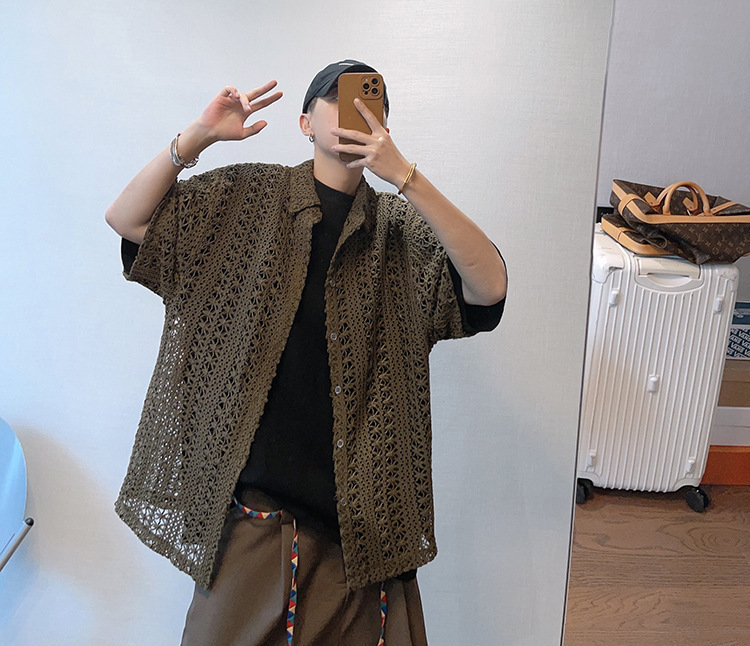 여름 아메리칸 스타일 레트로 앤티크 다목적 카키 앤티크 니트 할로우 통기성 느슨한 휴가 남성용 반팔 셔츠스토어 가기