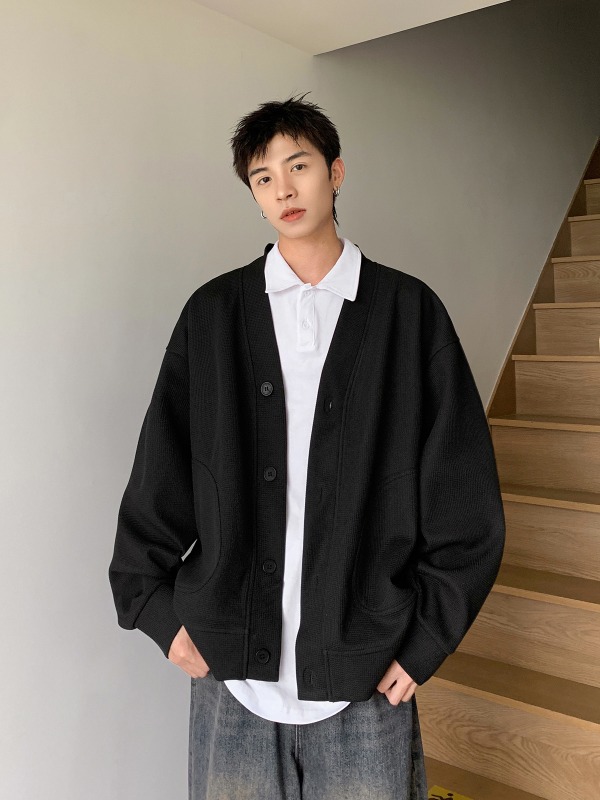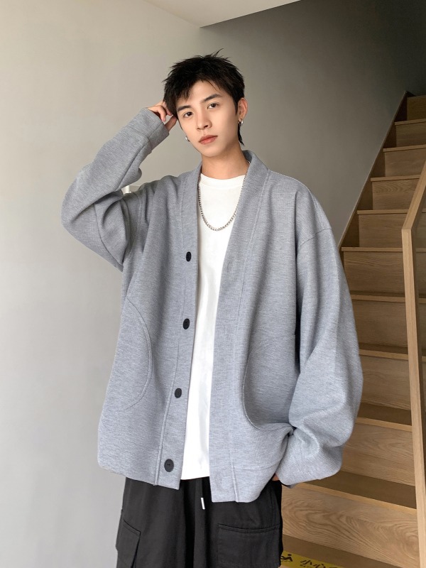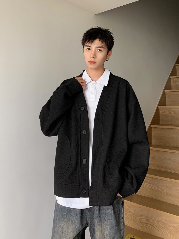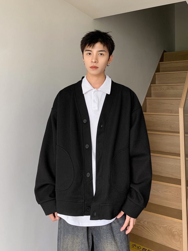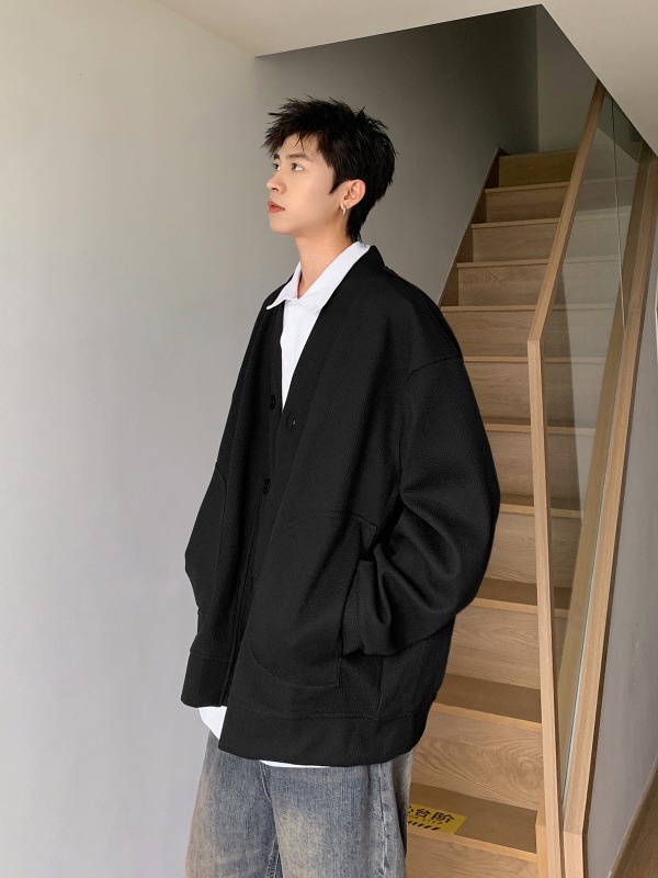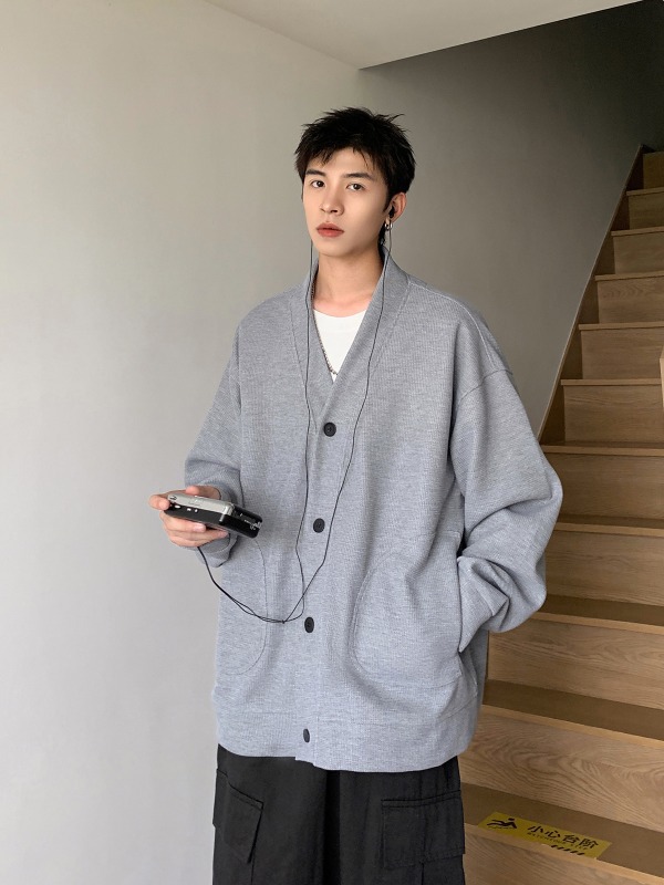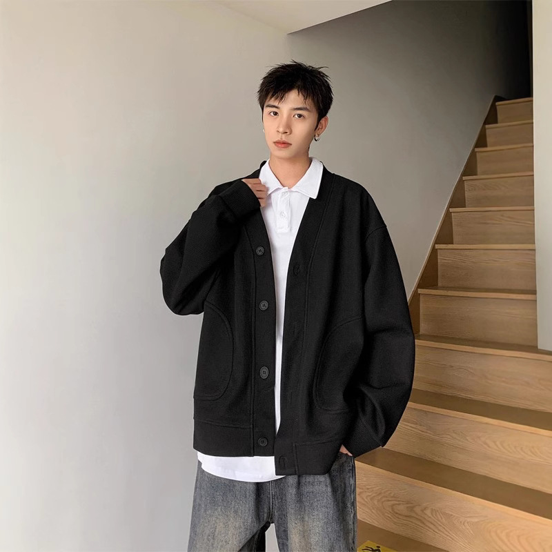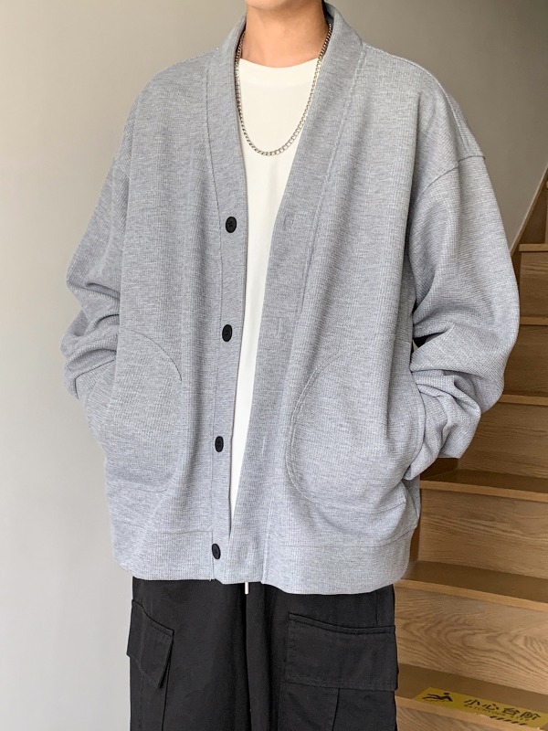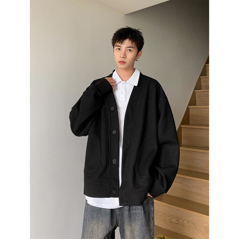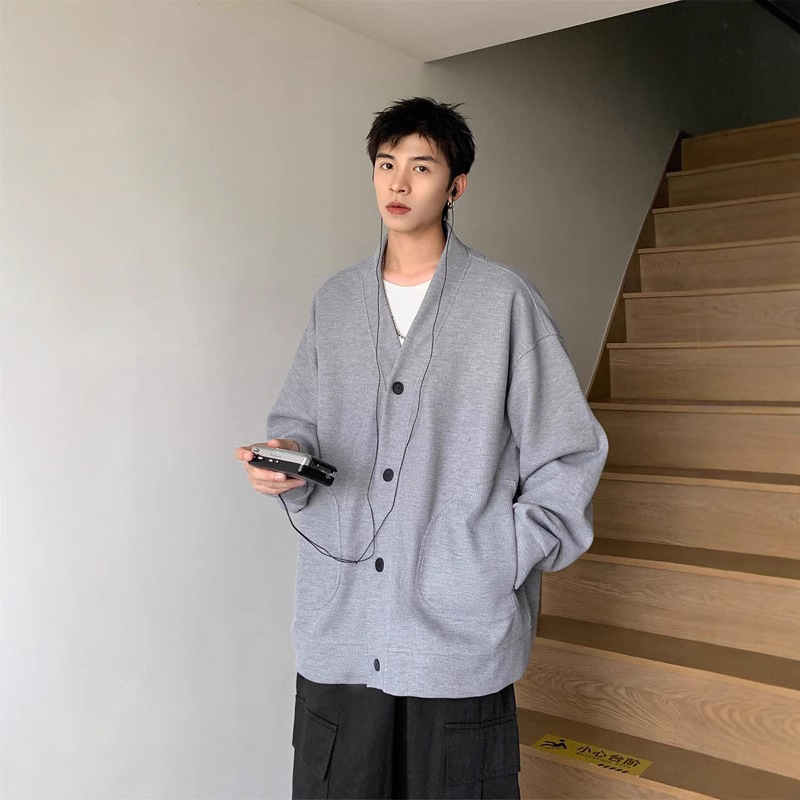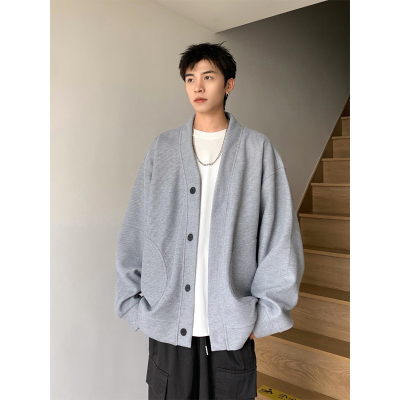 와플 카디건 스웨터 남성용 루즈 V 넥 긴팔 인스 타 그램 인기 브랜드 봄과 가을 올 매치 핸섬 캐주얼 게으른 스타일 재킷스토어 가기
