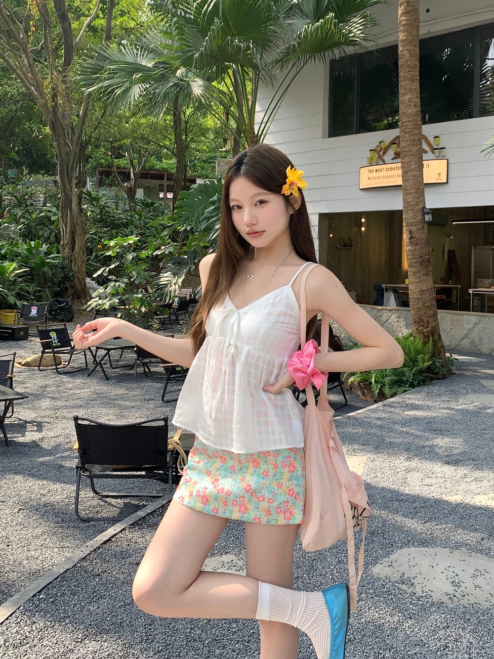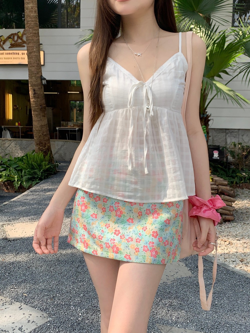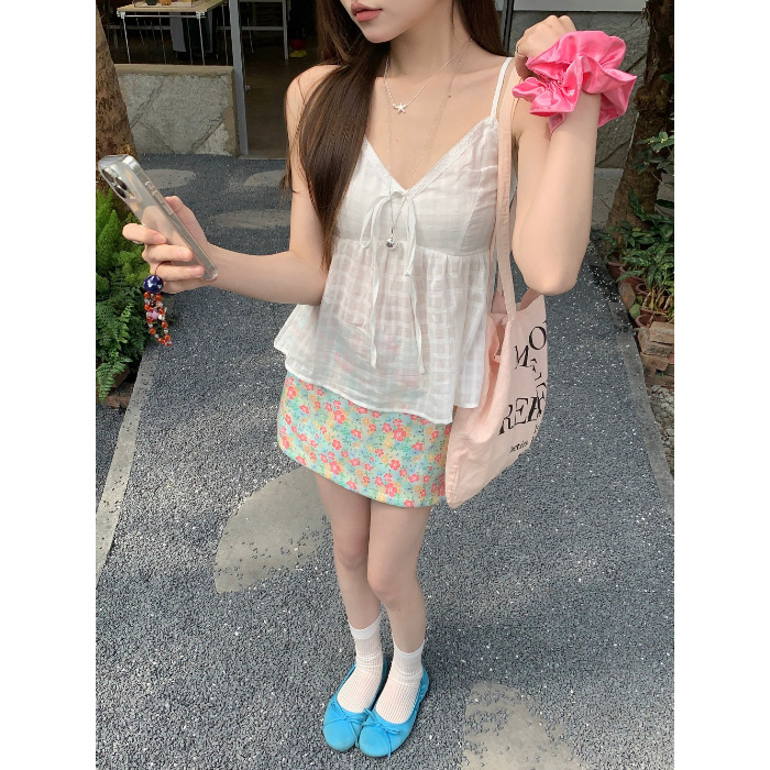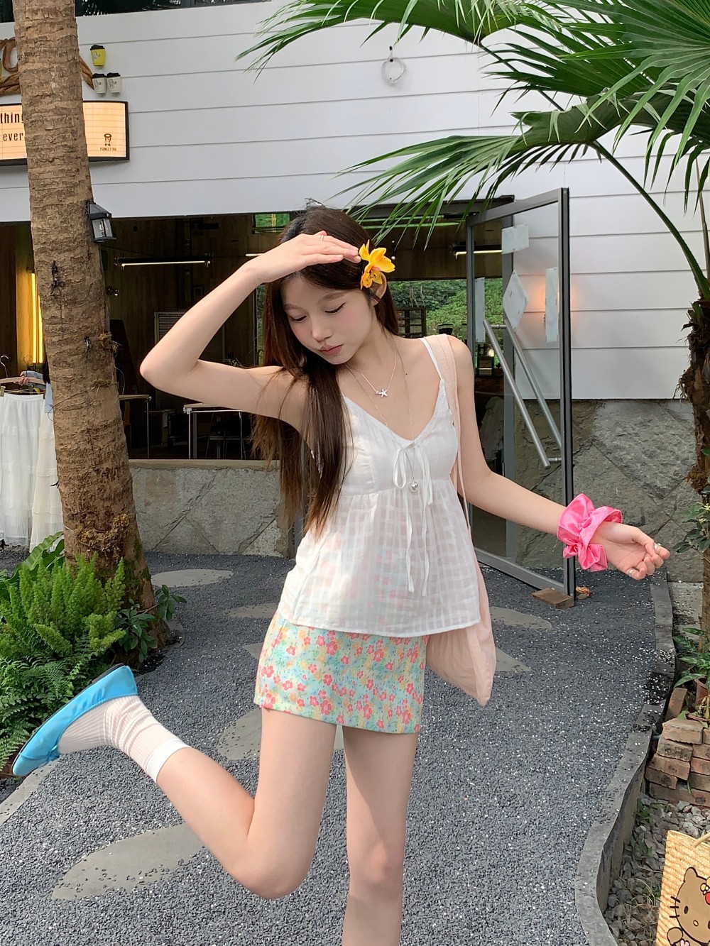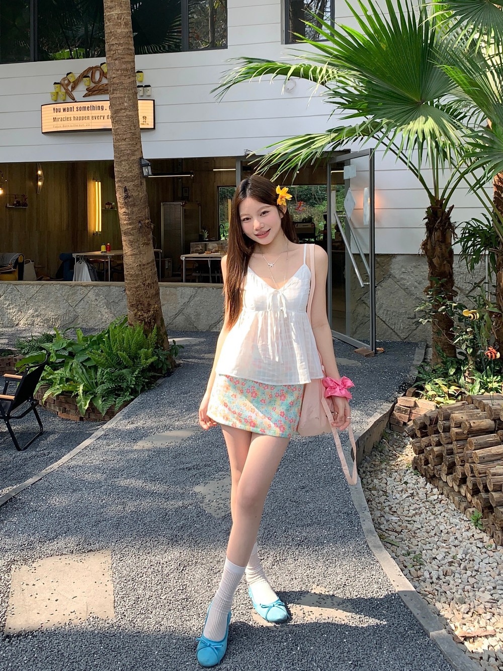 쿠미 쿠미 스위트 스타일 세트 레이스 업 화이트 카미솔 여성의 여름 꽃 힙합 스커트 투피스 세트