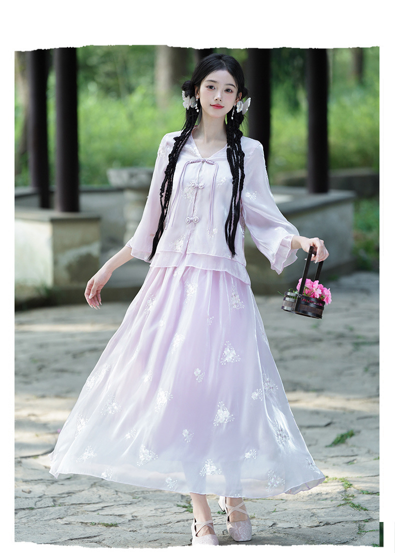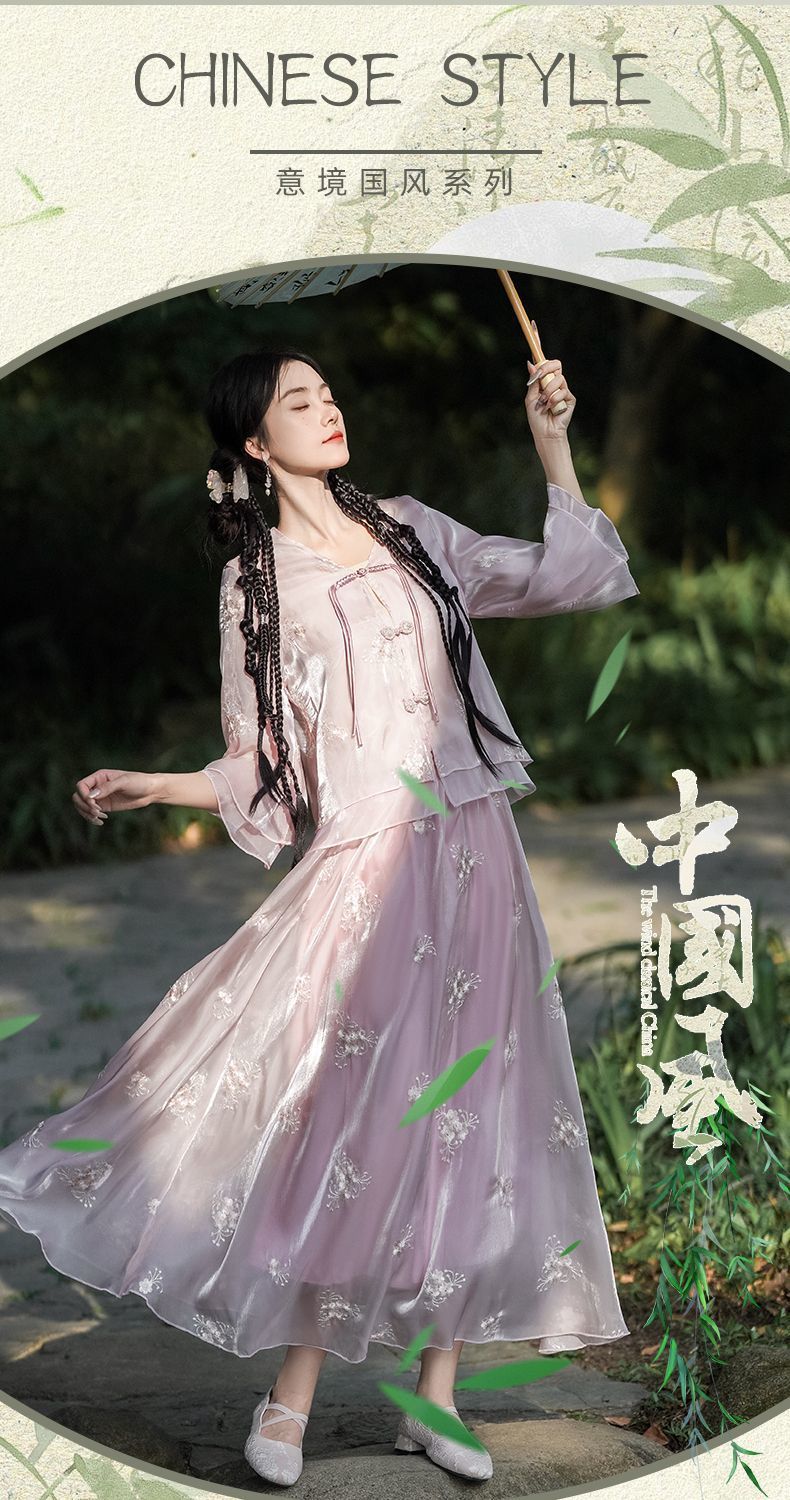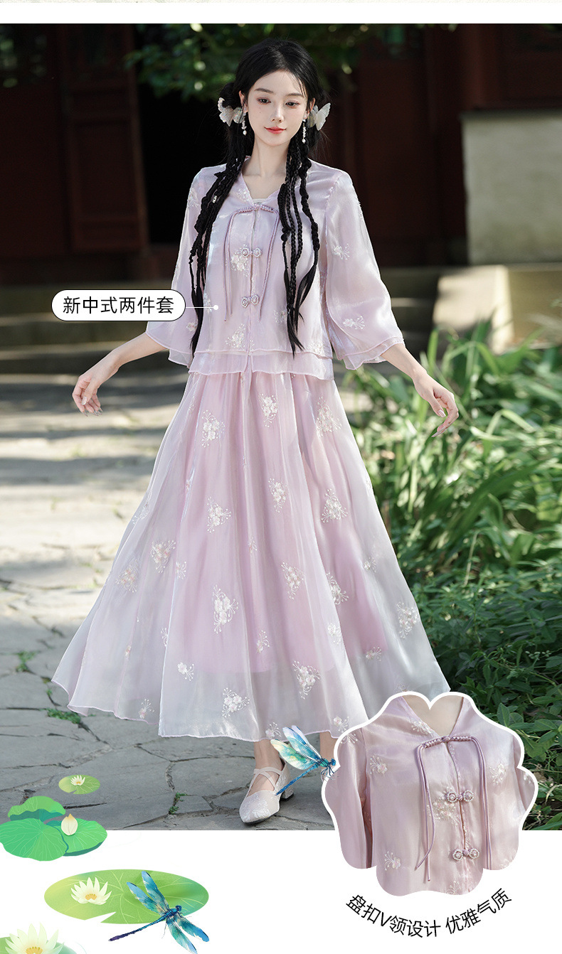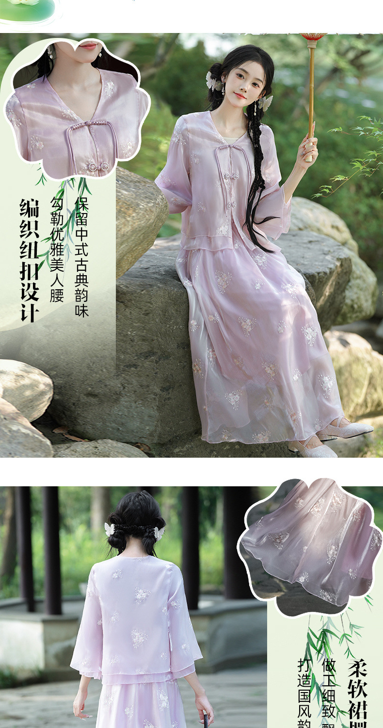 새로운 중국 스타일 빈티지 개선 된 우아한 자수 버클 V 넥 카디건 민족 스타일 미드 슬리브 스커트 여성 세트스토어 가기