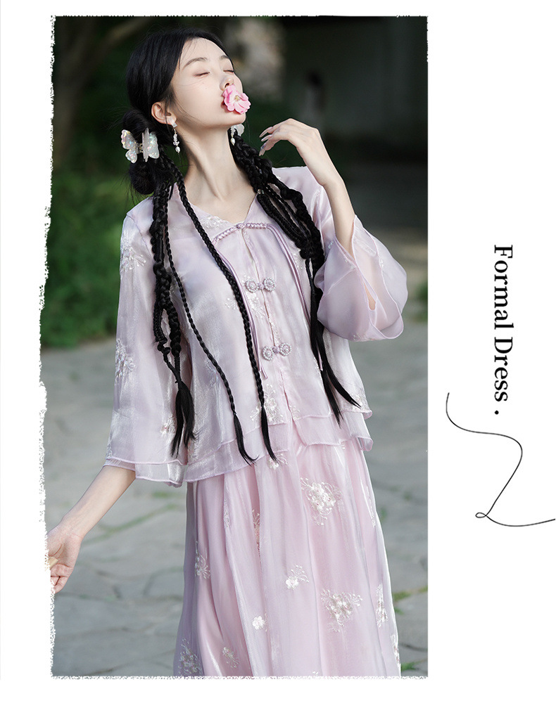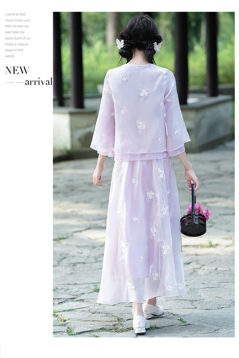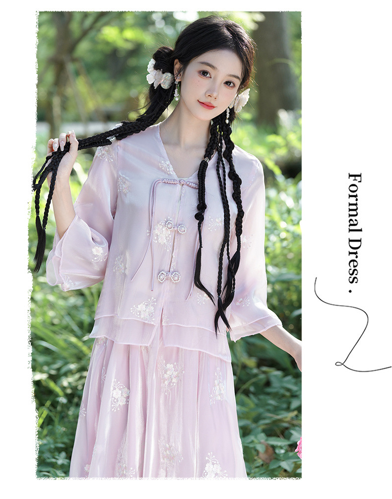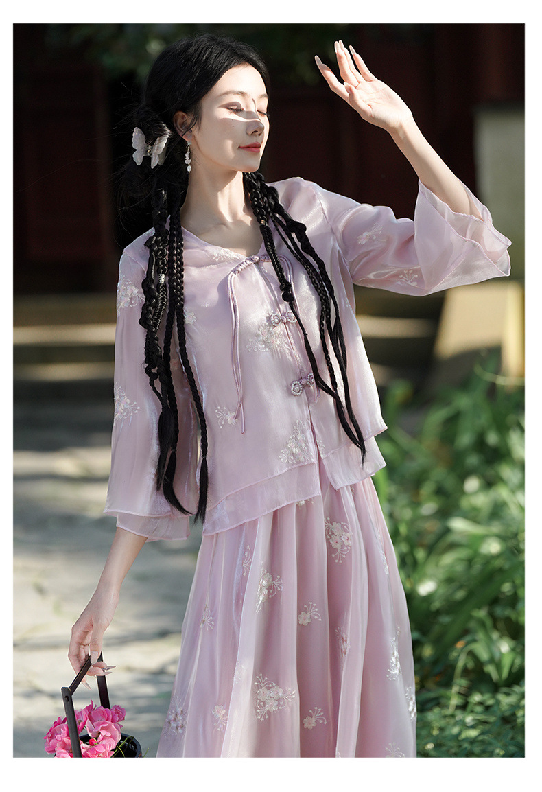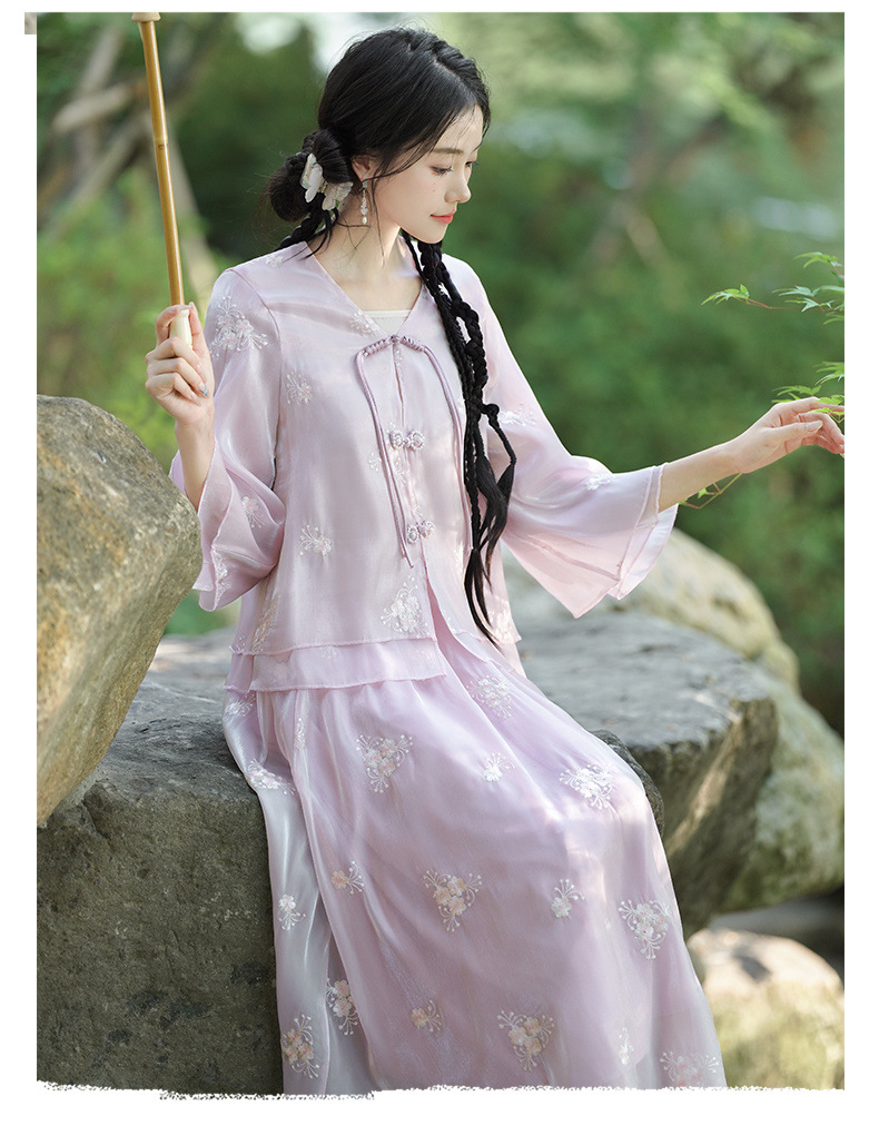 새로운 중국 스타일 빈티지 개선 된 우아한 자수 버클 V 넥 카디건 민족 스타일 미드 슬리브 스커트 여성 세트