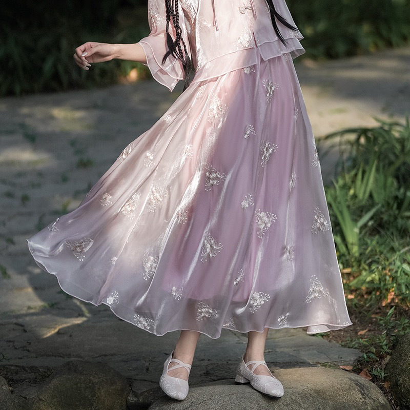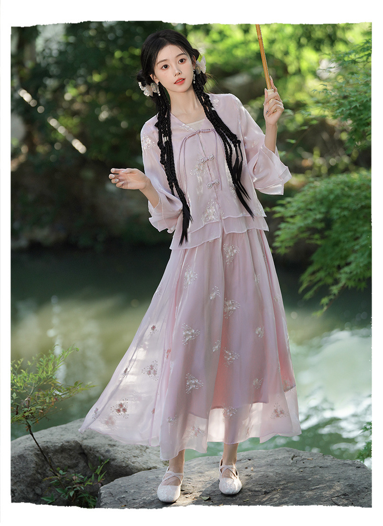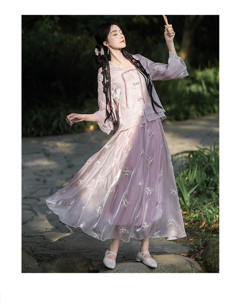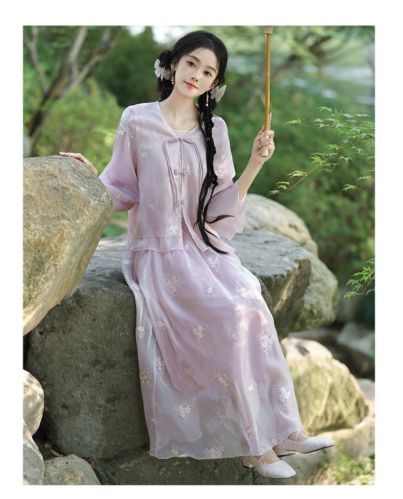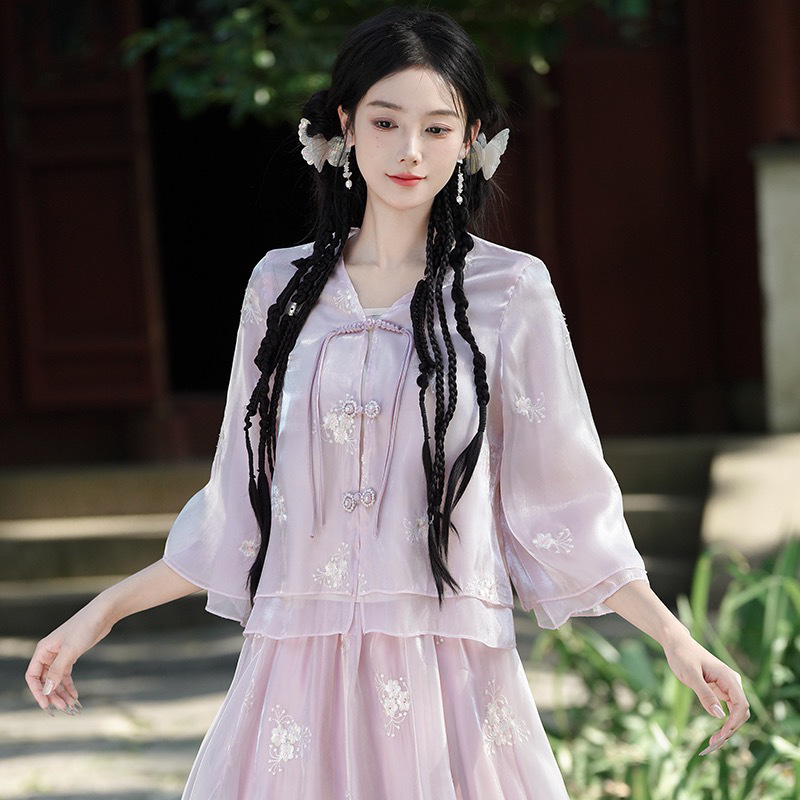 새로운 중국 스타일 빈티지 개선 된 우아한 자수 버클 V 넥 카디건 민족 스타일 미드 슬리브 스커트 여성 세트