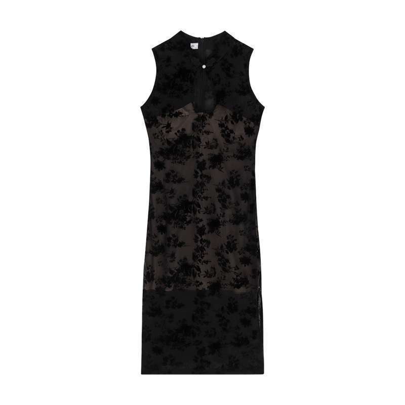 새로운 중국 스타일 개선 된 청삼 민소매 조끼 원피스 여성 여름 블랙 스플릿 허리 중간 길이 엉덩이 스커트