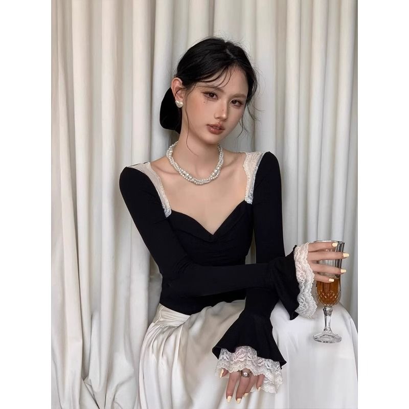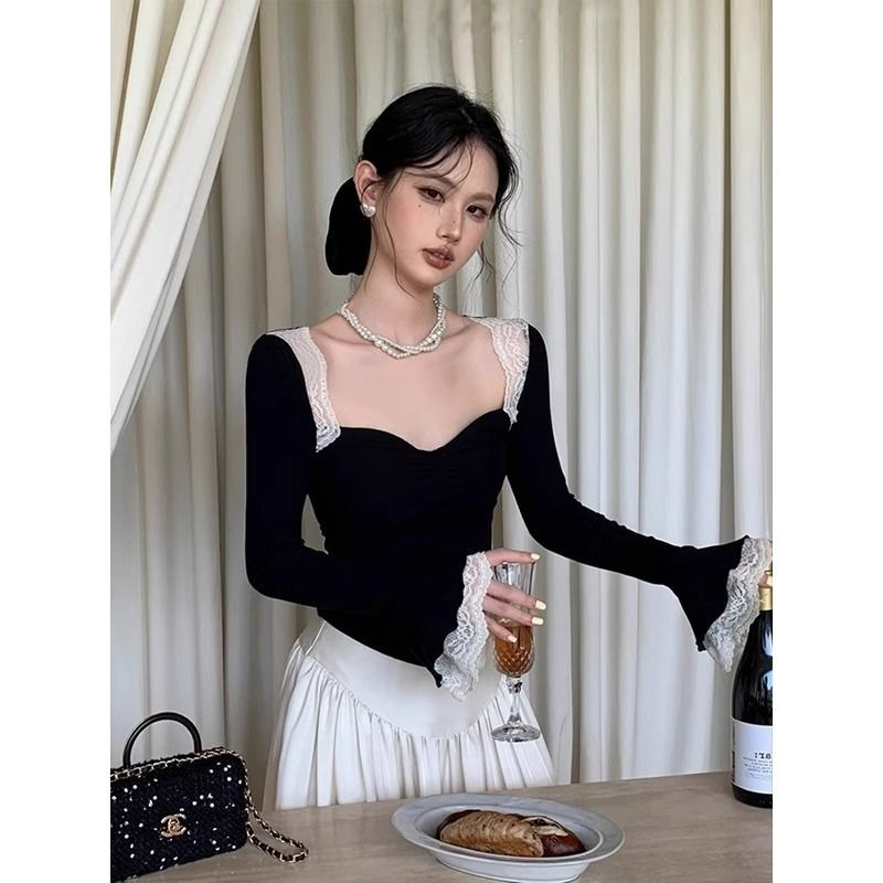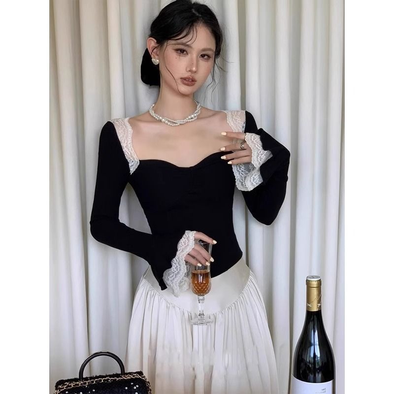 스티칭 레이스 핫 걸 스타일 올 매치 스퀘어 넥 티셔츠 혼 슬리브 콘트라스트 컬러 슬림 핏 슬리밍 쇼트베이스 셔츠 탑 트렌디