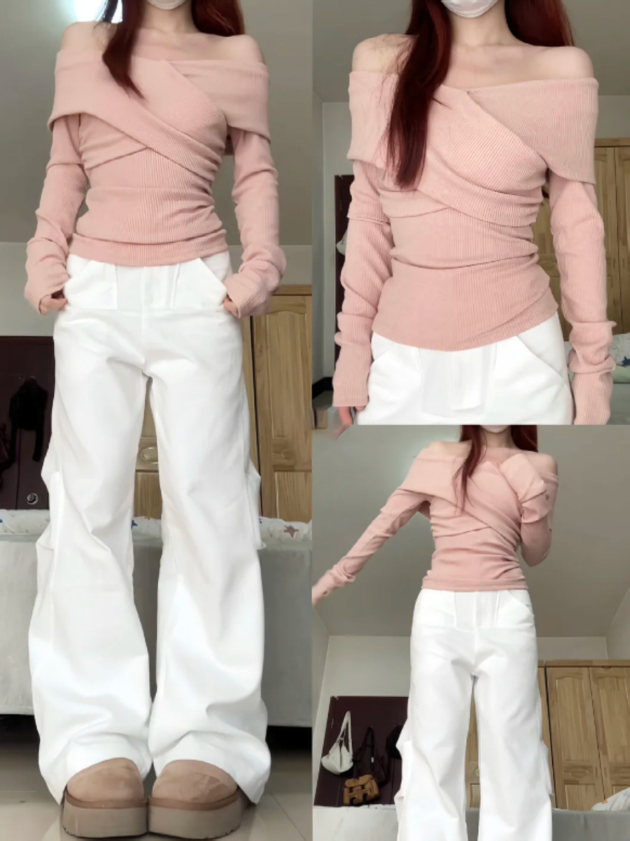 핑크 부드러운!!! [크로스 셔츠] 달콤한 스파이스 소녀 긴팔 티셔츠 여성 분위기 슬림 어깨스토어 가기