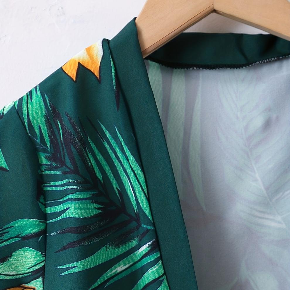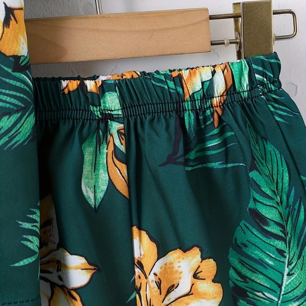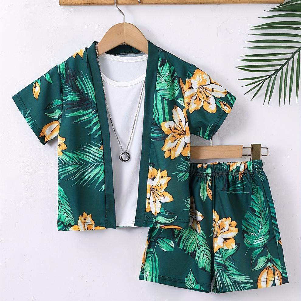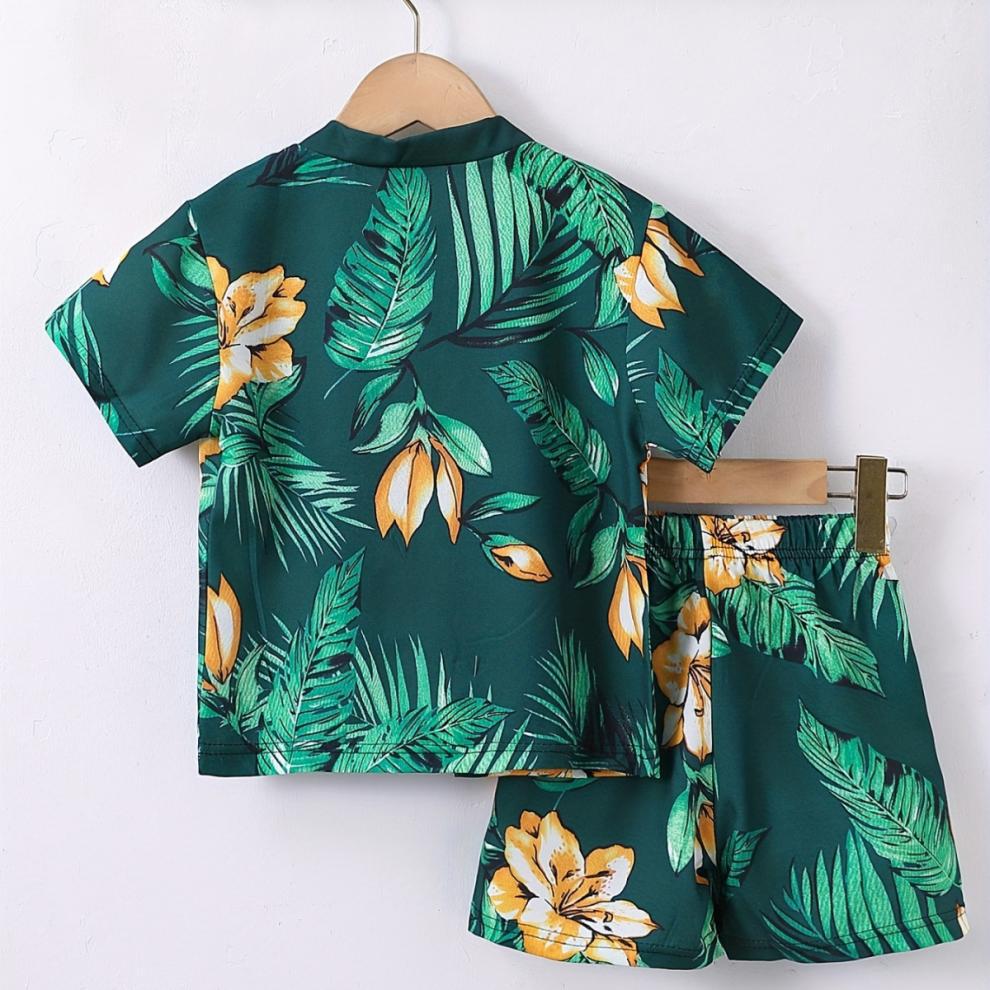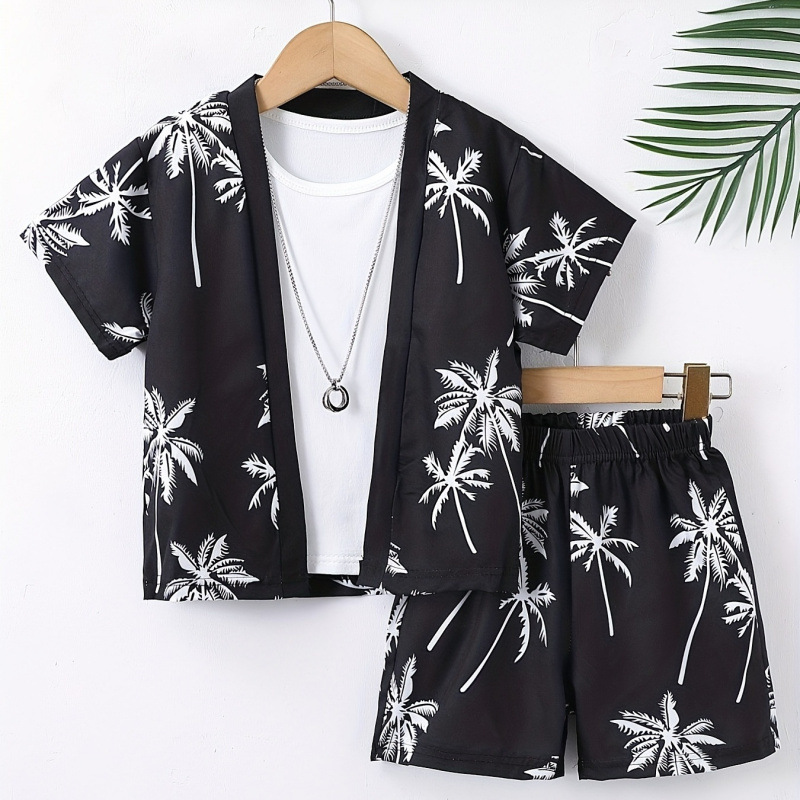 여름 어린이 남성 보물 여행 해변 녹색 코코넛 나무 가짜 스타일 반팔 카디건 인쇄 반바지 투피스 세트