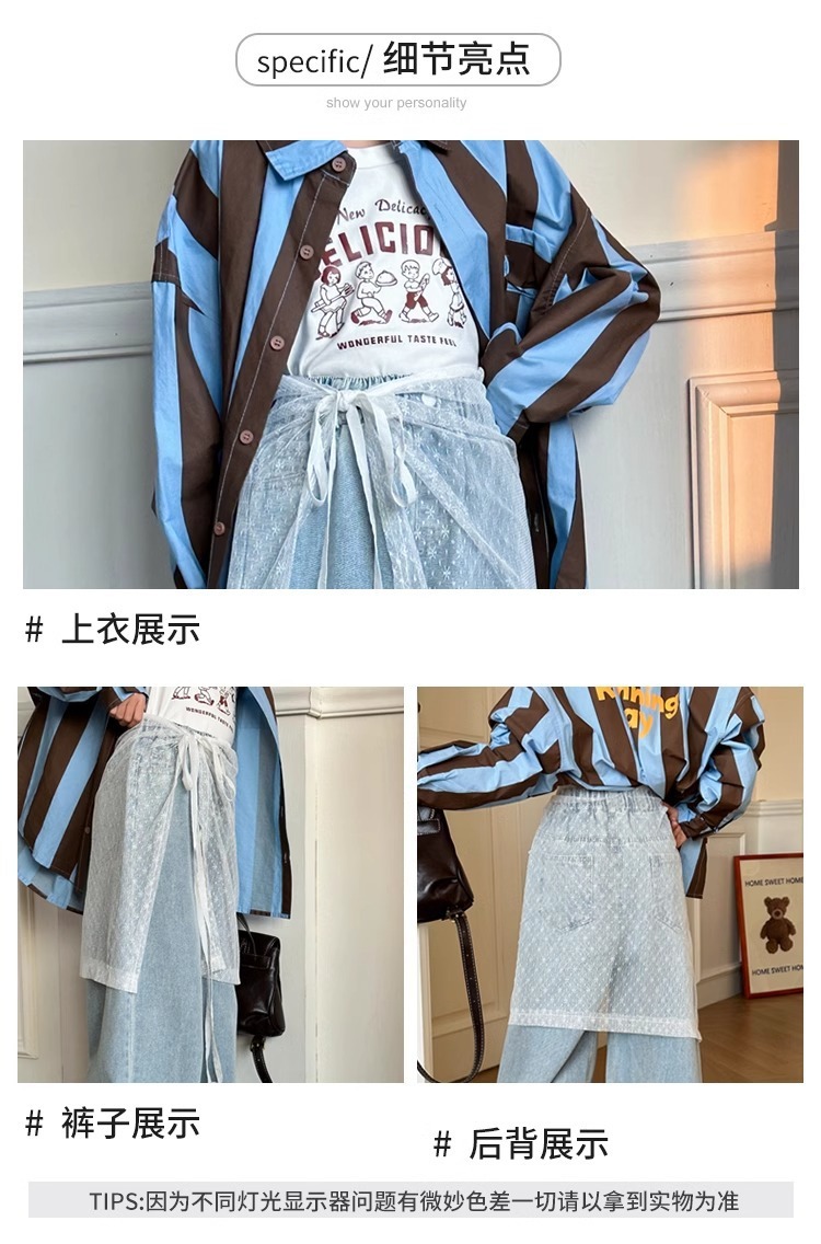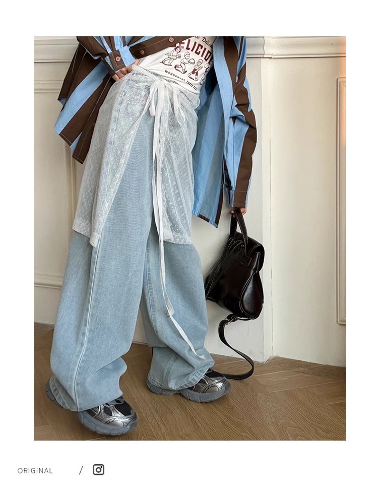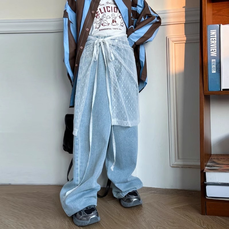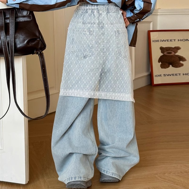 소녀 레이스 방귀 커튼 넓은 다리 바지 2025 봄과 가을 새로운 틈새 스트랩 중년 및 대형 어린이를위한 독특한 스택 청바지스토어 가기