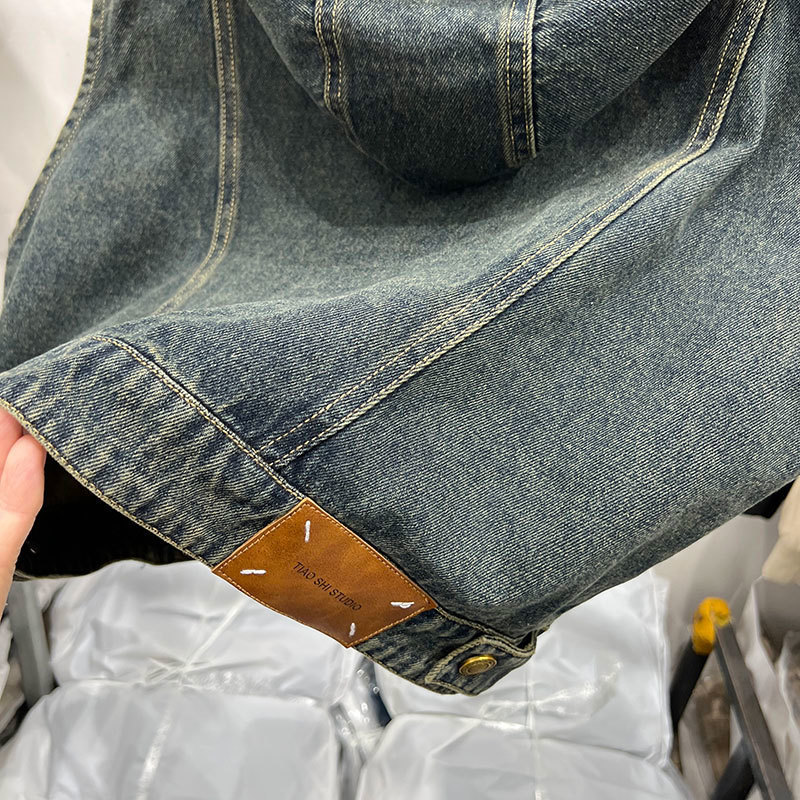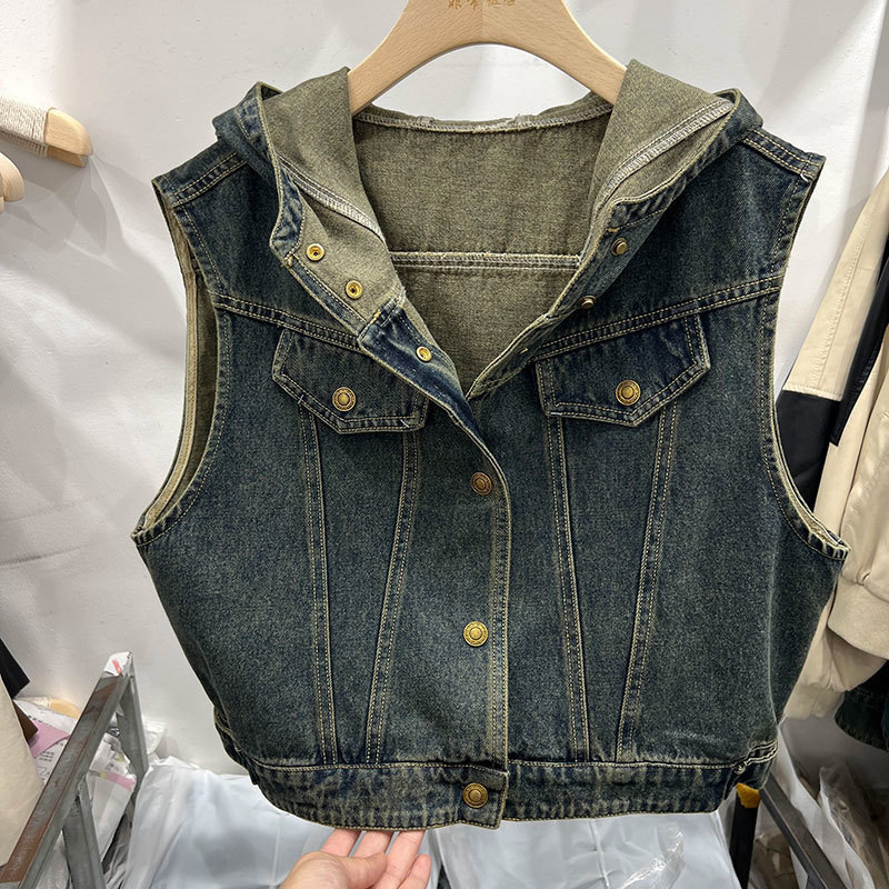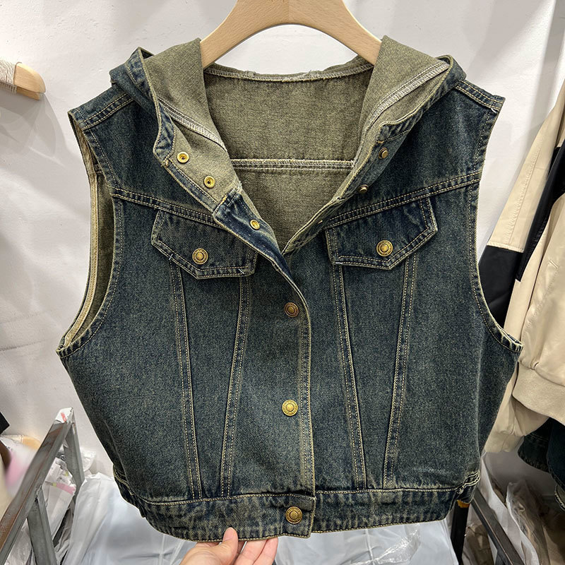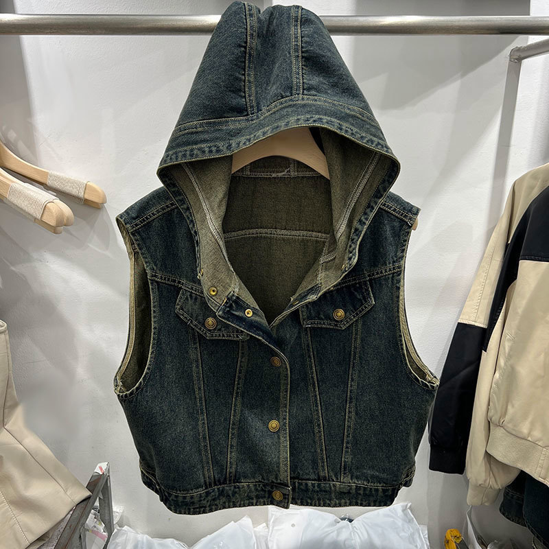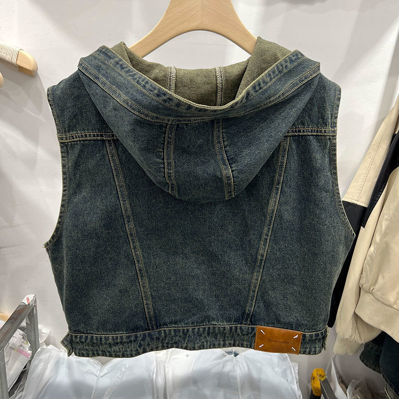 후드 쇼트 데님 조끼 코트 여성의 가을 2024 새로운 느슨한 슬리밍 디자인 센스 민소매 조끼 탑스토어 가기