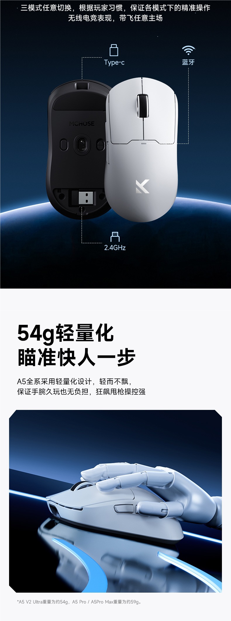 MCHOSEA5 무선 게임 마우스 블루투스 3 모드 PAW3395 E-스포츠 울트라 경량 ProMax