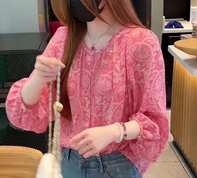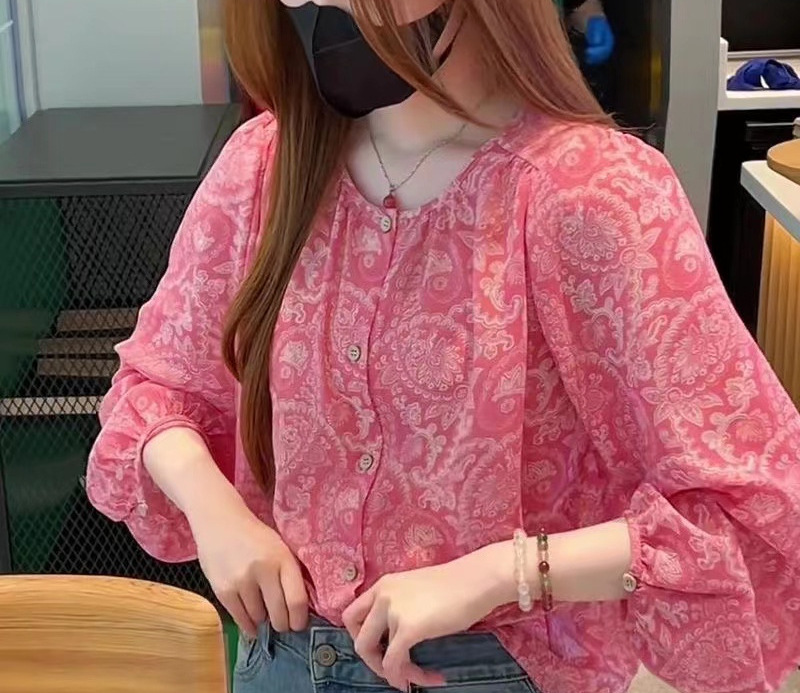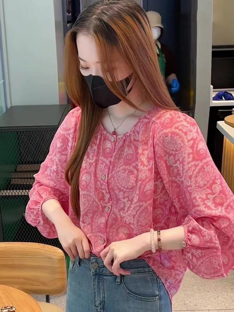 핫 스타일 랜턴 슬리브 긴 소매 쉬폰 탑 여성의 우아한 인쇄 셔츠 2025 봄 새로운 스타일 유행 올 매치