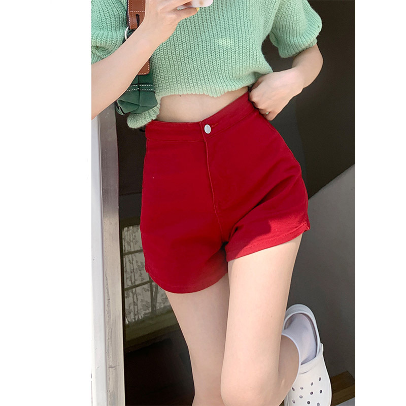 미국 레드 하이 허리 데님 반바지 여성 2025 년 여름 새로운 핫 스타일 스파이스 소녀 타이트한 유행 A-워드 핫 팬츠