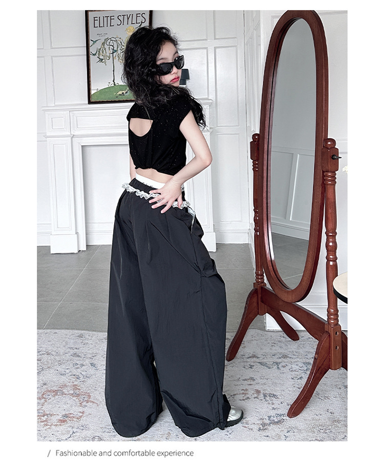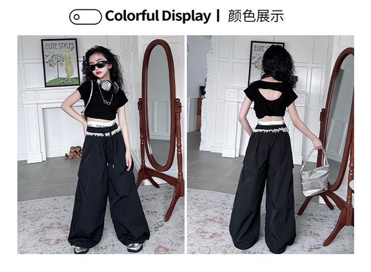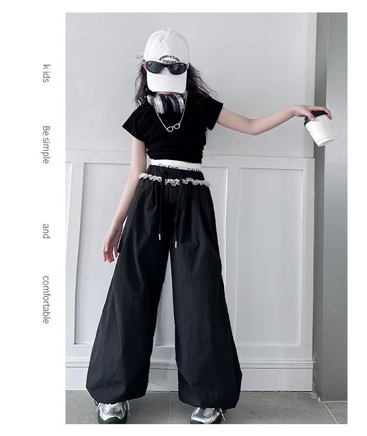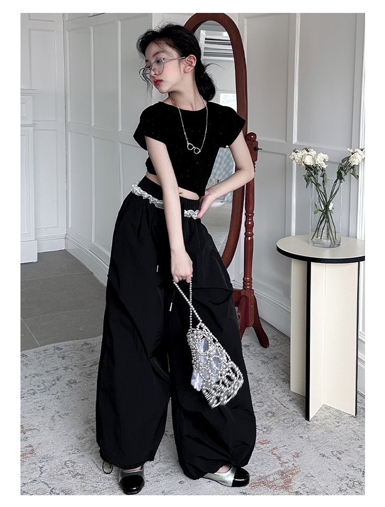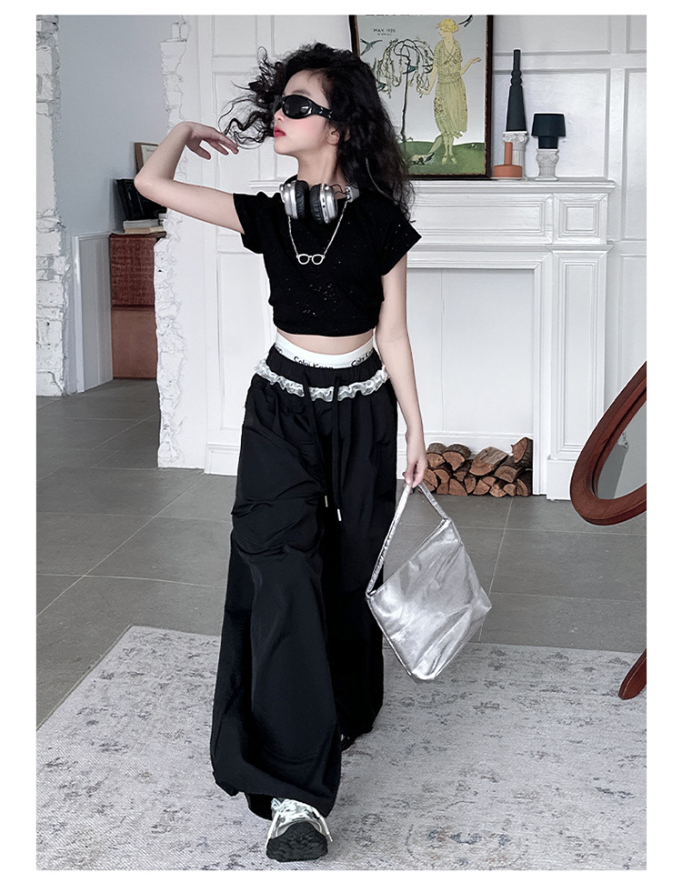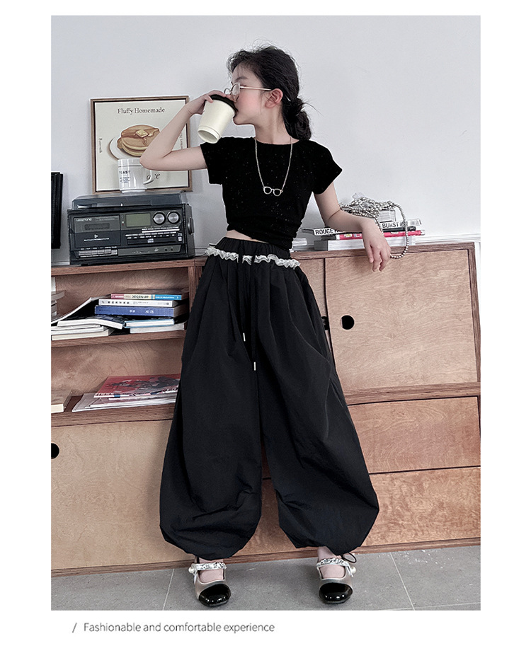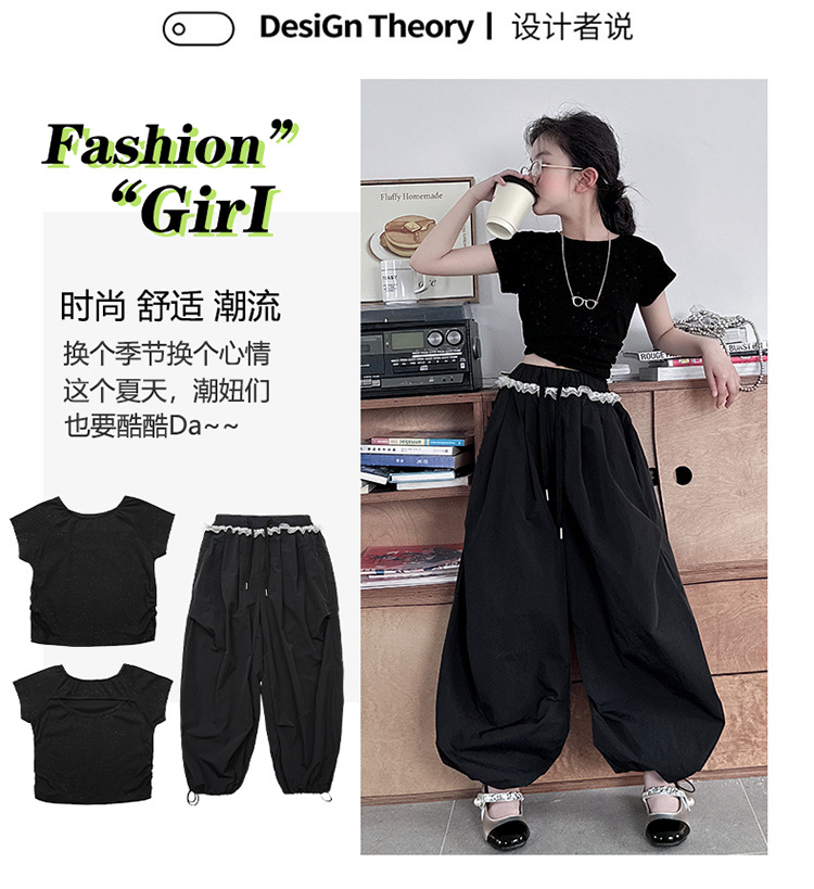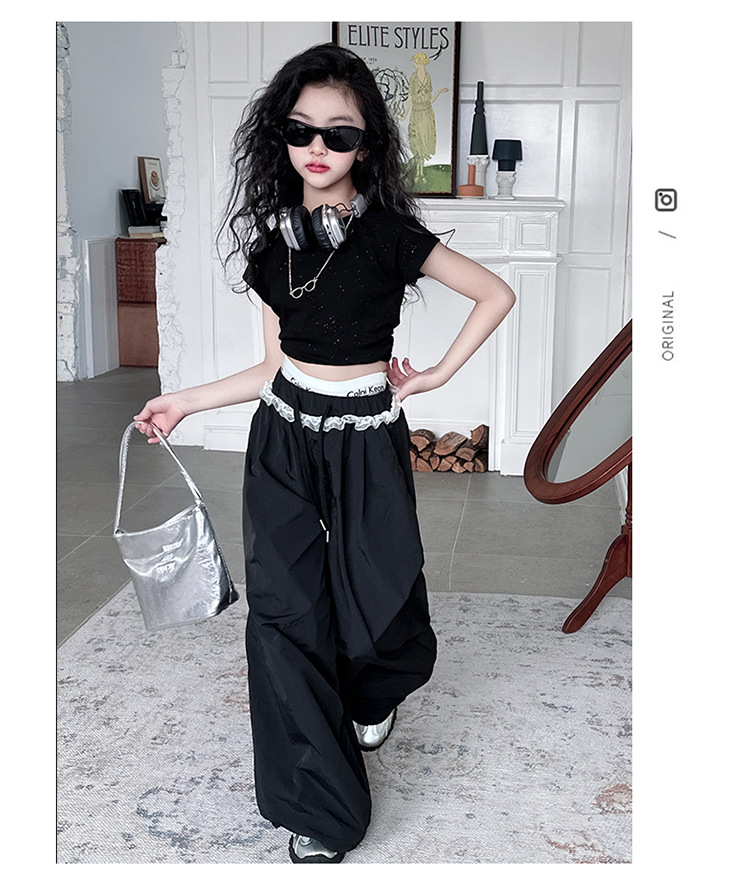 소녀의 여름 반팔 세트 2025 새로운 한국 스타일 소녀의 서양식 레이스 레이스 와이드 레그 바지 투피스 유행 세트