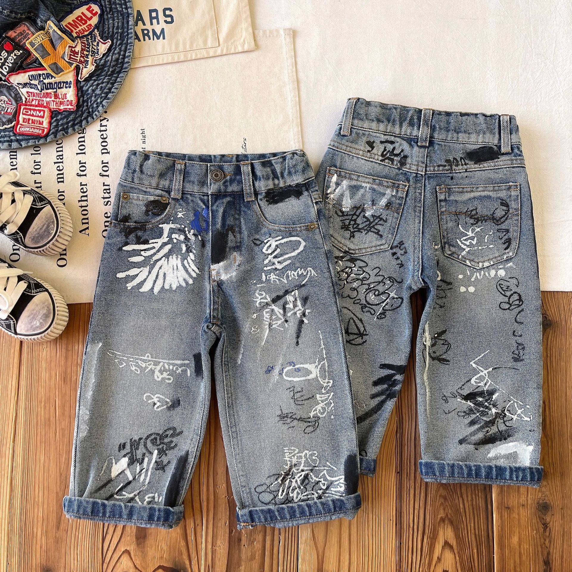 [재고] 일본 아동복 봄과 여름 중 고대 어린이 손으로 그린 낙서 스트레이트 청바지 바지