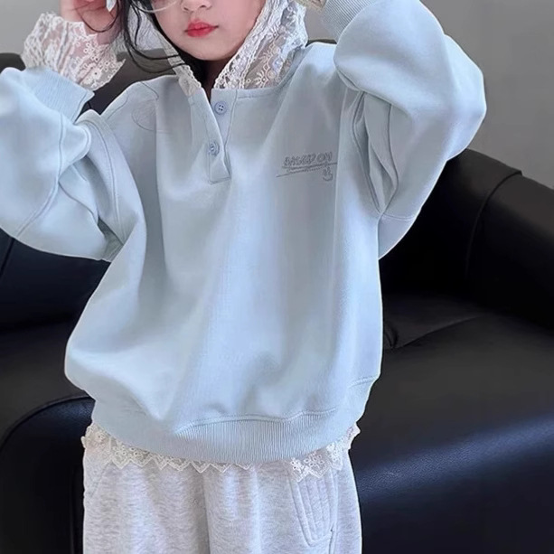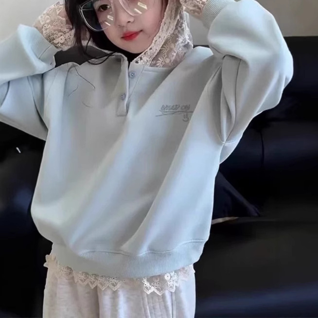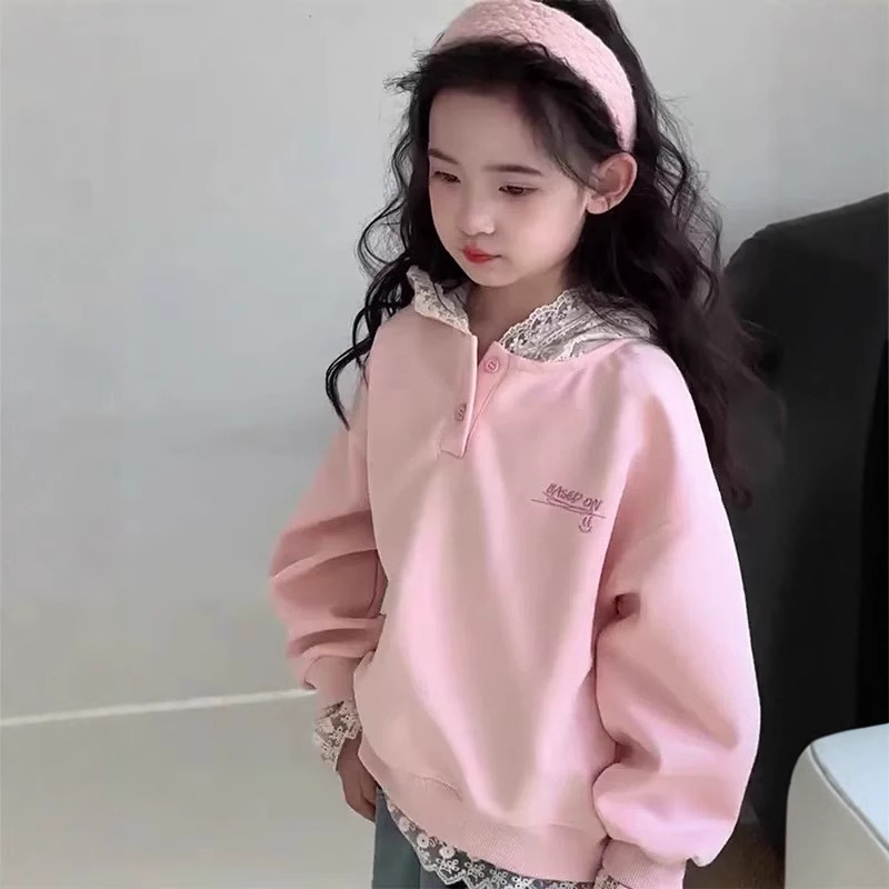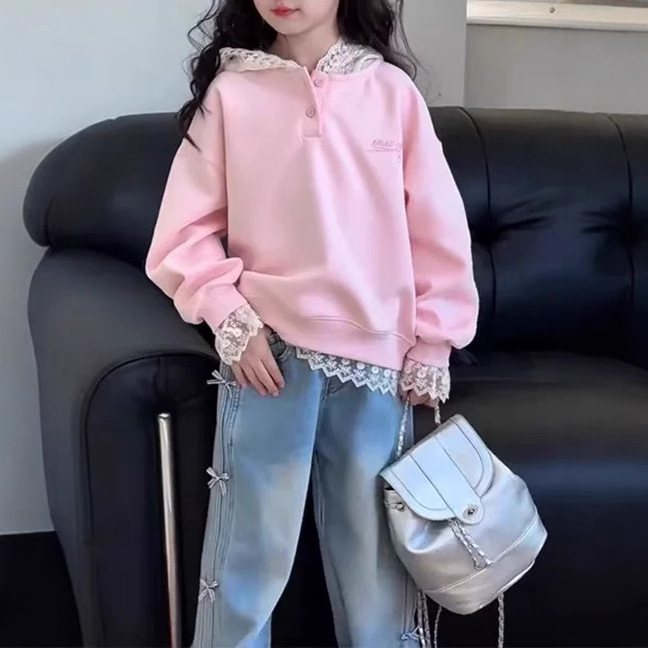 소녀 스웨트 셔츠 2025 봄 새로운 후드 스티칭 레이스 탑 웨스턴 스타일 봄과 가을 소녀 학생 긴 소매