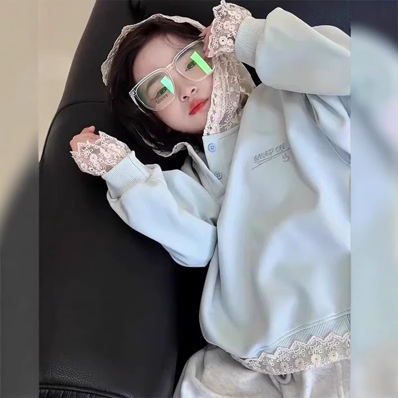 소녀 스웨트 셔츠 2025 봄 새로운 후드 스티칭 레이스 탑 웨스턴 스타일 봄과 가을 소녀 학생 긴 소매스토어 가기